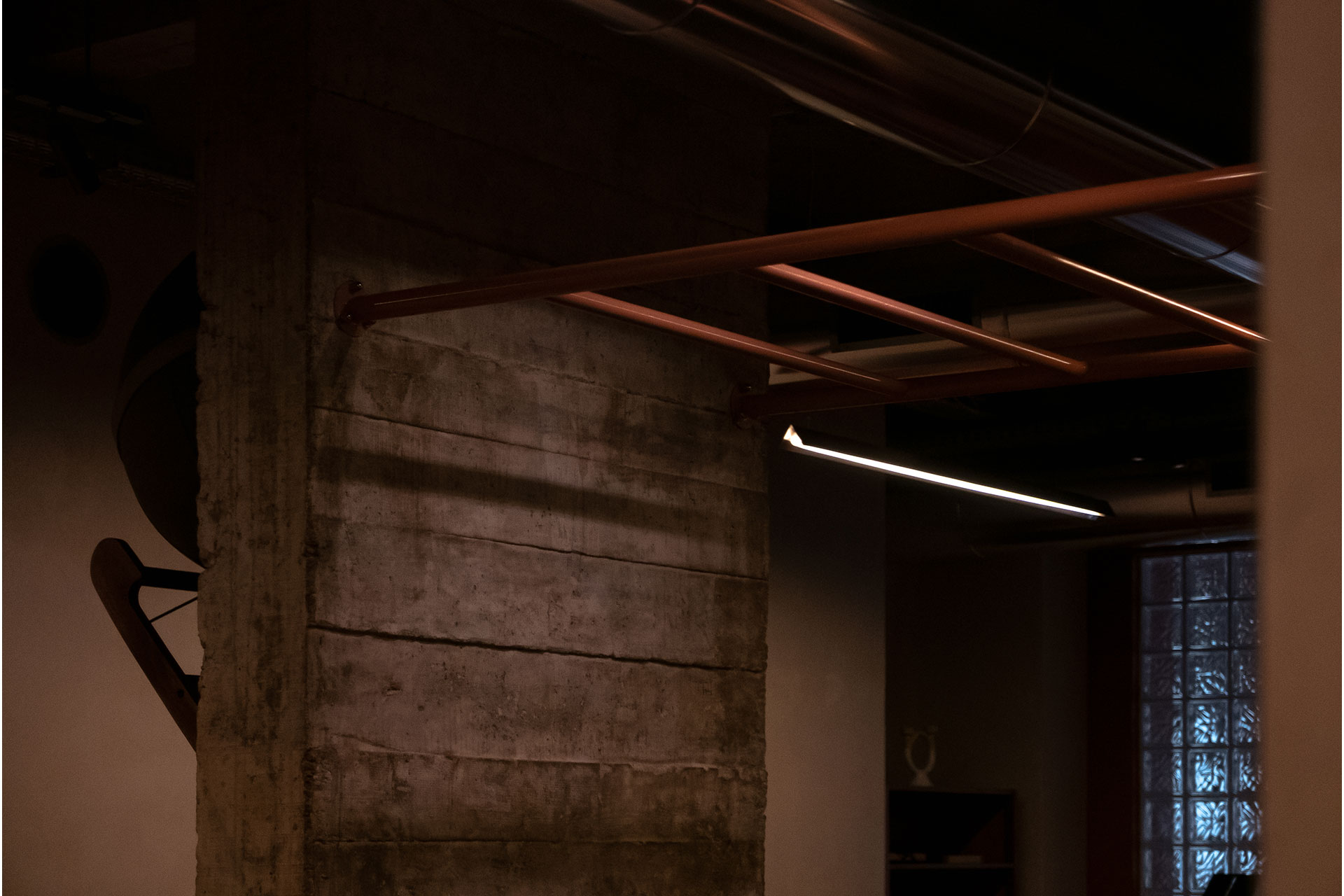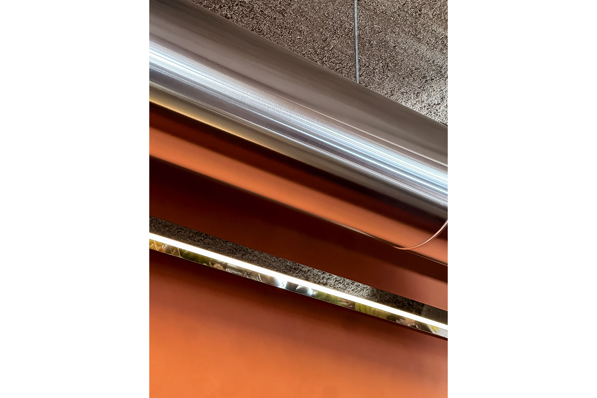 The signature element is a bespoke system combining high-quality linear diffused light with chrome-plated metal sheets bent by local artisans. This fixture became the spatial thread throughout the main areas, camouflaging itself by reflecting adjacent surfaces, varied ceiling textures, and wall finishes, creating a dynamic interplay between light source and environment.