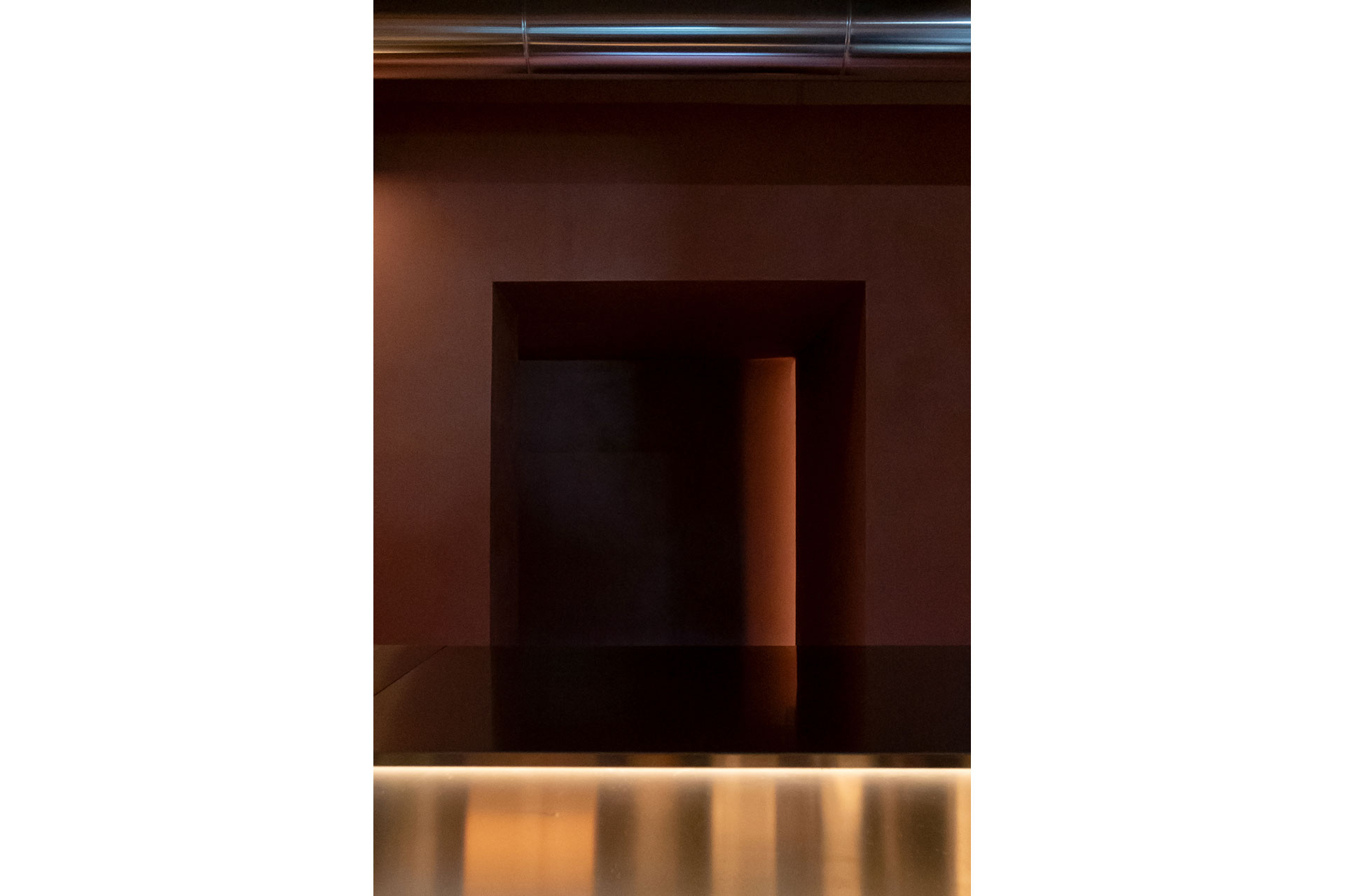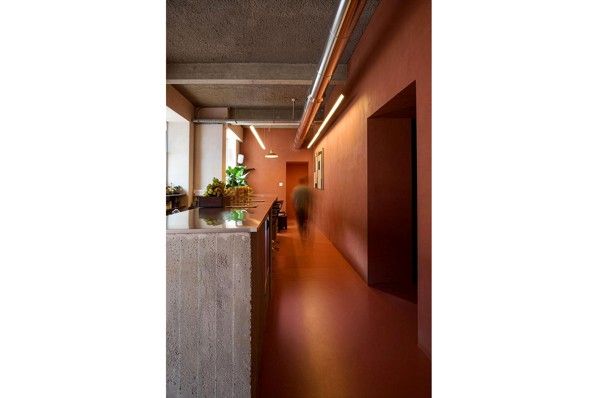 The Juicery functions as a transient space between aimara’s sanctuary and Lisbon’s streets. During daytime, brighter lighting complements abundant natural light, preparing visitors for the more subdued members’ areas beyond. At night, this relationship subtly reverses: artificial lighting reduces, allowing the Juicery to become comparatively darker than the members’ areas, easing the transition back toward exterior darkness.