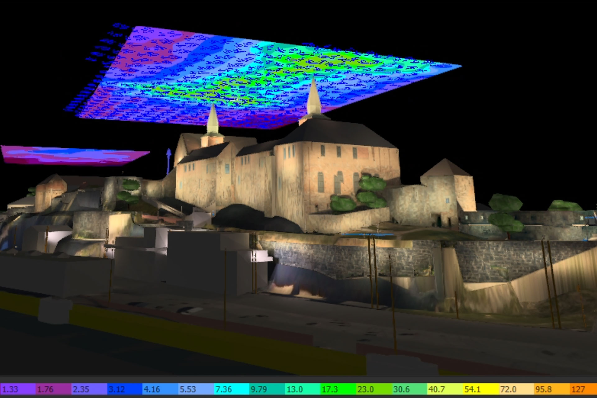 In total, approximately 20,000 square metres of stone wall are illuminated using 250 luminaires, connected through a wireless control system. Existing cabling was reused wherever possible, reducing material consumption. Overall, the luminaires achieve an average efficacy exceeding 70 lm/W, and calculations show an estimated annual energy reduction of 58%.