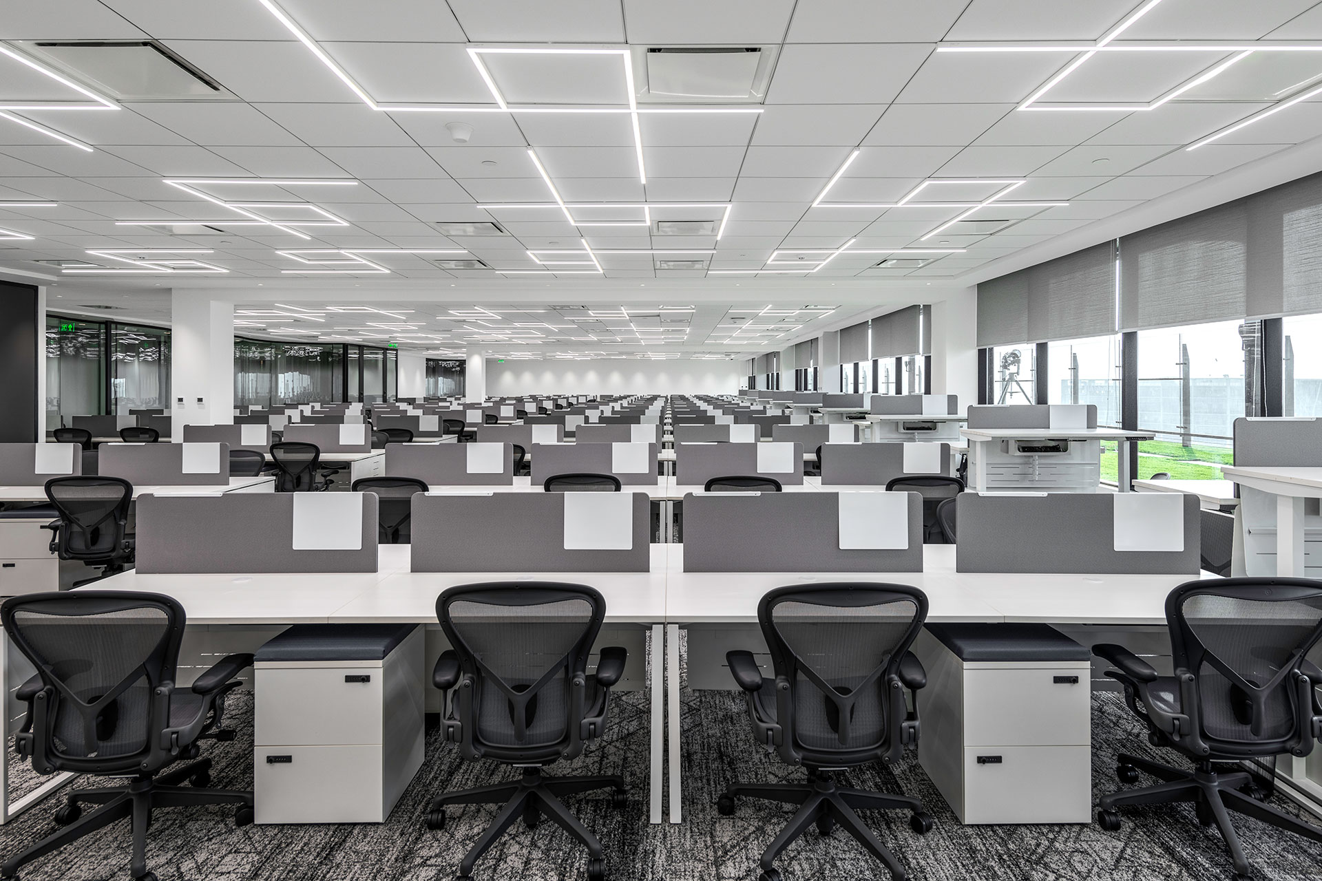Technical coordination was critical. The grid integrates seamlessly with HVAC systems, sprinklers, and acoustic panels, maintaining clean ceiling planes despite the density of services. Reflectance studies and detailed alignment strategies ensured that the lighting pattern reinforces architectural order rather than competing with it. The result is a visually disciplined environment that supports productivity while remaining flexible.
