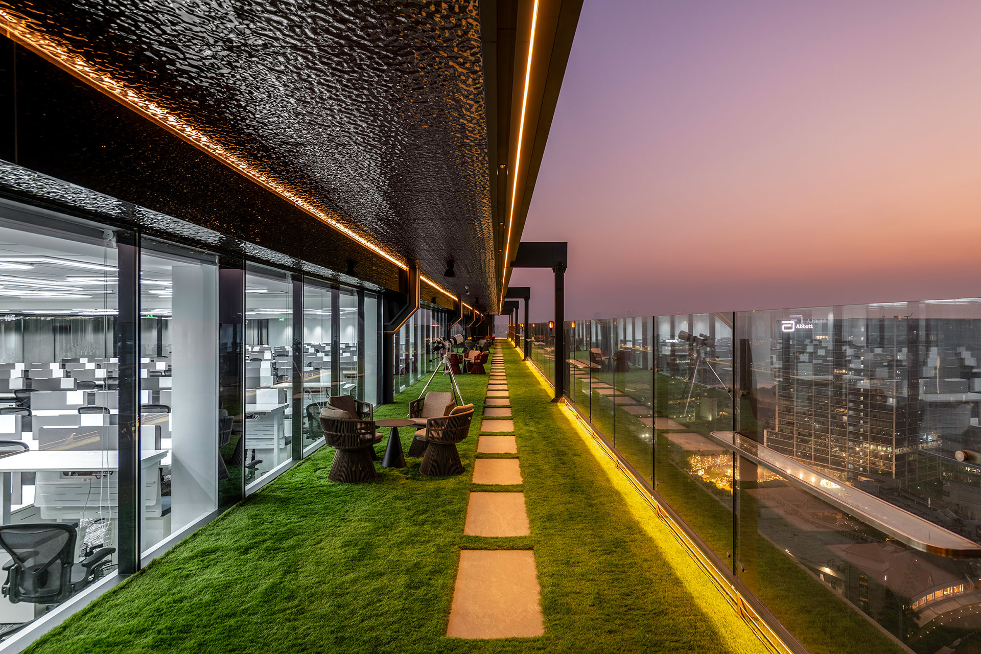 Layered lighting strategies continue through transitional corridors and social zones, where integrated cove details and sculptural ceiling features define hierarchy and soften movement. On the terrace, warm linear lighting extends the narrative outward, framing circulation paths against the Mumbai skyline and reinforcing continuity between interior workspace and exterior respite.