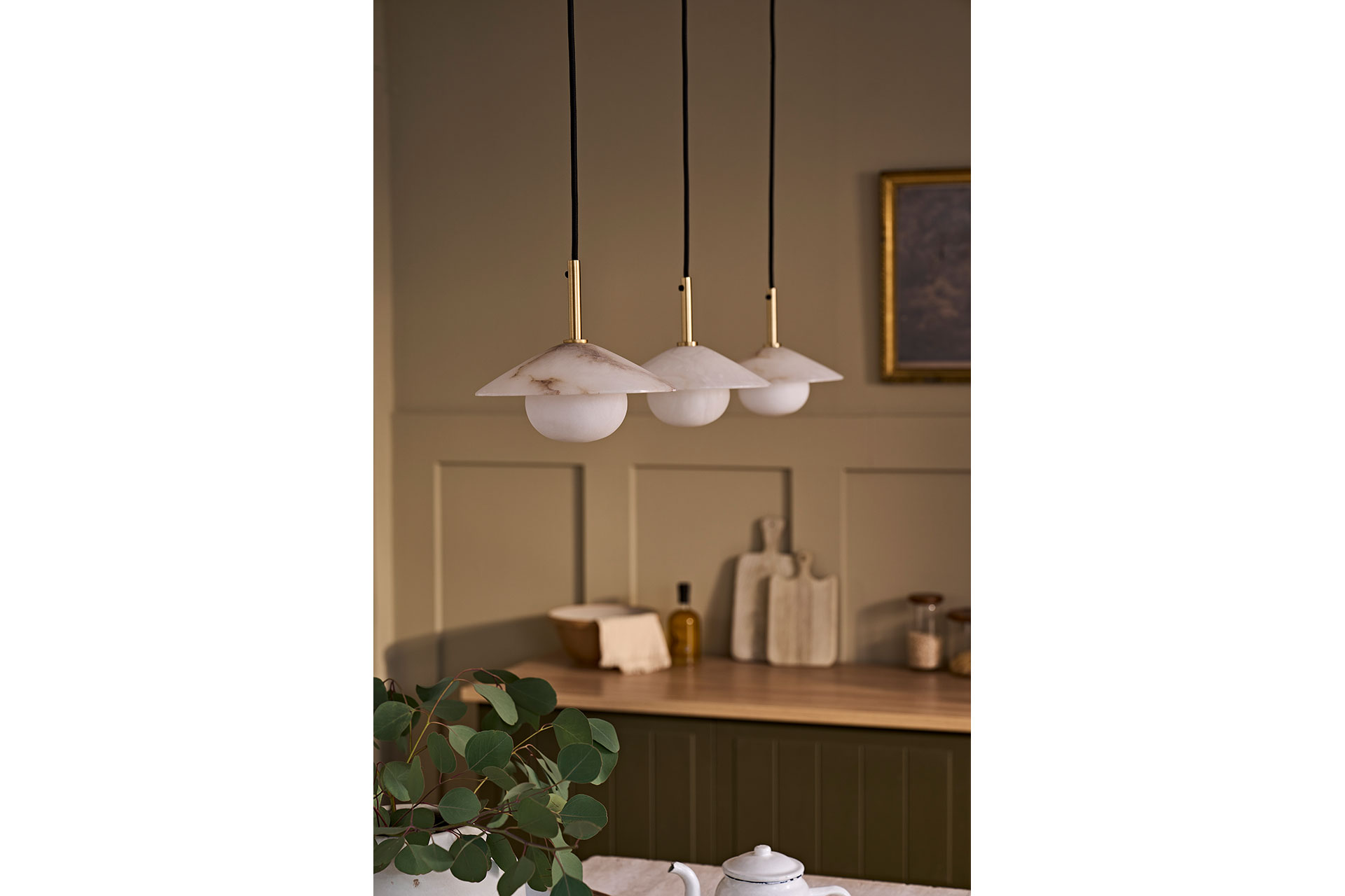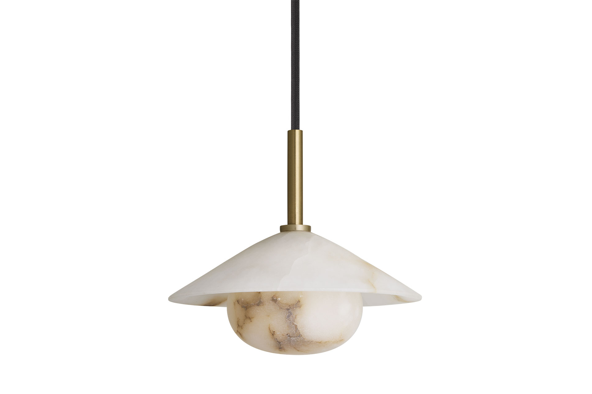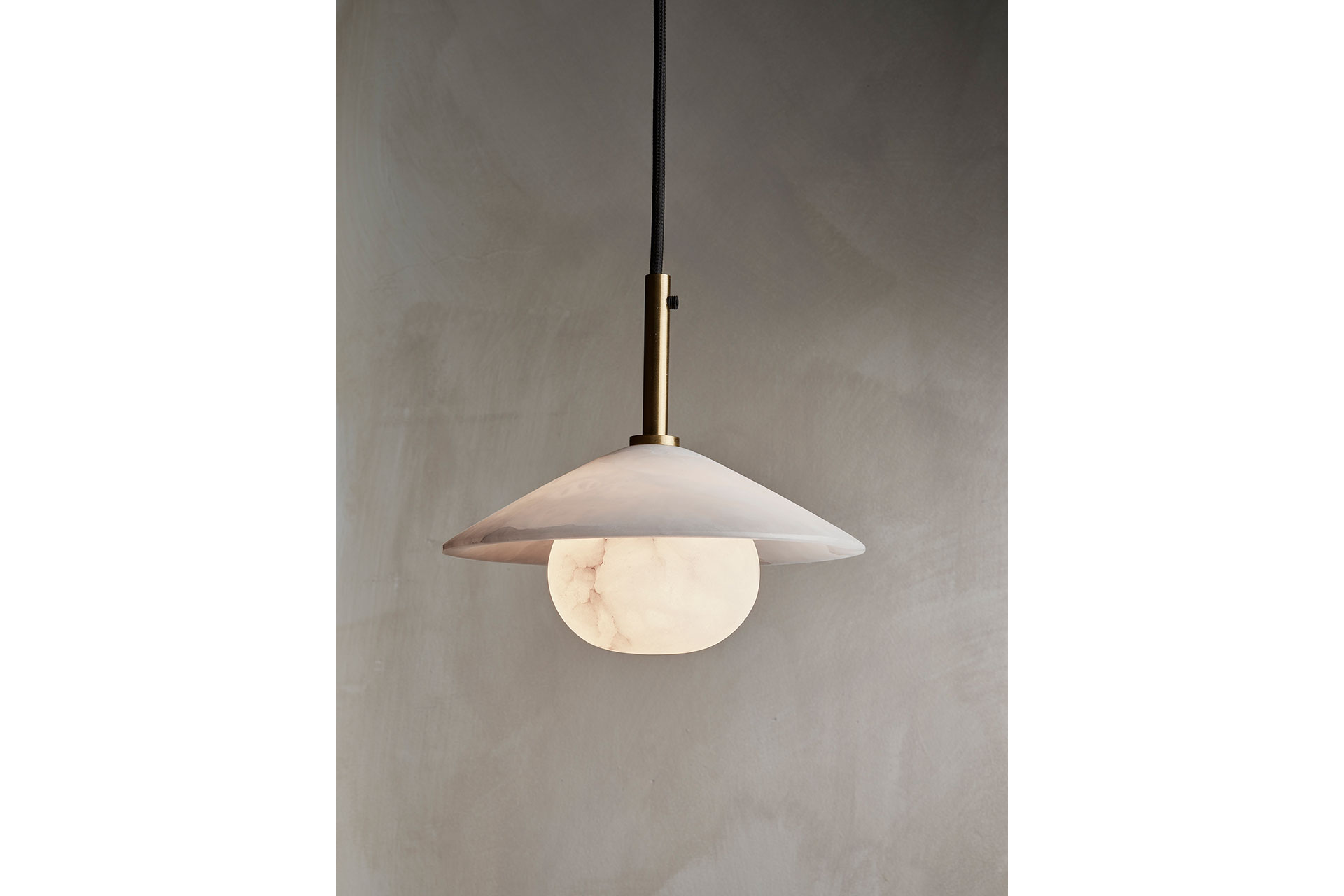 Brass accents hold a translucent alabaster cone shade, suspended above a softly glowing alabaster globe