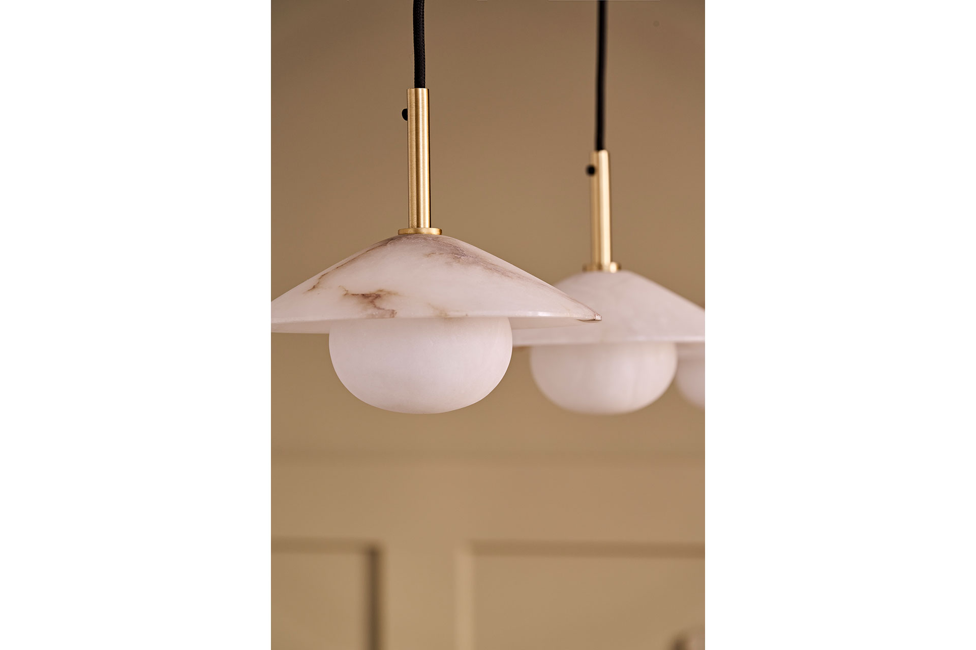 Celebrated in architecture and sculpture for centuries, alabaster is renowned for its unrivalled ability to diffuse light from within, allowing it to permeate the surface like sunlight through a cloud. The subtle veining and tonal variation give each pendant a living quality, creating layered illumination that glass or synthetic materials cannot replicate. No two pieces are the same, with unique marbling and colourations offering character while its soft glow fosters calm, inviting interiors. This sense of individuality aligns closely with our handcrafted production process, where each light is assembled, finished, and checked by hand. Whether the uniqueness comes from the material itself or from the craft of the person working with it, every piece carries its own quiet character.