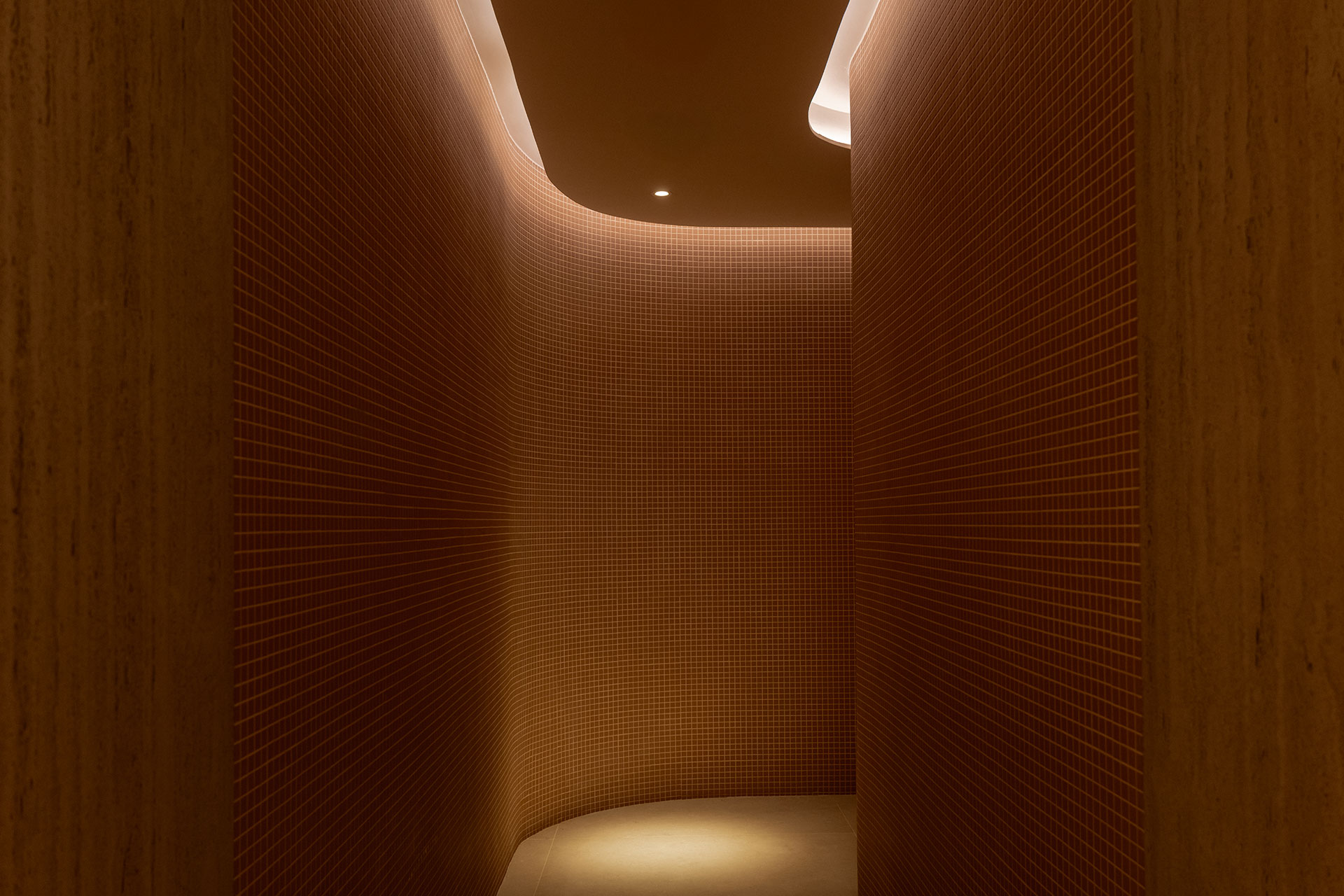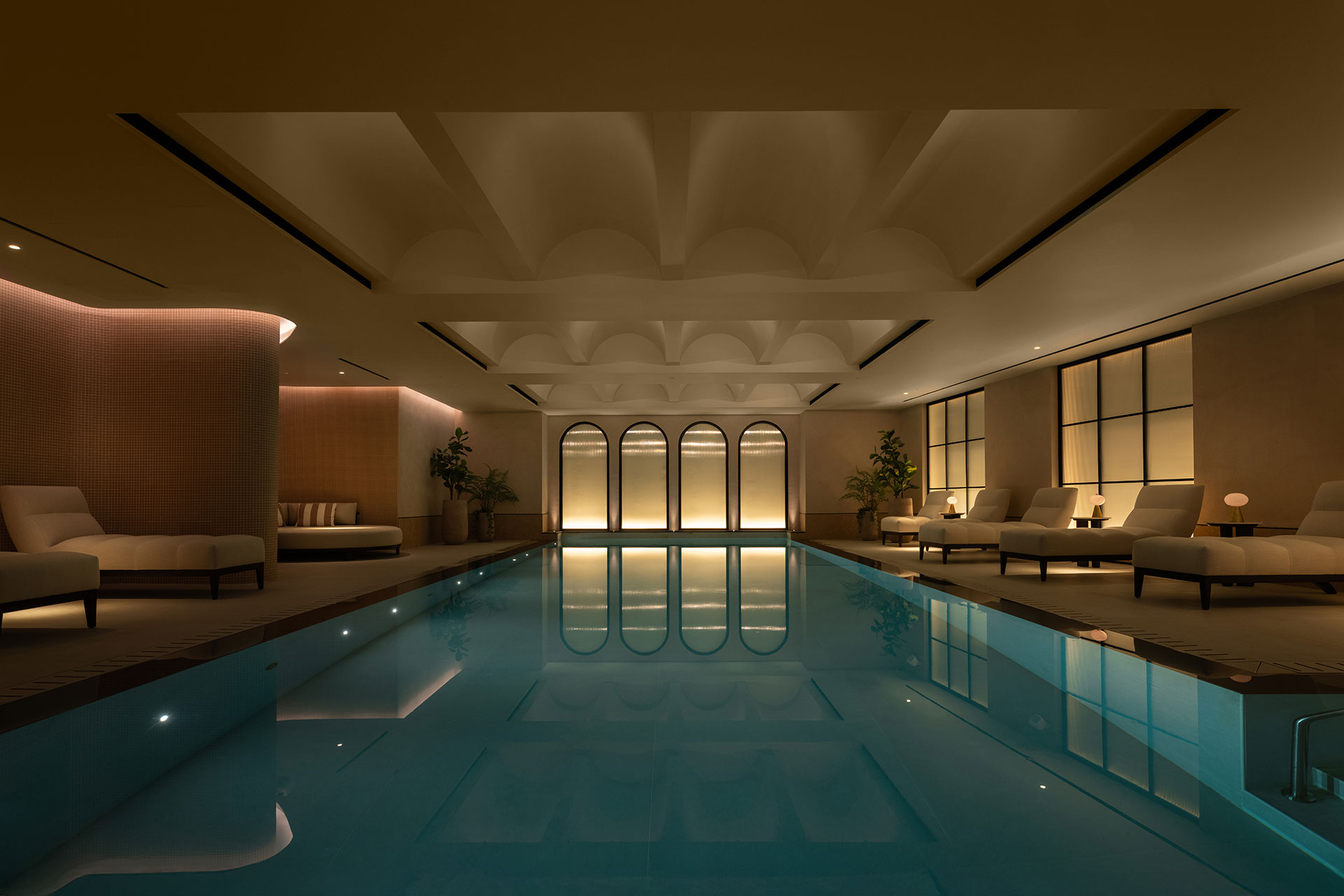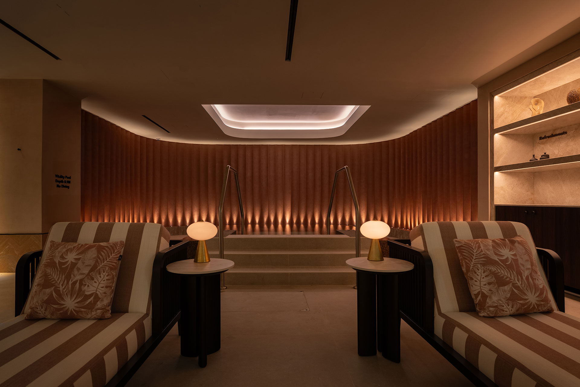The lighting strategy was conceived as part of the guest journey rather than as a purely functional layer. Each spa zone was treated as a distinct sensory environment: warm, low-glare illumination supports relaxation within thermal and treatment spaces, while crisper, higher contrast light reinforces clarity and safety in circulation routes and active areas such as pools. Layered lighting hierarchies — combining concealed ambient light, architectural grazing and selective accent — enhance materiality including stone, mosaic, timber and textured plaster, while maintaining visual calm and avoiding luminaire clutter.
