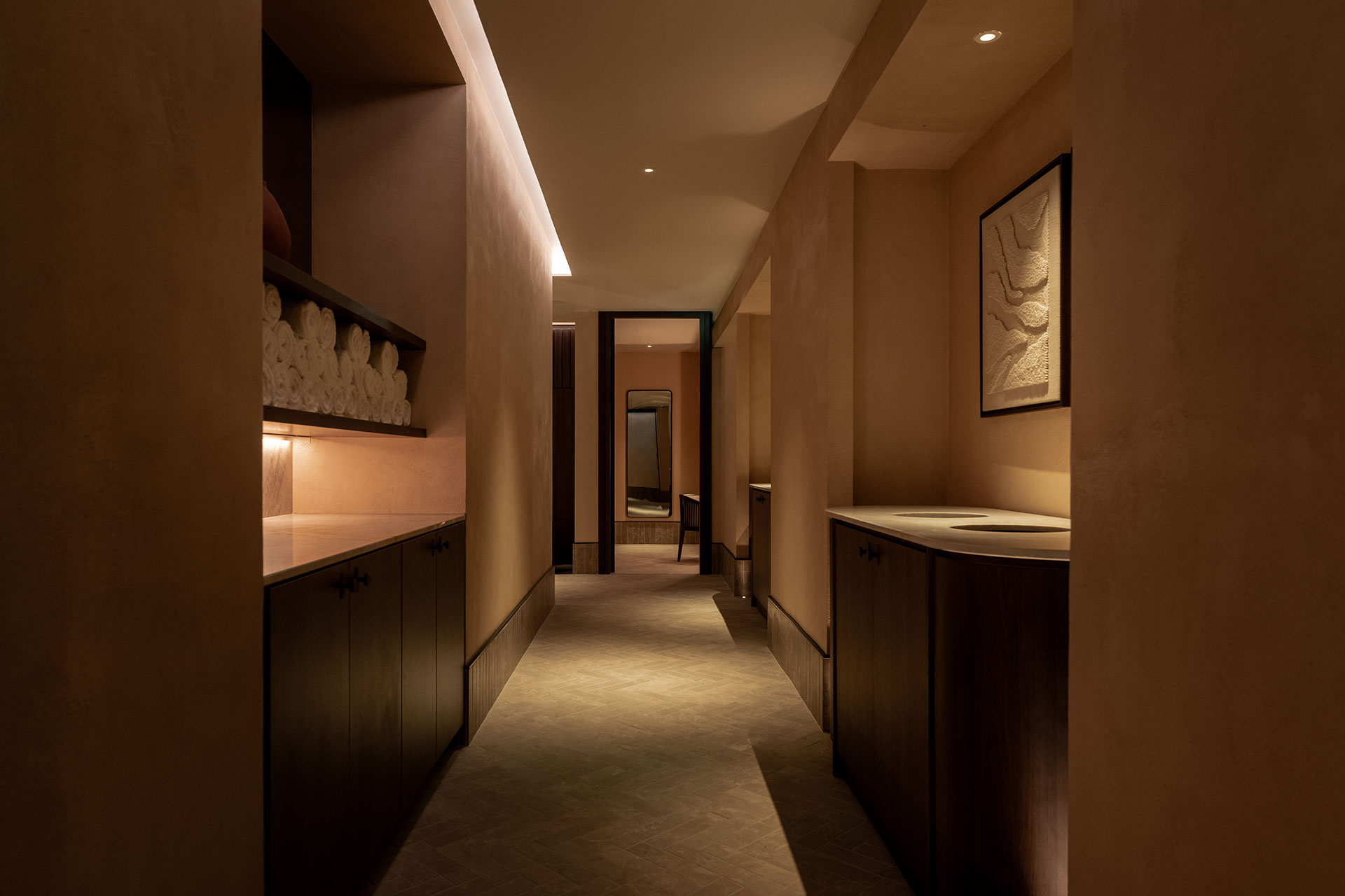Concealment is a consistent principle throughout the scheme. Linear systems are integrated into coves, joinery and architectural details to wash curved surfaces, vaulted ceilings and textured walls. Vertical illumination plays a central role: feature walls are grazed to reveal depth and material richness, vanity units and niches are softly backlit, and architectural elements are articulated to provide rhythm and spatial orientation within an otherwise enclosed environment.