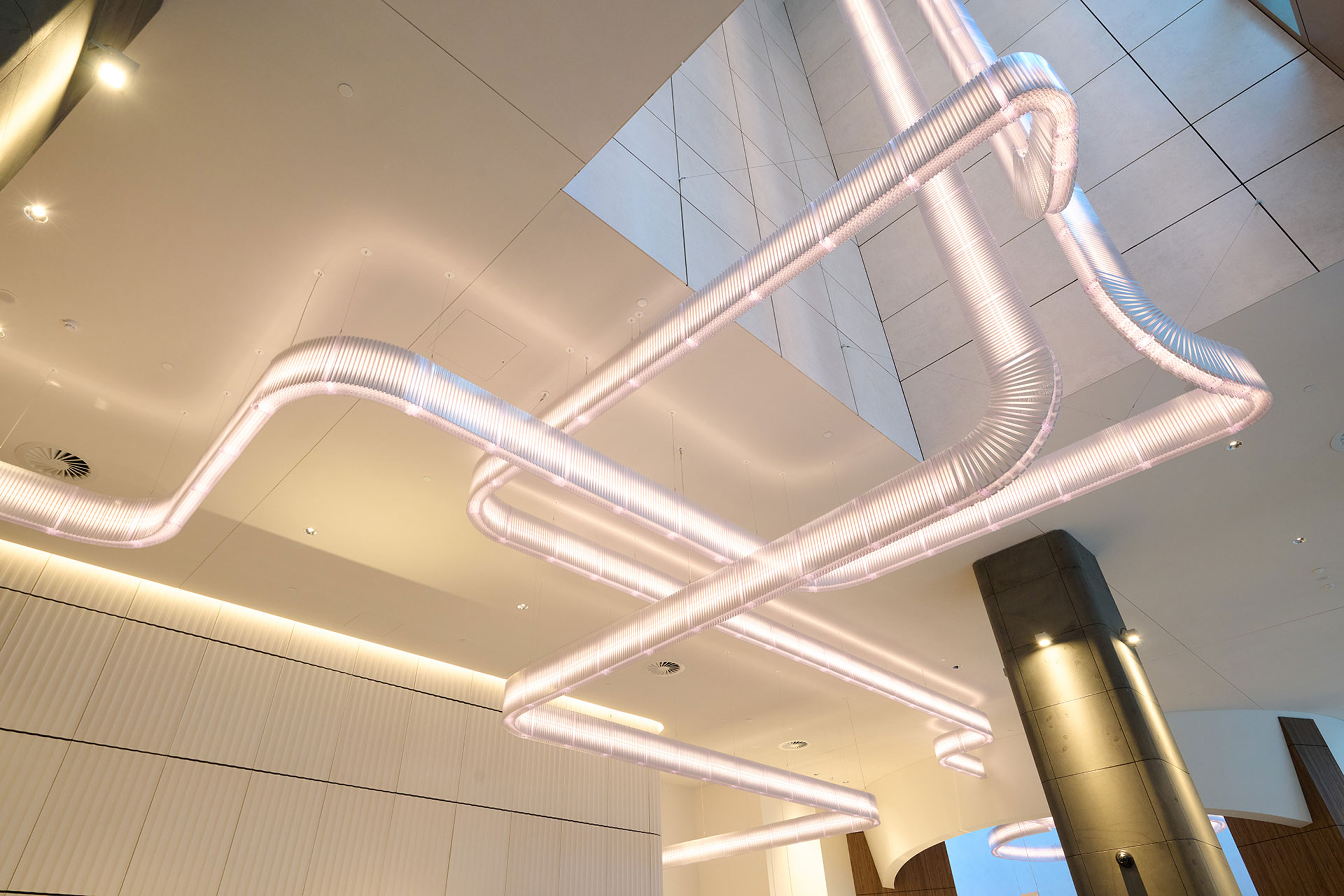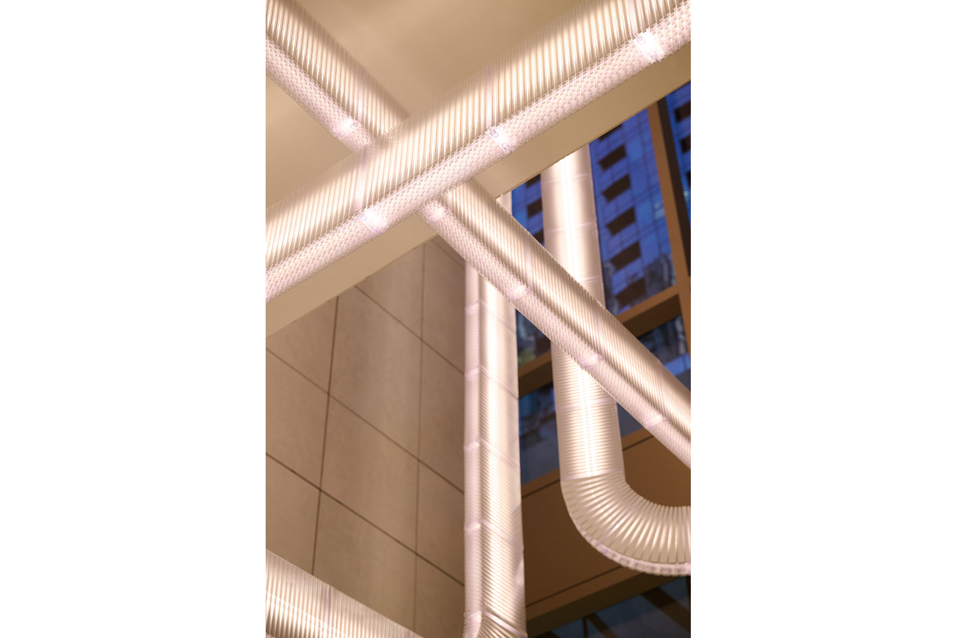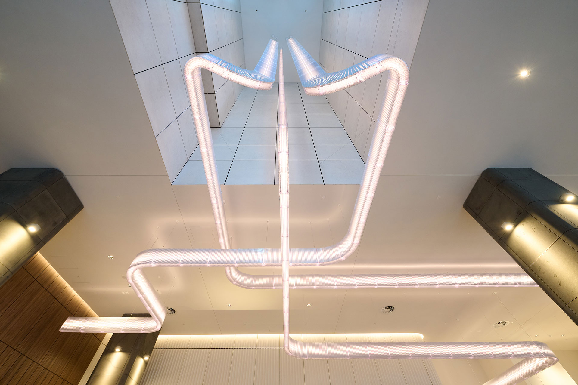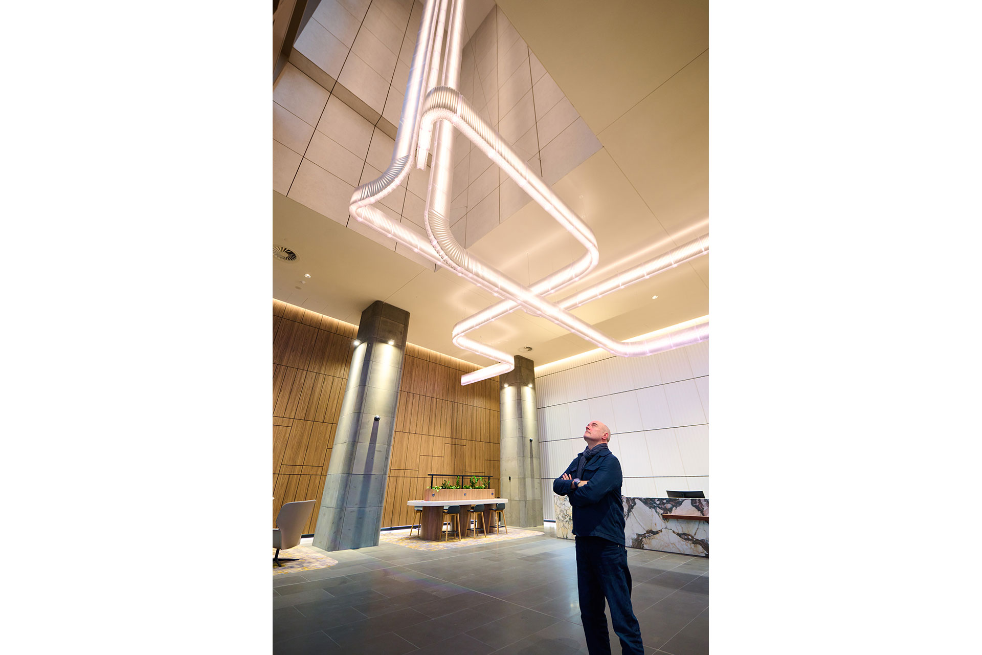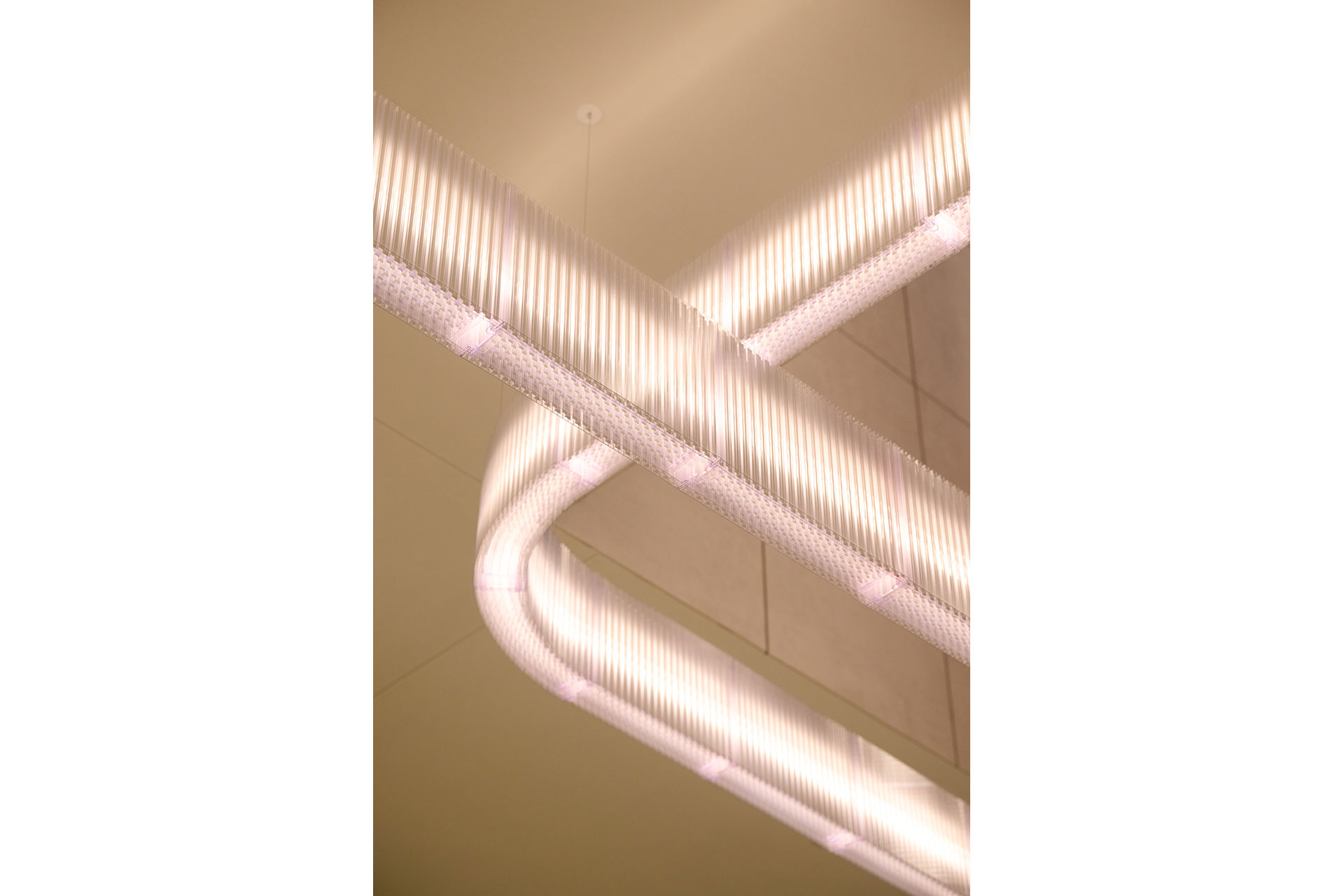 In the café area it extends again, with a circumference of the space and creates a warm contained nook. The glass like structures are 300 metres long in total and the vertical sections are suspended on steel cables secured at the very top of the lightwell ceiling. Multiple drivers power the extensive length of 3000K LED Neon strip, and an internal bus cable ensures there are not dull sections where the LEDs change to another driver.