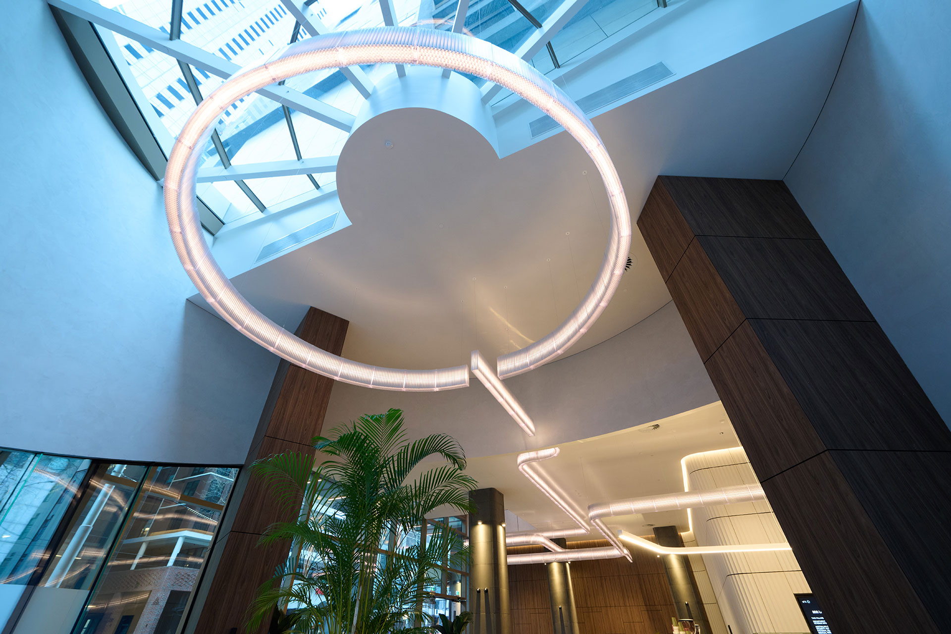 Beacon rises 5 stories into the façade’s lightwell before spreading out like a river of light into the main atrium, creating subtle wayfinding suggestions. The 3 arms offer potential directions, breakout area, lift lobby and Café.