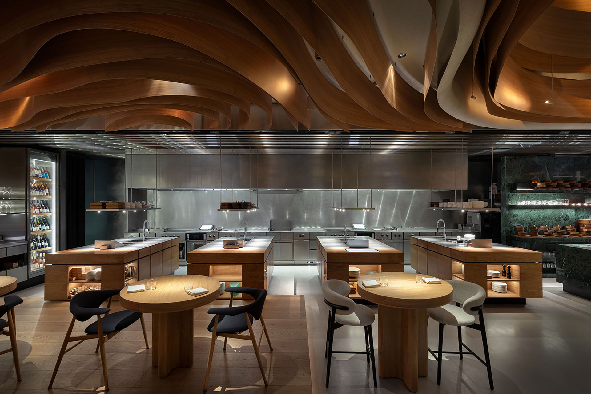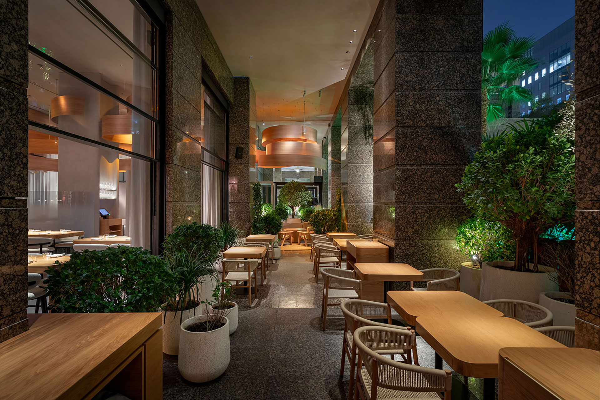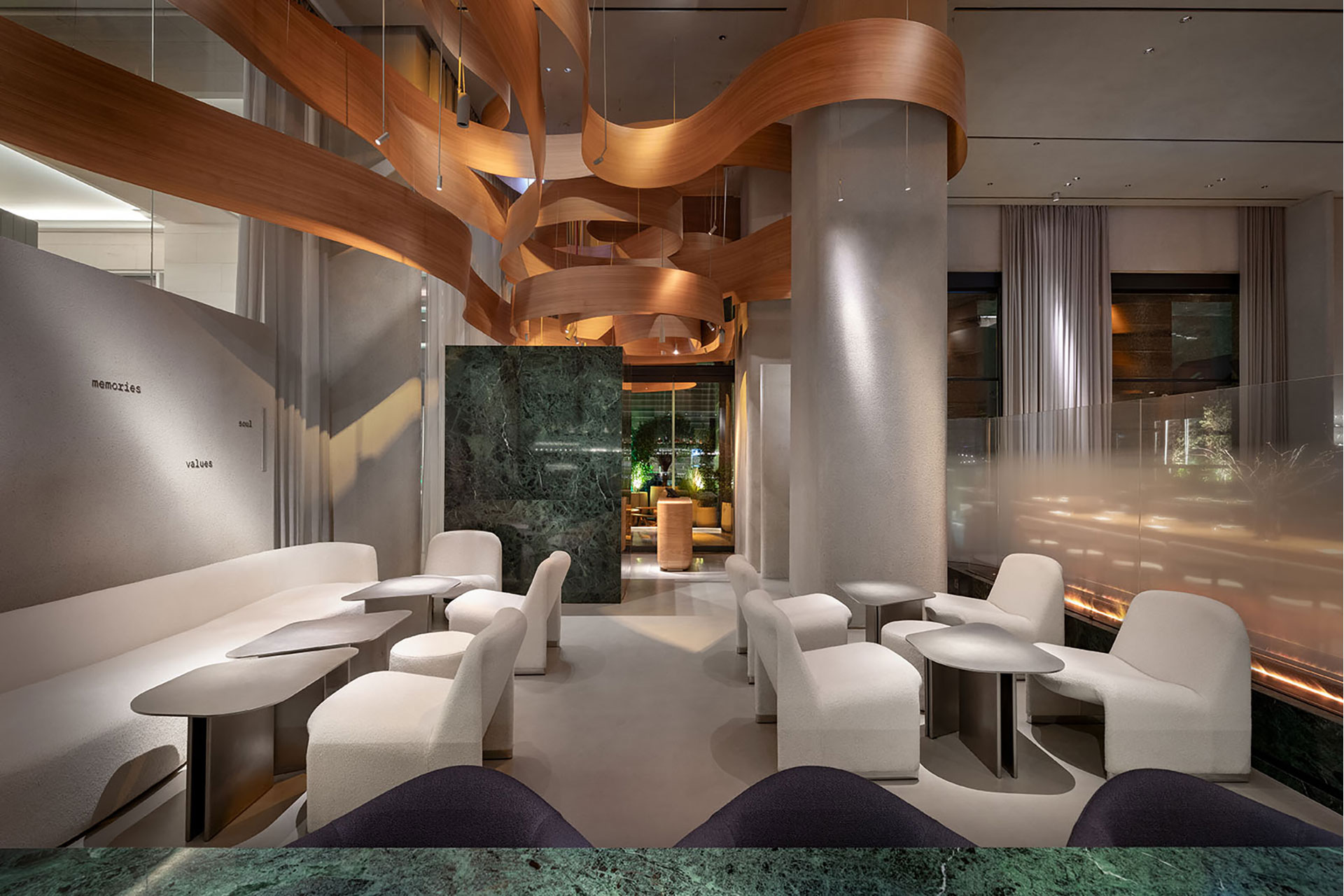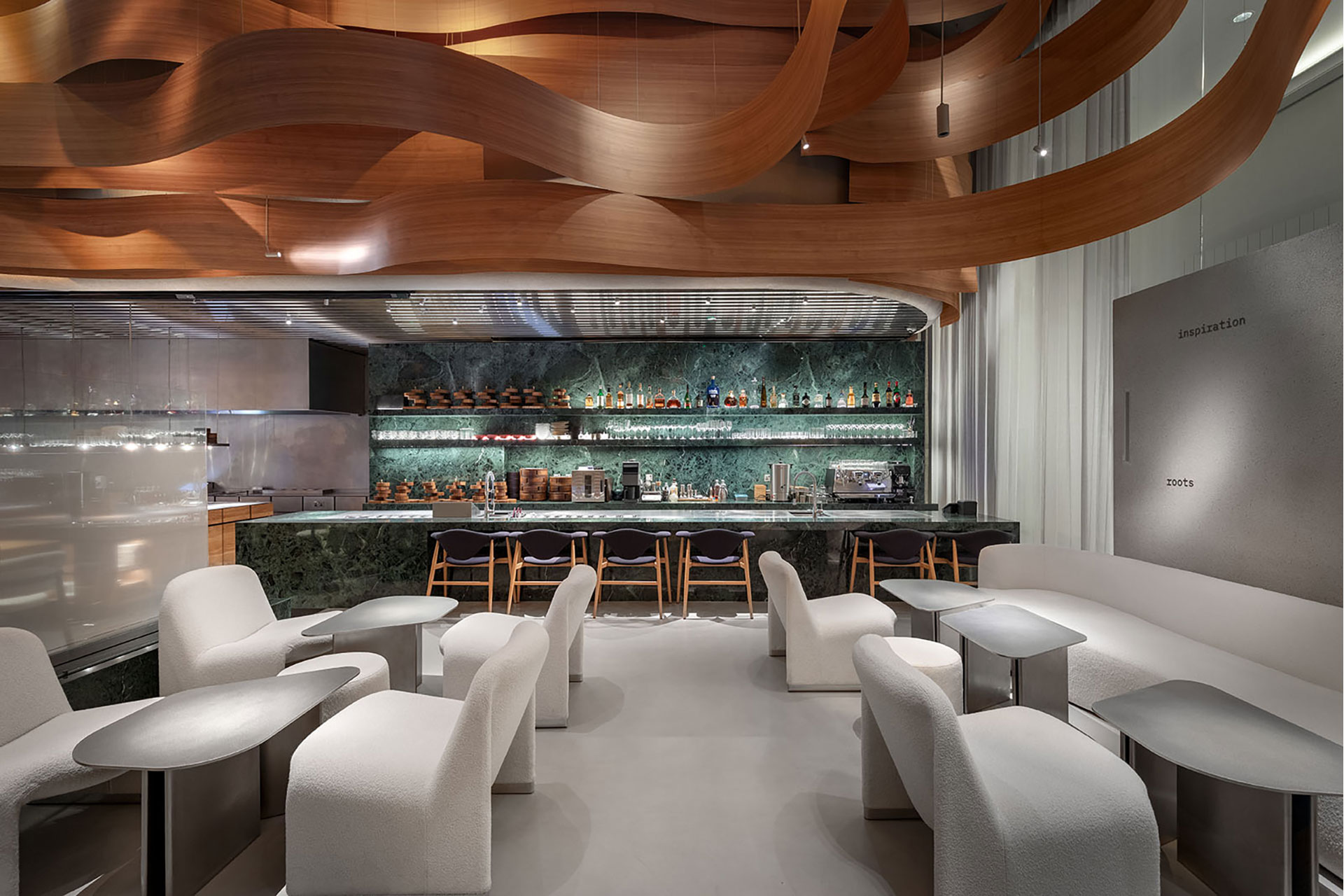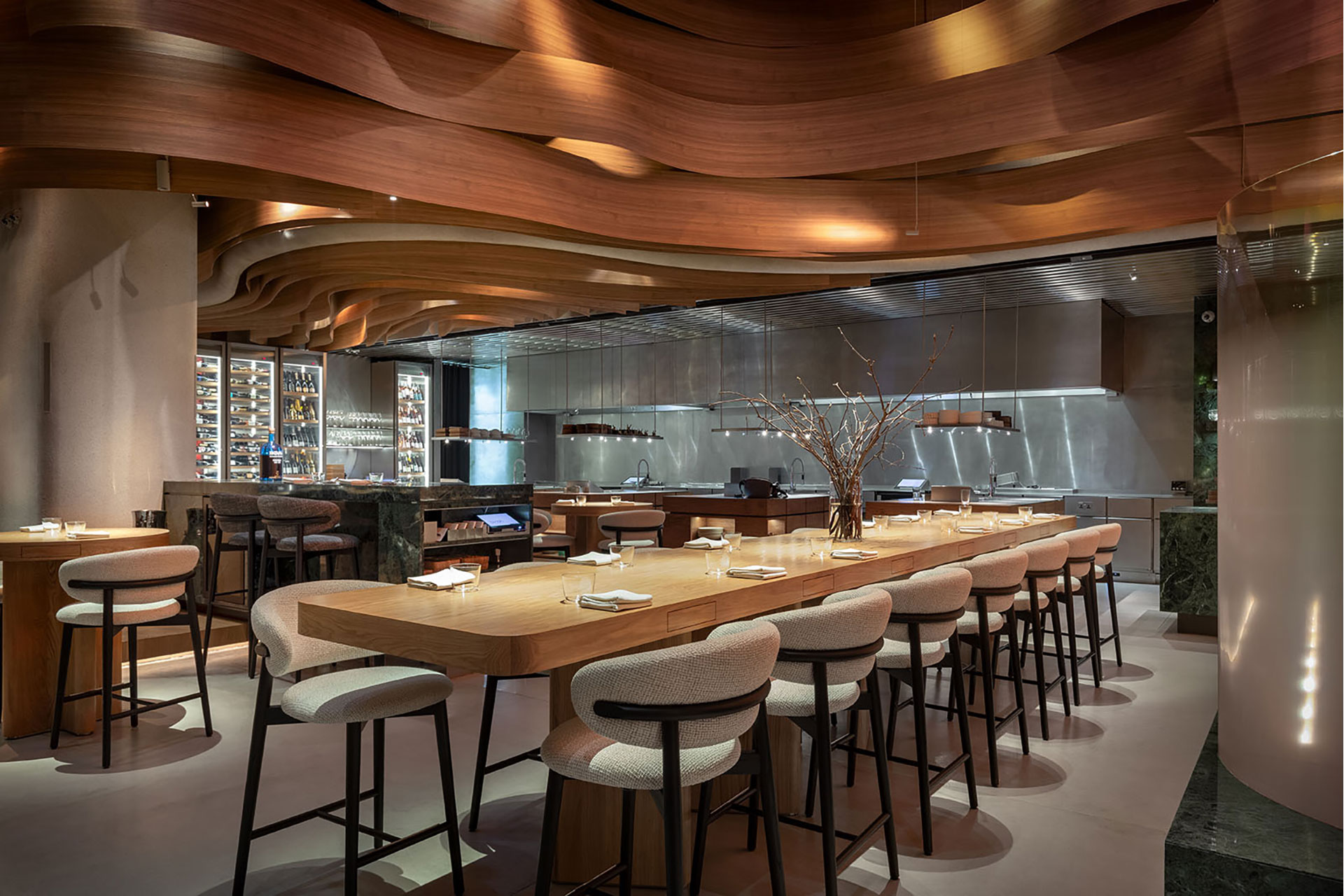 Warm light palette that enhances comfort and sophistication. Lighting scenarios evolve throughout the day, transforming the restaurant’s atmosphere with hidden light sources that highlight textures and key elements. The undulating wooden ceiling is gently illuminated to emphasize its curves and create movement. Custom-made fixtures, integrated with the Cloud Control system, offer flexibility, control, and dynamic ambiance from anywhere in the world