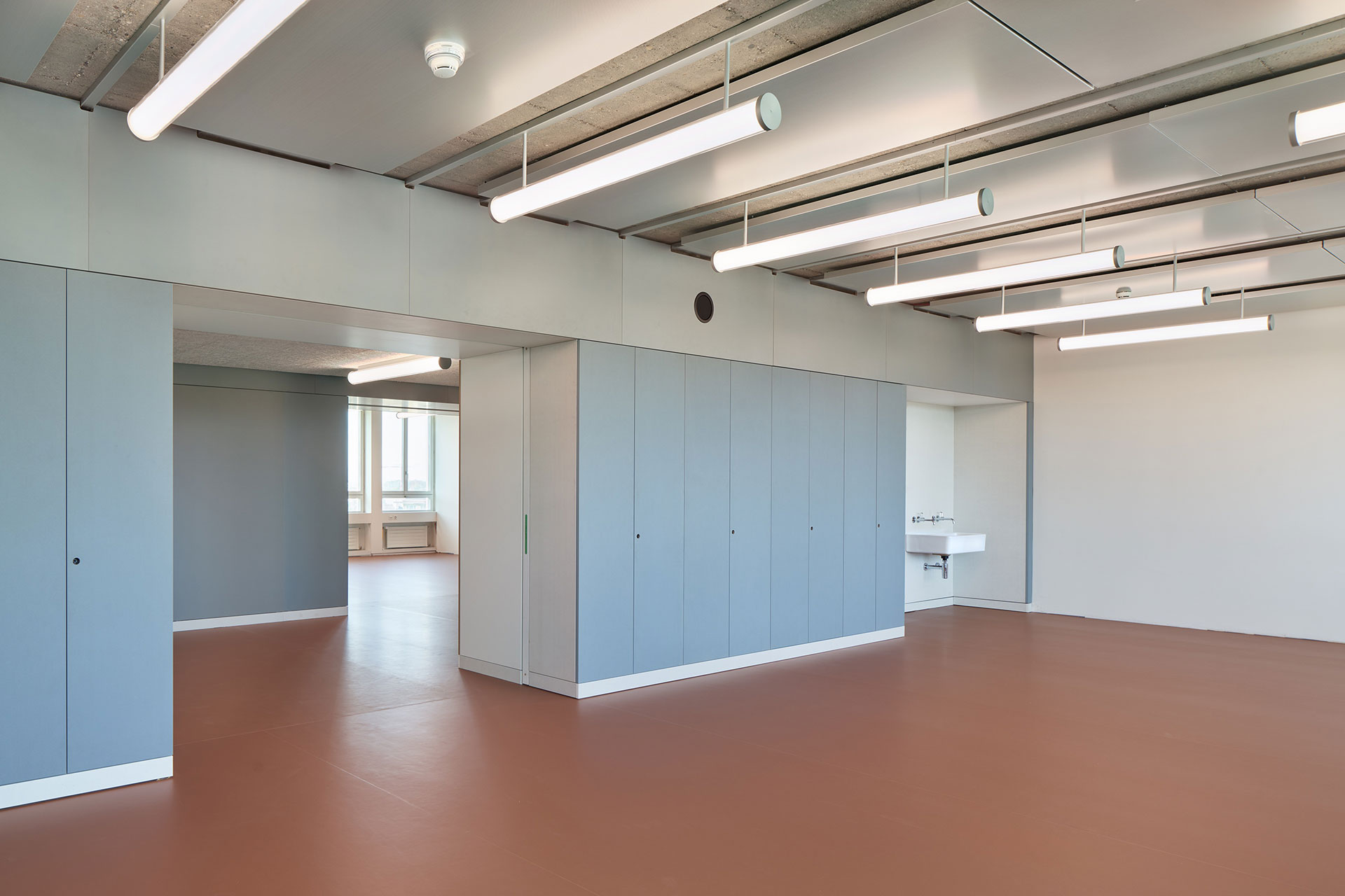 A customized lighting family was developed for the classrooms in the high-rise building. Round tube luminaires are integrated into a continuous ceiling profile between heating and cooling ceiling elements, creating a uniform appearance across all floors, including the canteen. The lighting ensures high uniformity and glare control in accordance with UGR standards, while addressing pedagogical requirements for flexibility and visual comfort. Daylight-dependent control supports concentrated work with minimal energy consumption.