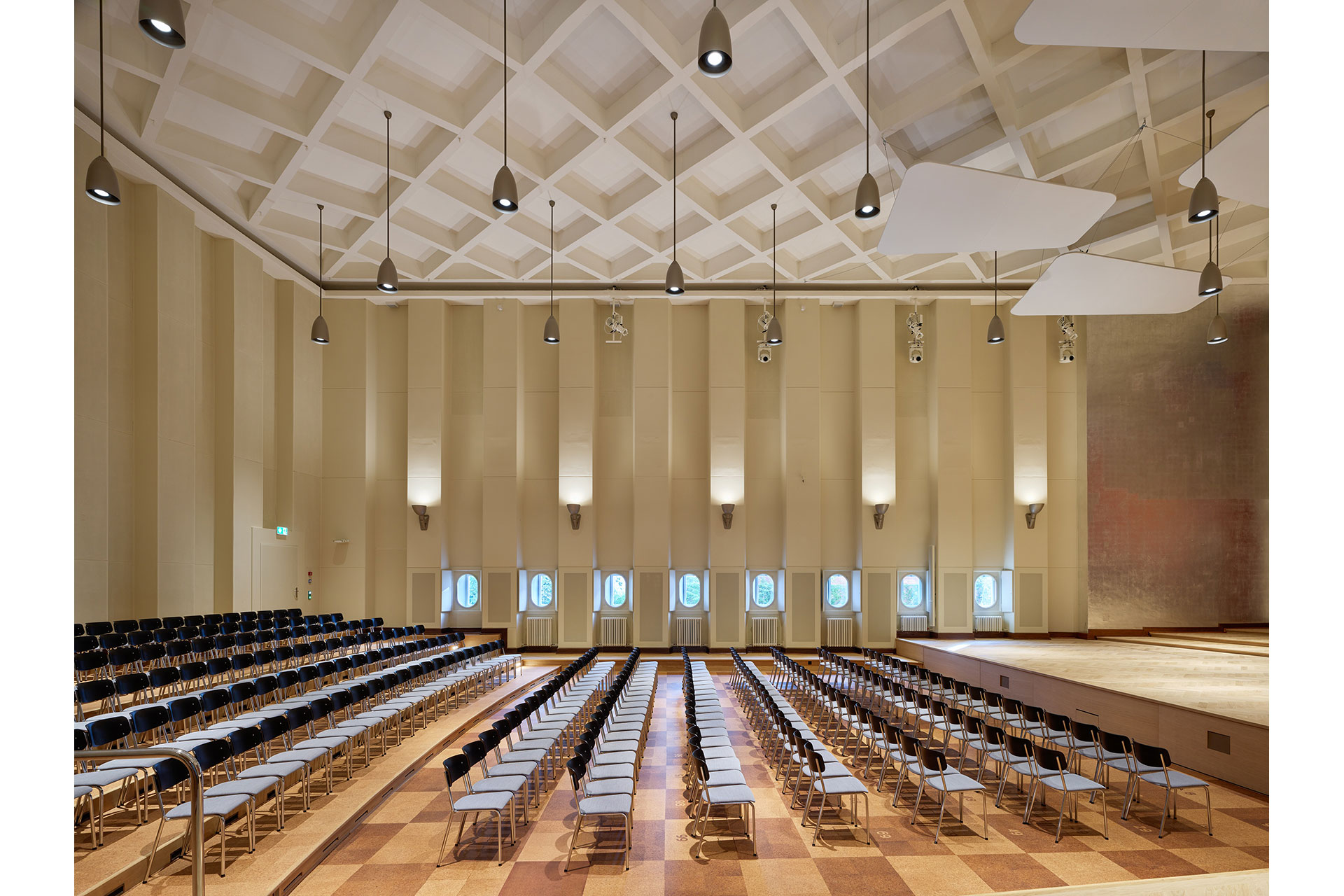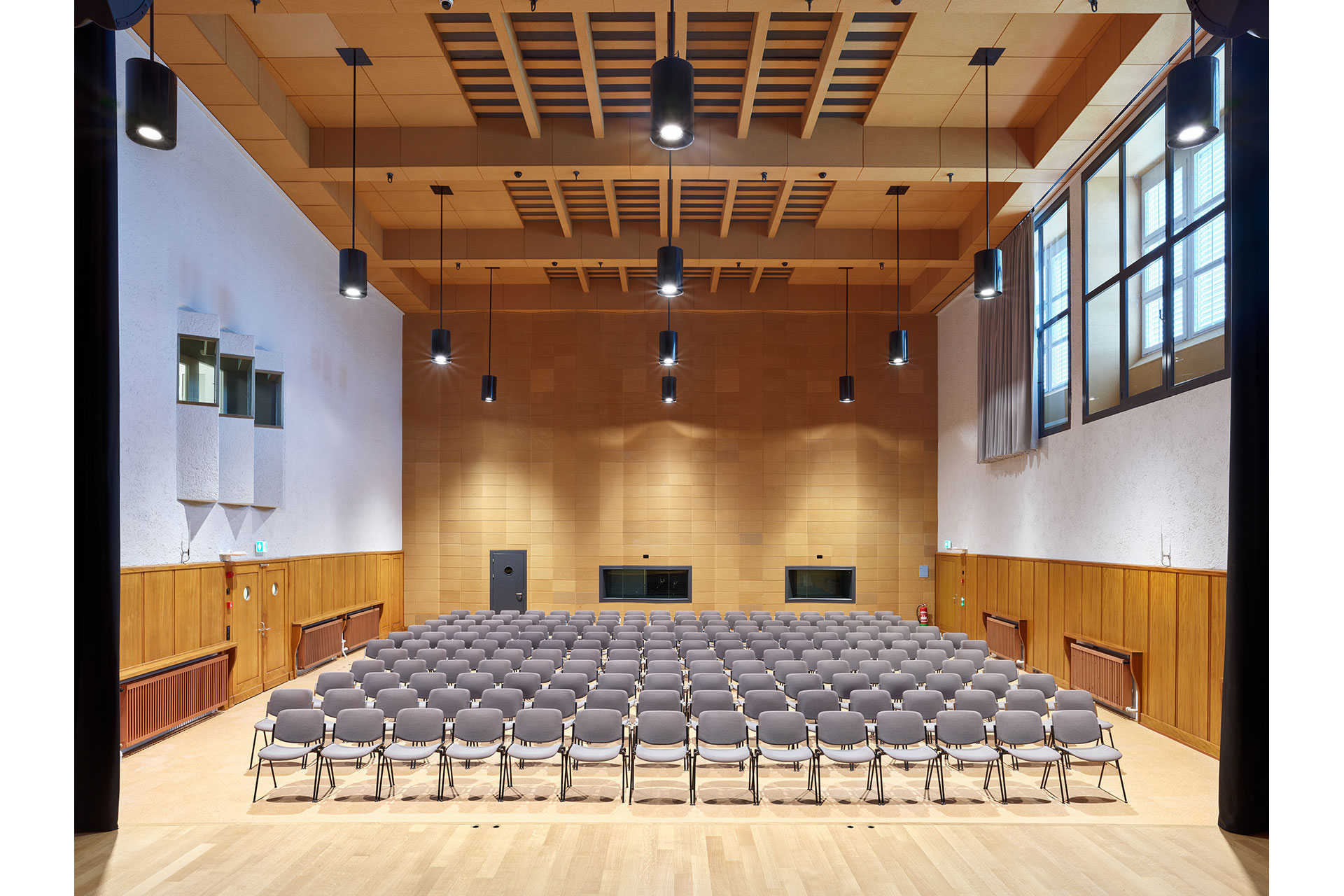 In Studio 2, the hall lighting was also implemented using downlights integrated into bespoke pendant luminaires. There was more freedom in the design for the stage: different light directions, colored light, and effects create versatile scene lighting. A special feature is the lighting bridge integrated into the hall ceiling, enabling optimal front lighting. Fully closable ceiling openings preserve the architectural appearance despite the integration of modern lighting technology.