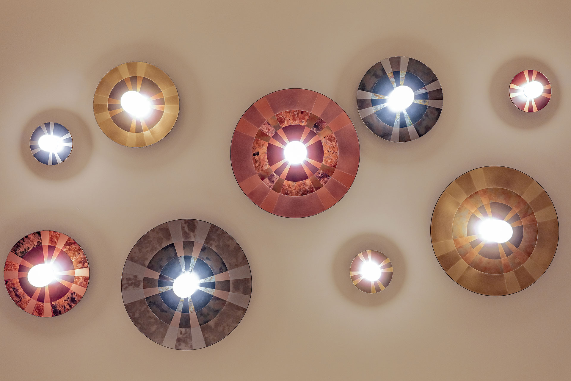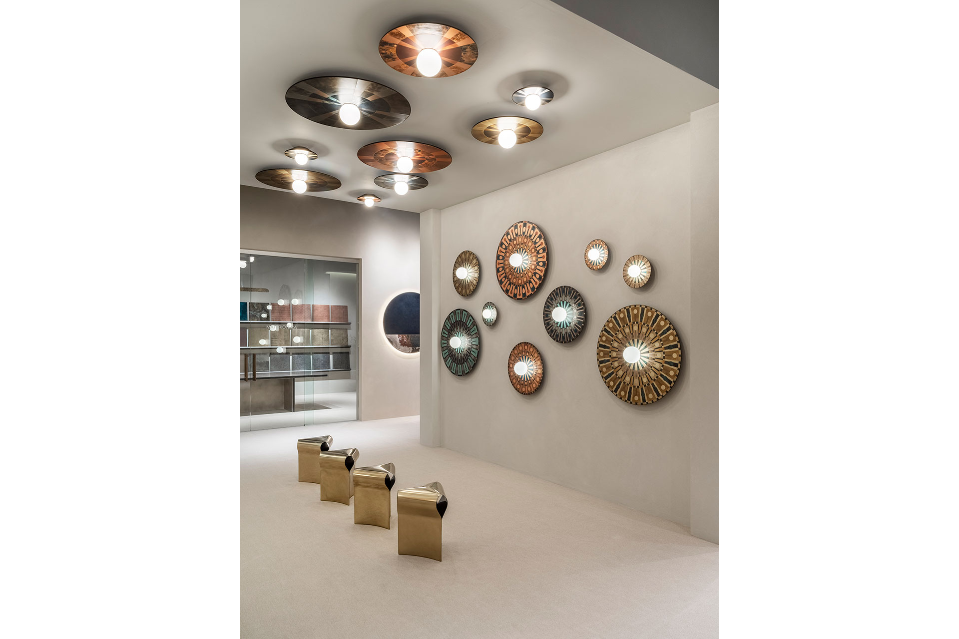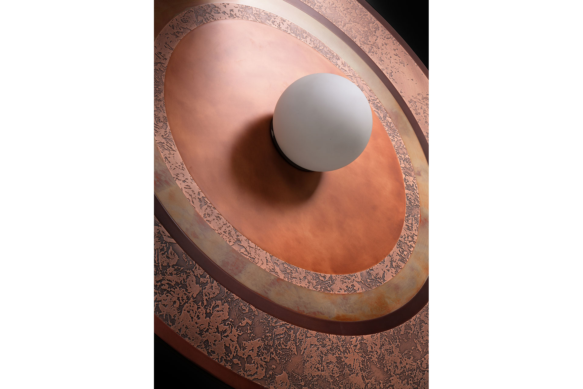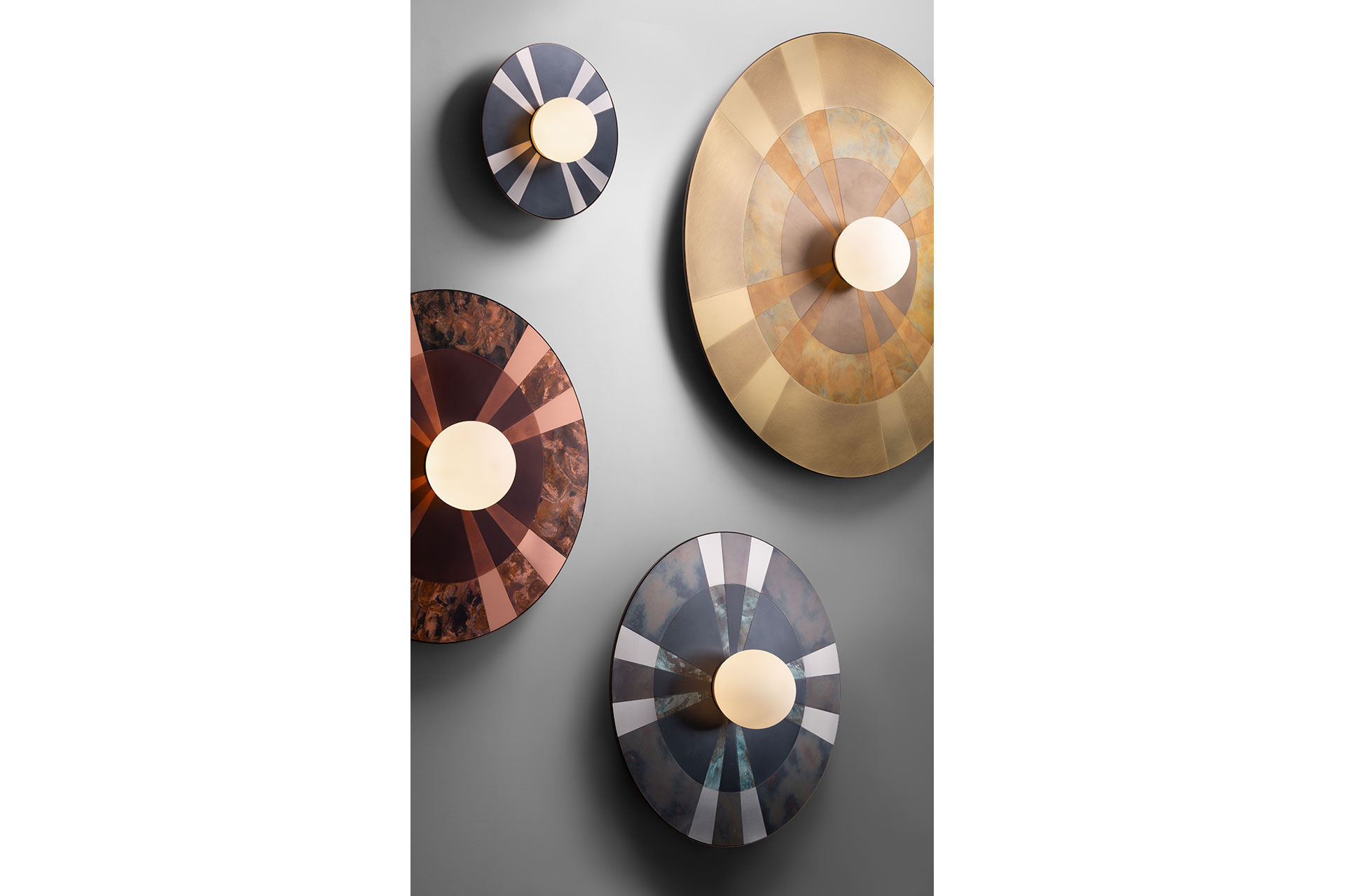 Caleide is a polychrome mosaic of steel, brass, and copper, combining oxidized and brushed finishes. At the center of the disc, a blown opal glass diffuser softens the E27 bulb’s light into a delicate glow, illuminating the matte metal surfaces and enhancing their natural tones and textures.