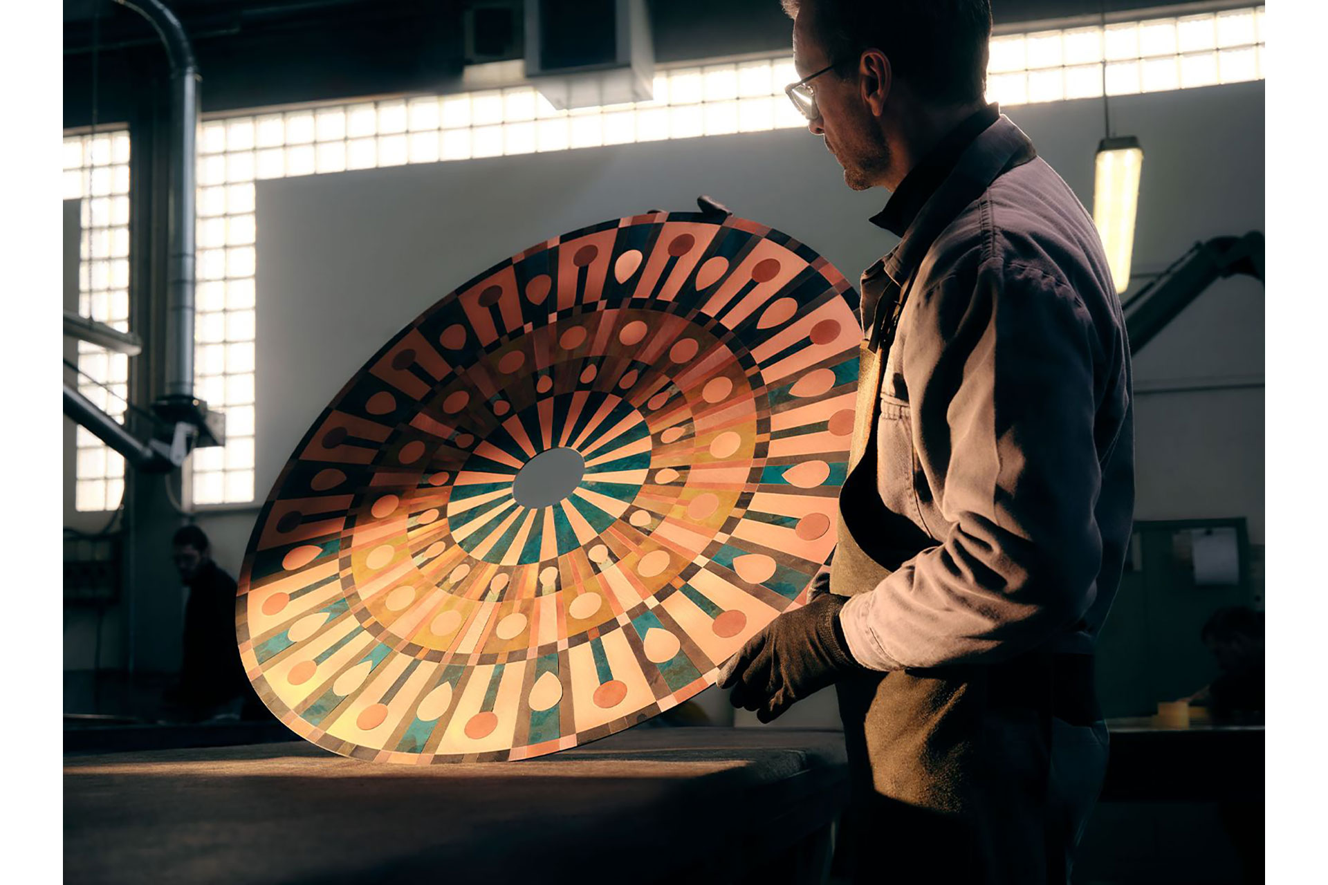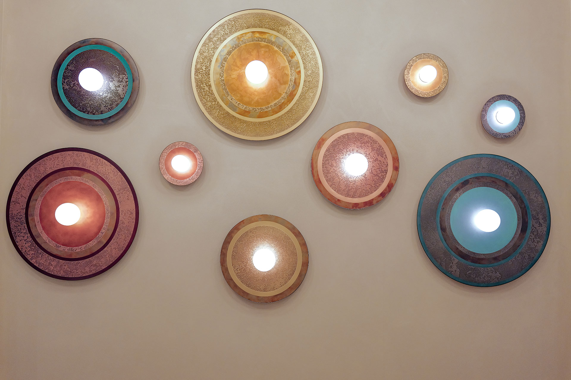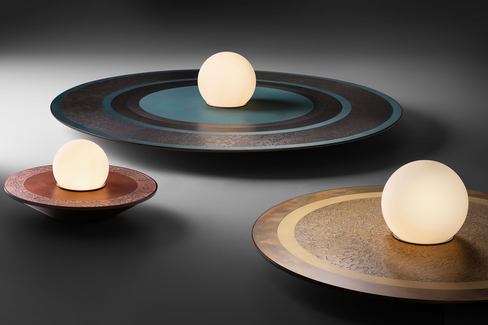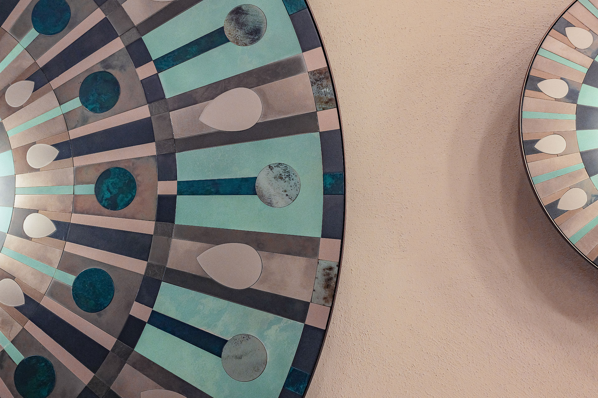 Caleide is a polychrome mosaic of steel, brass, and copper, combining oxidized and brushed finishes. At the center of the disc, a blown opal glass diffuser softens the E27 bulb’s light into a delicate glow, illuminating the matte metal surfaces and enhancing their natural tones and textures.