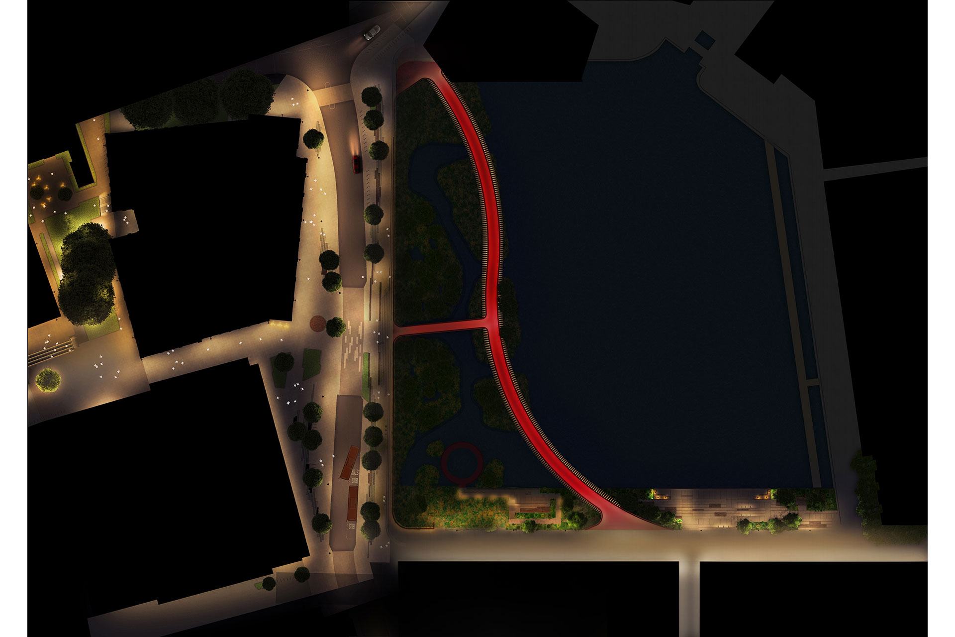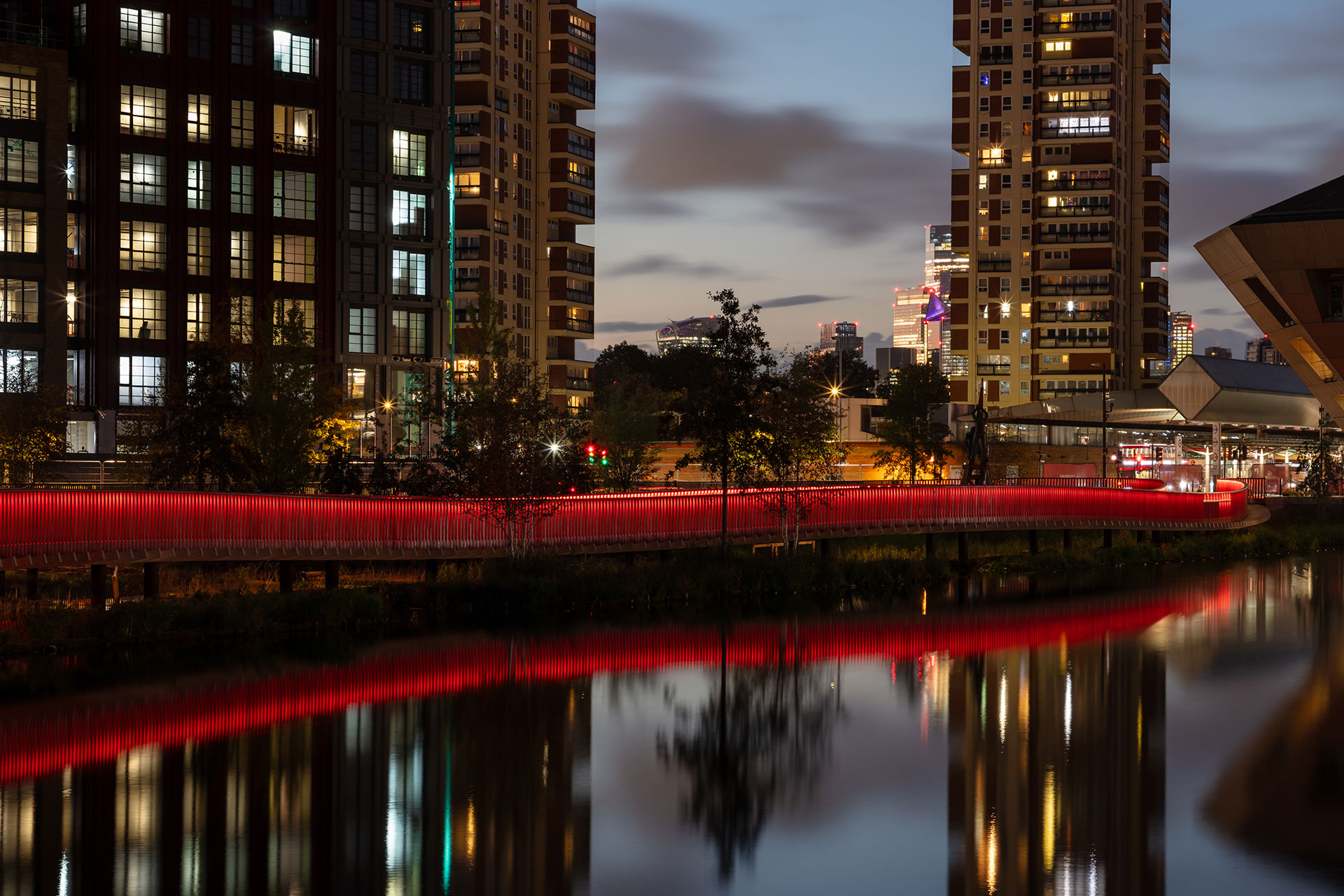 Canada Water is an evolving district, where layers of heritage, ecology, and urban life converge. At its heart, a new boardwalk and seating area have been animated by a lighting design that balances utility with responsibility and artistry. After dark, these interventions become a stage where people, place, and nature coexist in harmony.
