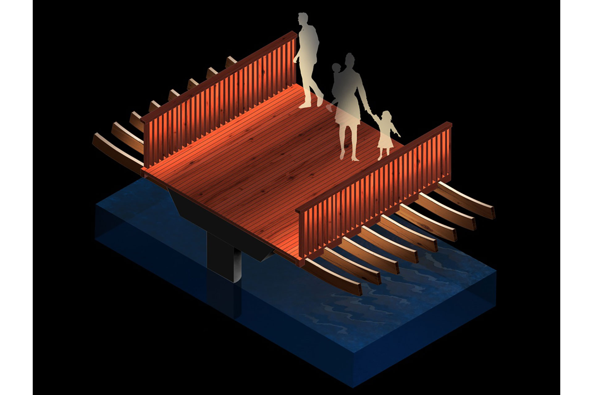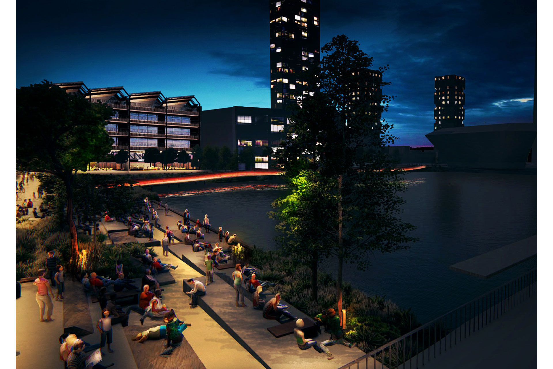 The boardwalk flows like a ribbon across the dock. As night falls, light concealed within the balustrade grazes the red-stained timber deck, balustrade and fins, deepening the colour and accentuating the structure’s sinuous rhythm. Integrated lighting within benches creates focal points that invite pause, while the Southern Steps glow softly with layered illumination that offers intimacy and welcome. Together, they transform passage into experience, encouraging people to dwell, meet, and connect.