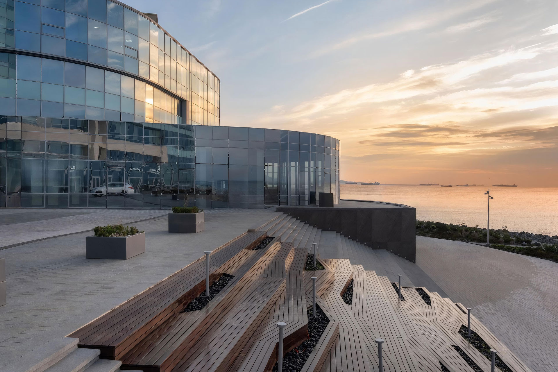 Cape Burny (means “stormy”) is located in Vladivostok on the shore of the Golden Horn Bay. The new multifunctional complex Burny is located on the territory of the cape. The embankment at Burnie turned out to be restrained and stylish: gray concrete, smooth lines, green islands and the sea, which seems endless. From here you can enjoy an amazing view of the sunset and the new quarters of Vladivostok. Classical music concerts are already being held here by candlelight. People are sitting in the amphitheater, listening to the cello, and at this moment it seems that Vladivostok is not just a city, but the breathing of the Pacific Ocean in a human rhythm.