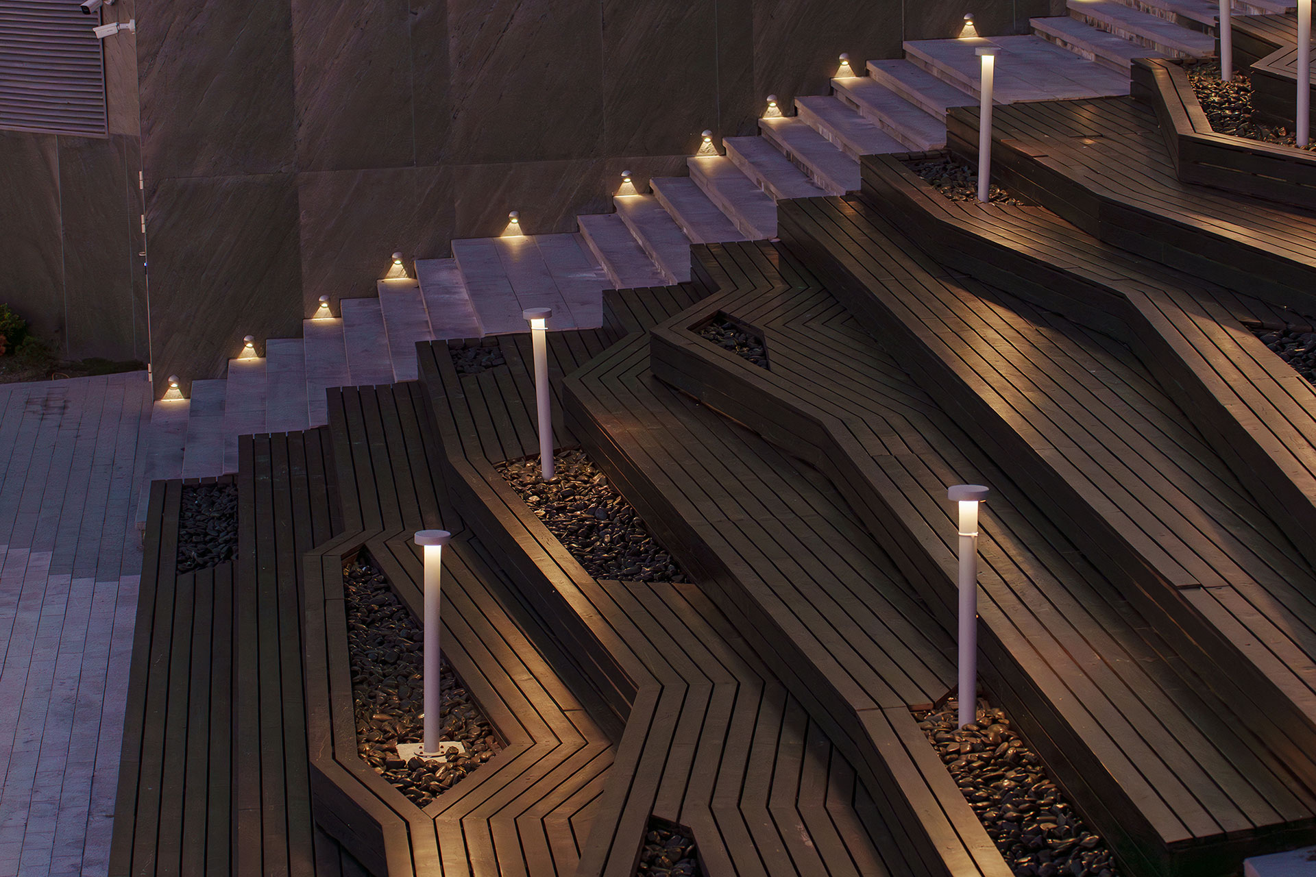 Light is embedded in retaining walls, stairs, timber decks, and relief features. Each fixture location was determined based on pedestrian flows, sightlines, and architectural rhythm. By integrating light into the built environment, the scheme establishes a subtle, cohesive nighttime structure that supports movement and spatial comprehension.
