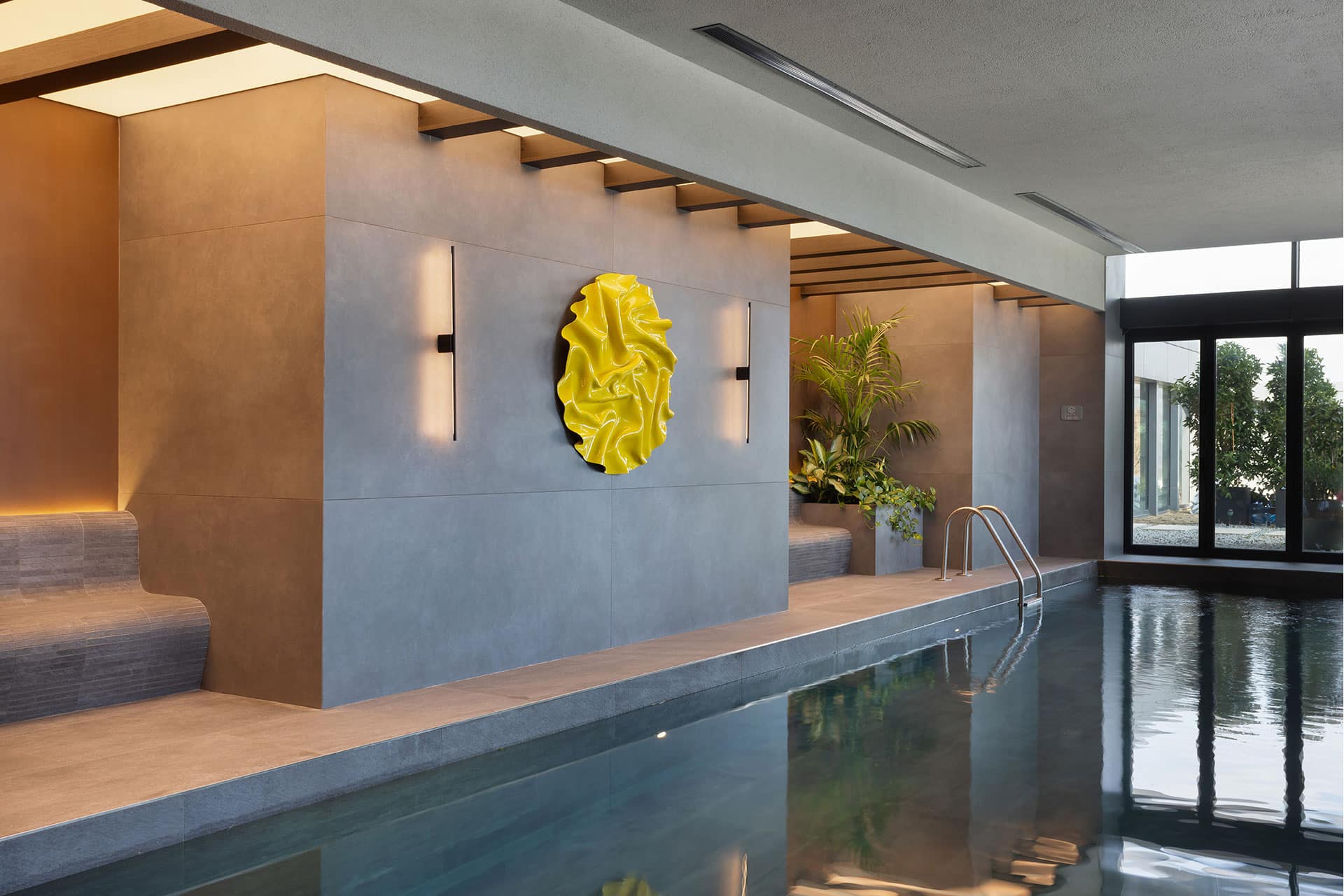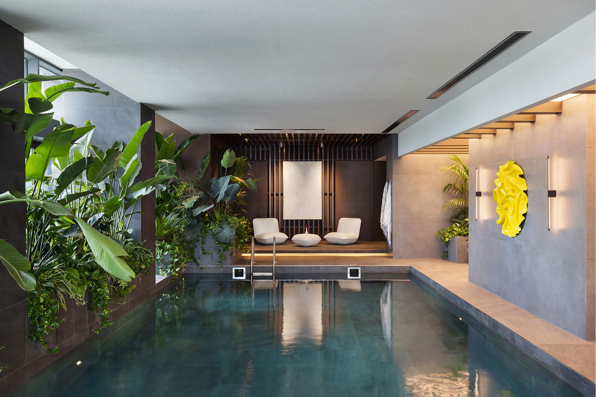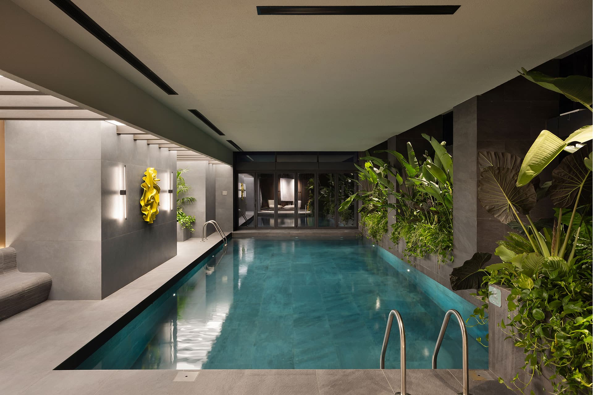 Lighting levels and carefully orchestrated contrast ratios provide a shared visual comfort for users of different ages and lifestyles, making accessibility and temporal adaptability essential aspects of the space’s architectural identity. Across spa, pool, and fitness zones, adjustable scenes transition seamlessly from energising morning brightness to calming evening warmth, supporting both activation and relaxation. Material selections—mineral-plaster surfaces, warm timber elements, and deep-toned stone-effect porcelain—interact with the lighting to reinforce spatial depth and tactile richness, while reflections of tropical greenery on water surfaces introduce a subtle biophilic dimension.