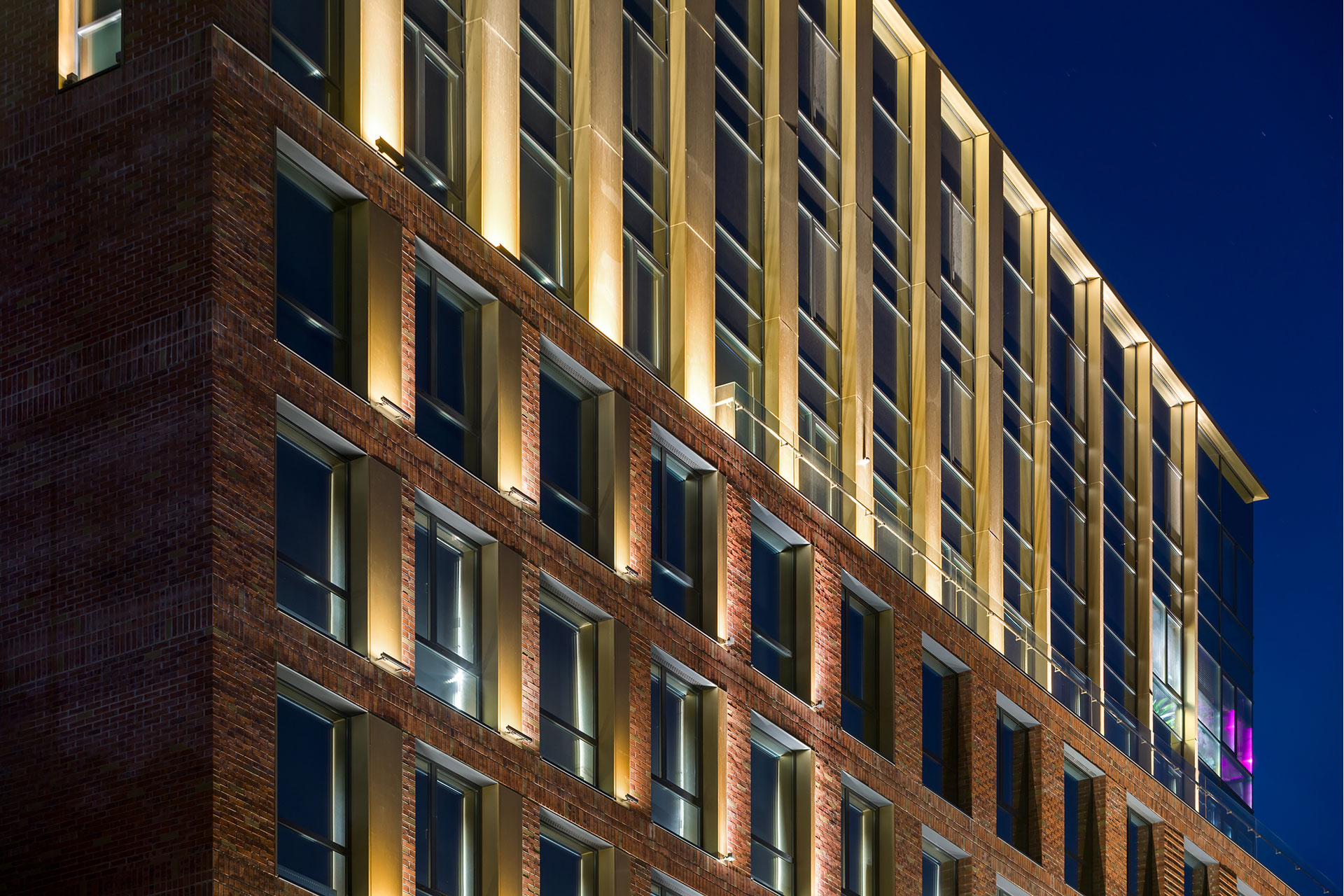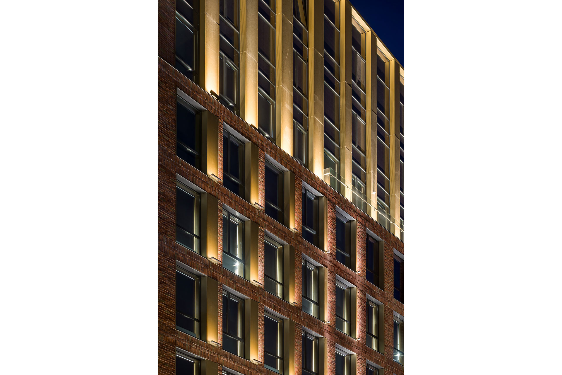 For this project, we emphasized the character of the facade by playing with vertical lines and soft accents on the windows. We used a combination of directional light and hidden linear elements to make the facade look light yet majestic in the evening lighting.