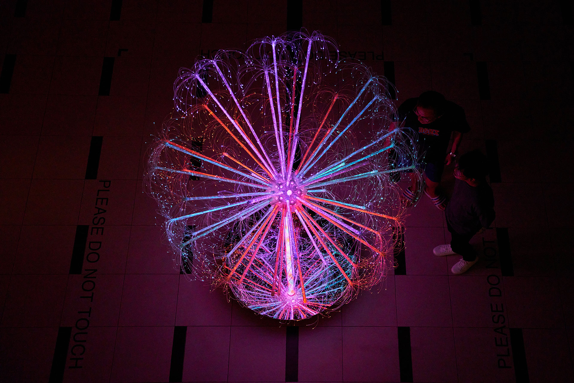 The installation is intentionally interactive, though never touched: its invitation is sensory, emotional, and spatial. As shown in the photographs, children instinctively reach toward the light, adults slow down to absorb the shifting colours, and crowds orbit the sculpture as though participating in a shared ritual of quiet discovery. The glowing fibres seem to gather around each gesture, intensifying near the movement before dissolving outward in gradients of violet, aqua, rose, and white. Viewed from above, Dandelion becomes a luminous mandala—an energy field of light radiating in perfect radial symmetry.