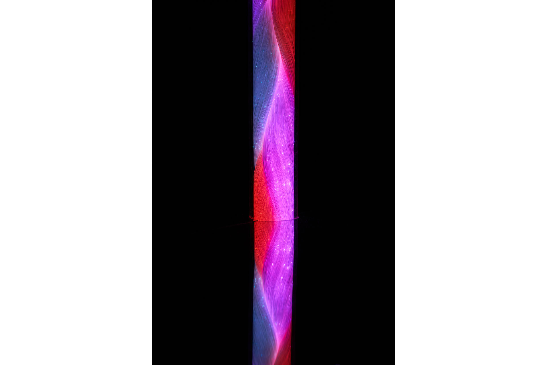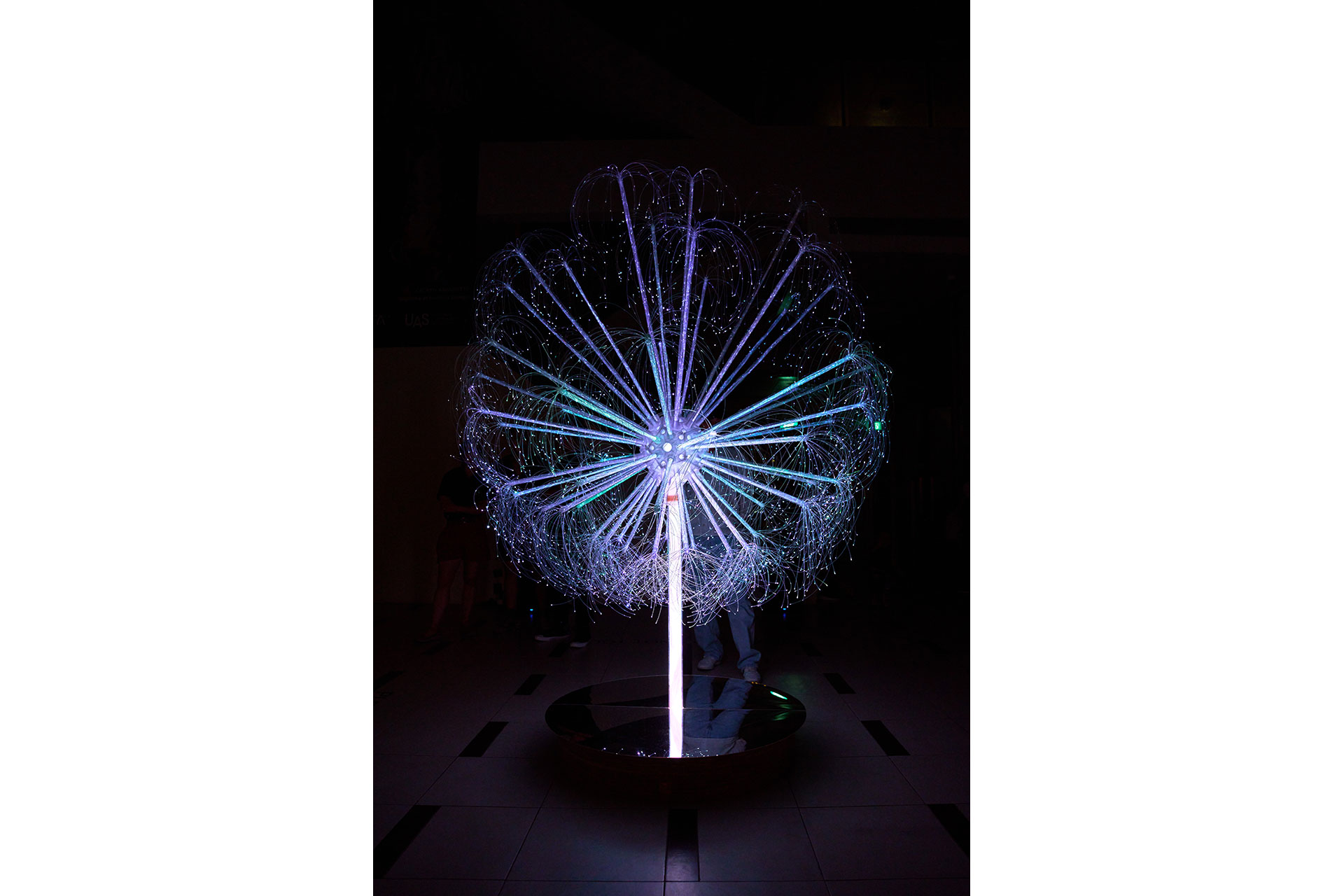 Beneath its visual delicacy lies an extensive technical architecture. Each fibre-optic filament is manually arranged to achieve the lightness of natural seed filaments, yet durable enough for sustained public interaction. Custom control software synchronises sensor input with lighting behaviour, enabling responsive “breathing” patterns and colour transitions. The central sphere, inspired by natural phyllotaxis arrangements, houses the lighting engine and signal pathways, while a reflective base amplifies the illusion of floating, doubling the sculpture’s visual presence.