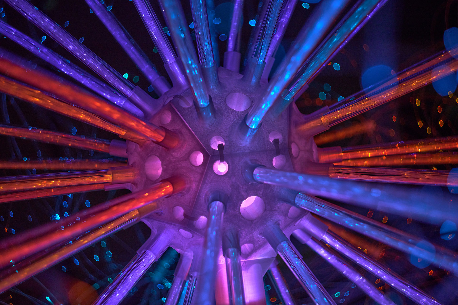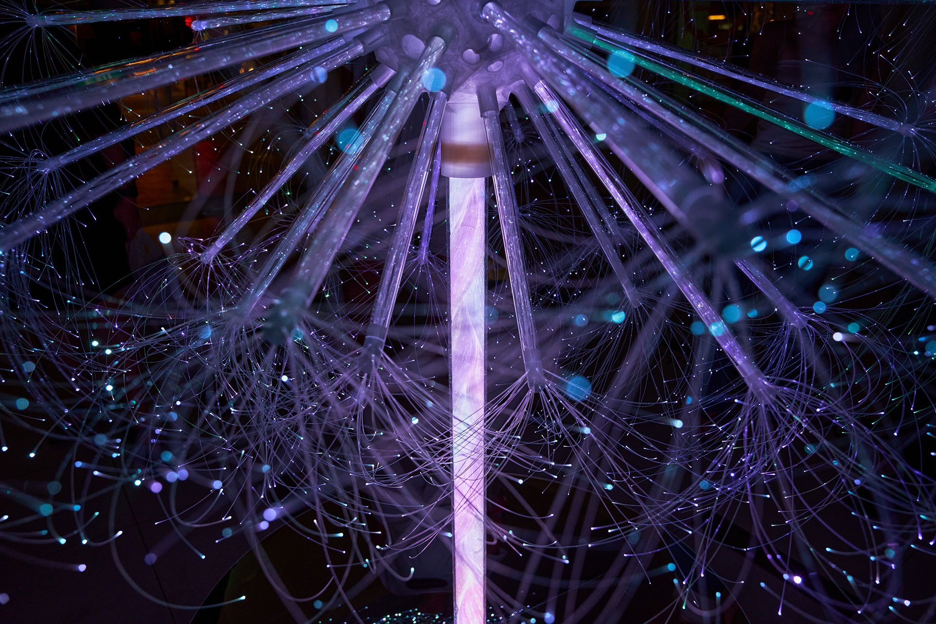 Constructed from 3000 individually illuminated fibre-optic strands, the sculpture responds organically to human presence through integrated proximity sensors. Its spherical geometry, precision-engineered with translucent acrylic stems radiating from a central core, was designed to emulate the ethereal weightlessness of real dandelion seeds ready to take flight. When visitors approach or move around the sculpture, the fibres shimmer, pulse, and ripple in changing colours—creating a living choreography of light that mirrors the soft motion of a dandelion dispersing in the wind.