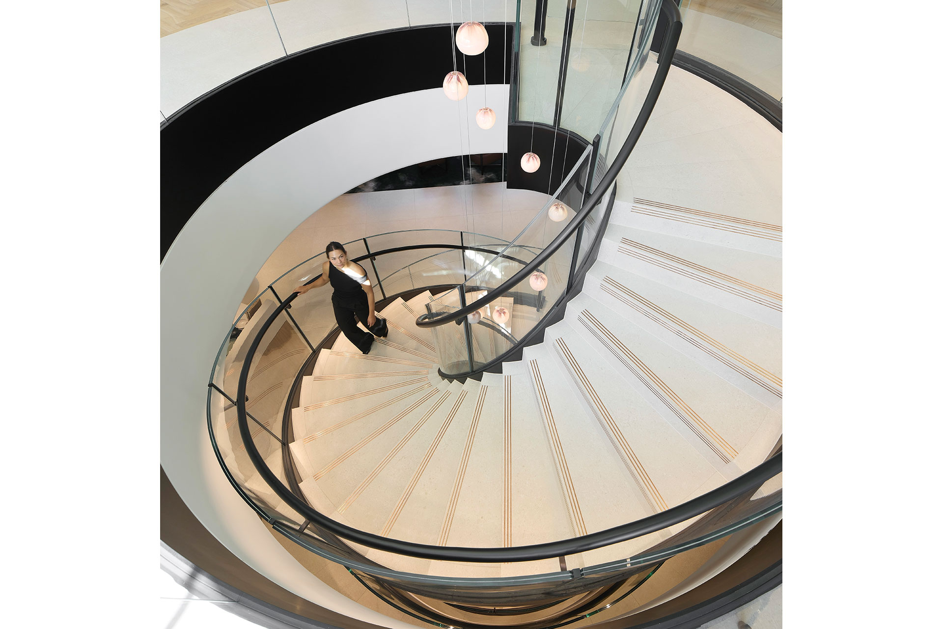The sculptural helical staircase forms a key architectural feature connecting the amenity levels. Concealed luminaires within the outer handrail deliver task lighting to the treads while emphasising the staircase’s sinuous form. Hand-made mouth‑blown glass pendants, suspended in a helical cluster, echo the geometry of the handrails and animate the central void.