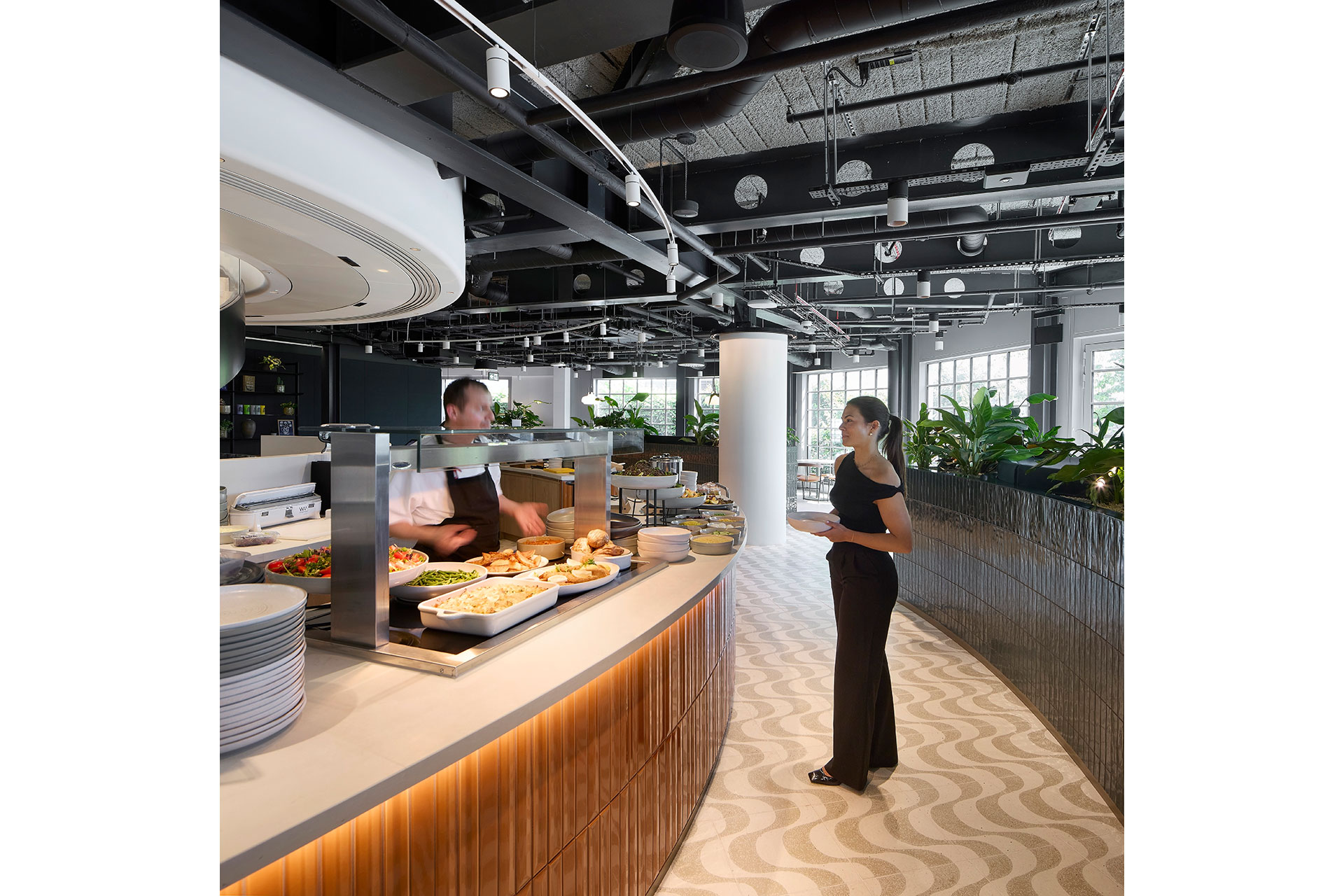 In staff amenity areas, a combination of pendant and wall lighting creates a calm, intimate atmosphere, complemented by integrated joinery lighting that draws attention to tactile materials and finishes. A bespoke track system in the café provides flexibility to support a variety of functions and layouts.