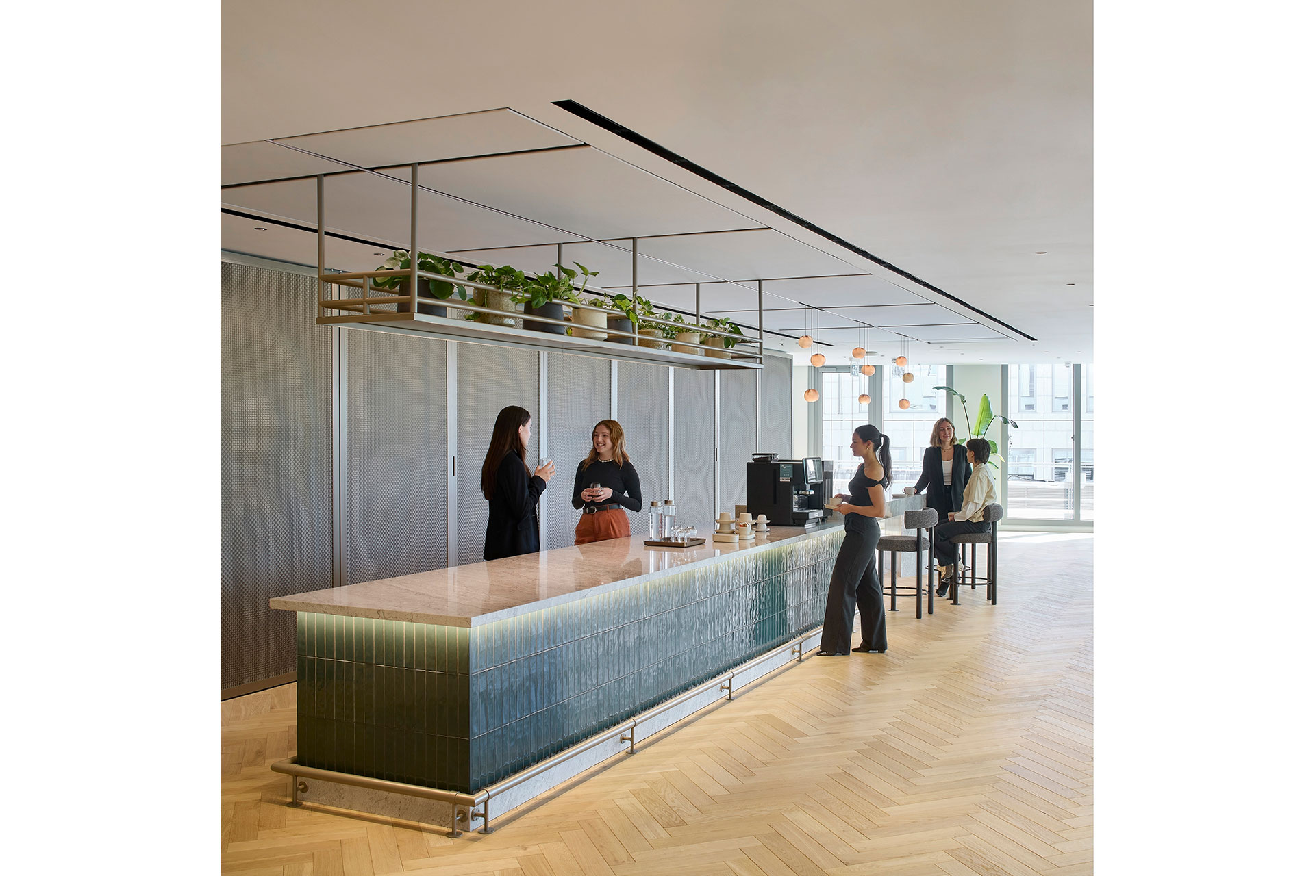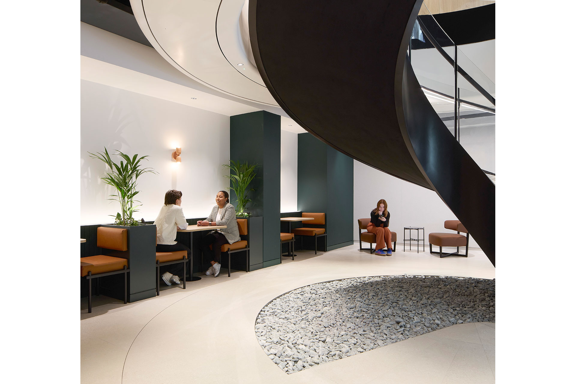Equation collaborated closely with TP Bennett to deliver a specialist lighting scheme for the amenity and client‑facing areas across three floors, including the main reception, lounge, staff café, link staircases, client-facing meeting rooms and refreshment hubs.