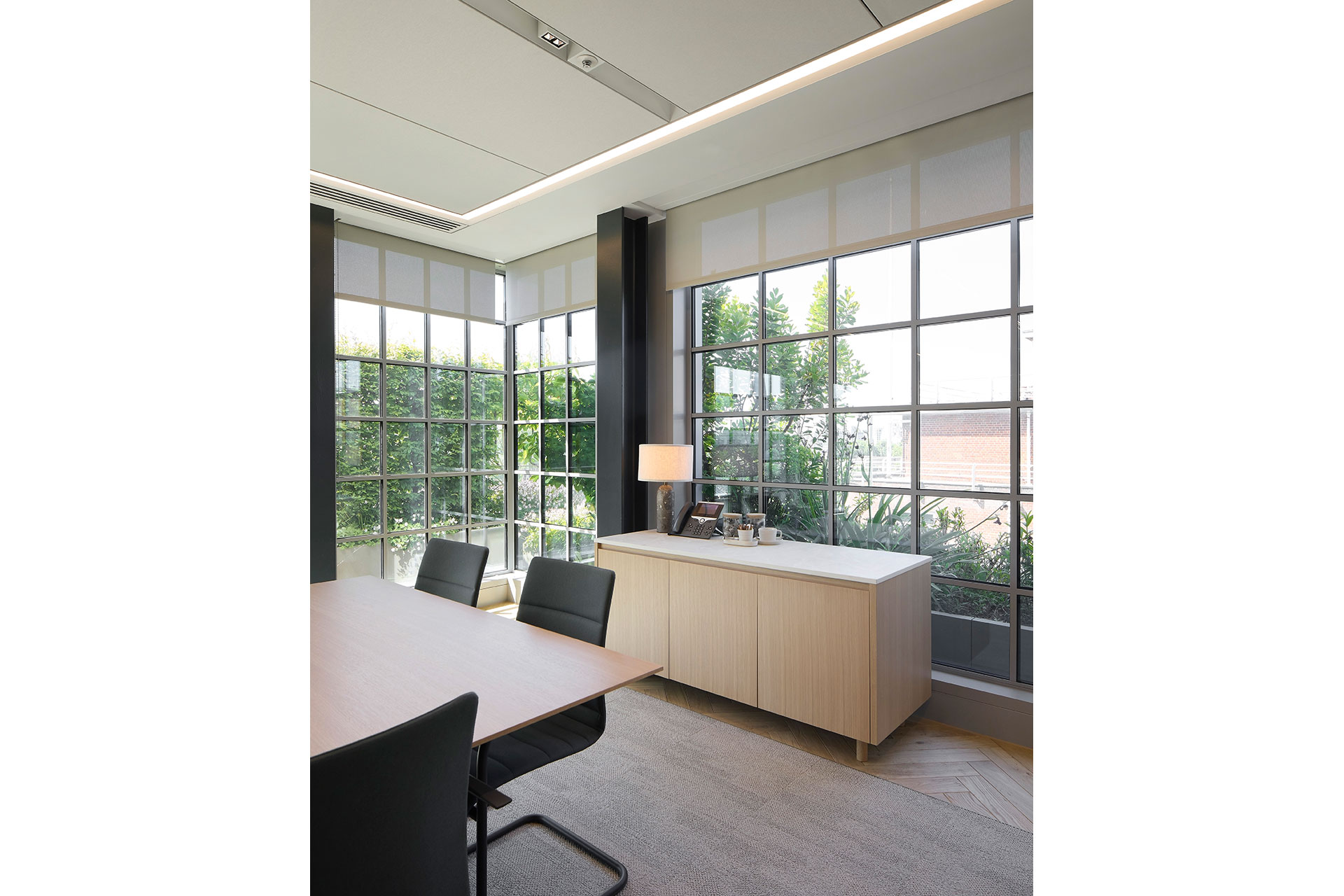 Meeting rooms incorporate micro‑prismatic linear luminaires and downlights within multi‑service channels to deliver low‑glare task lighting and balanced general illumination. Indirect linear luminaires frame the edges of the stretched fabric acoustic ceilings, creating a soft perimeter glow, while table lamps on credenzas further enhance the ambience.