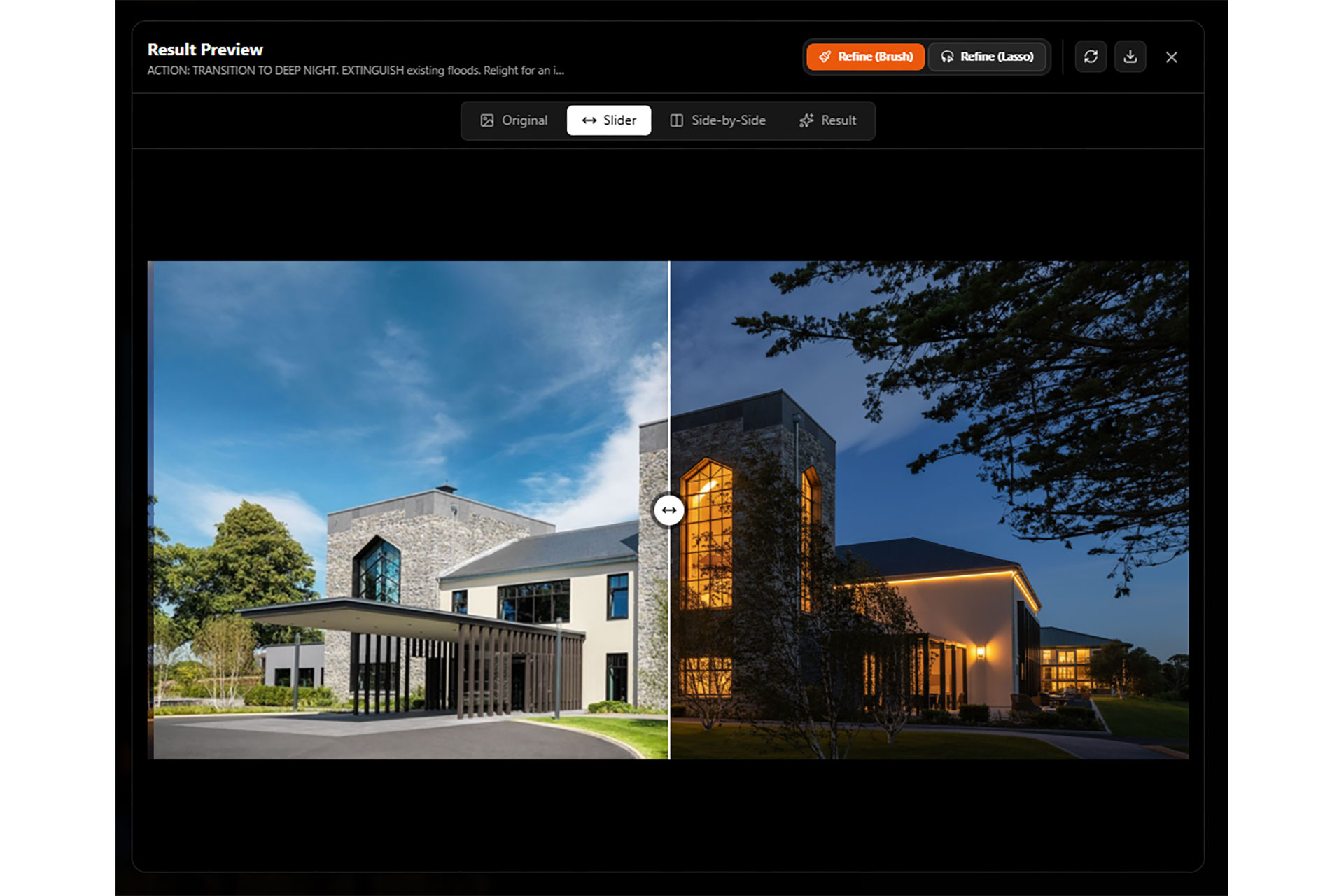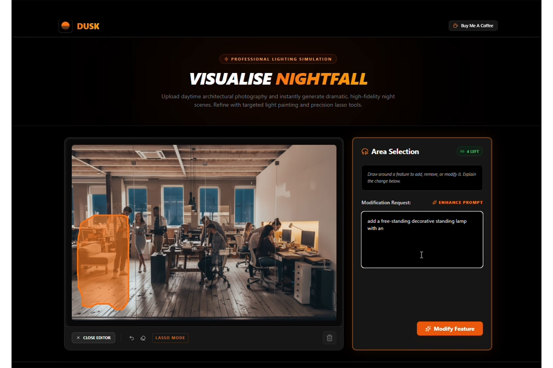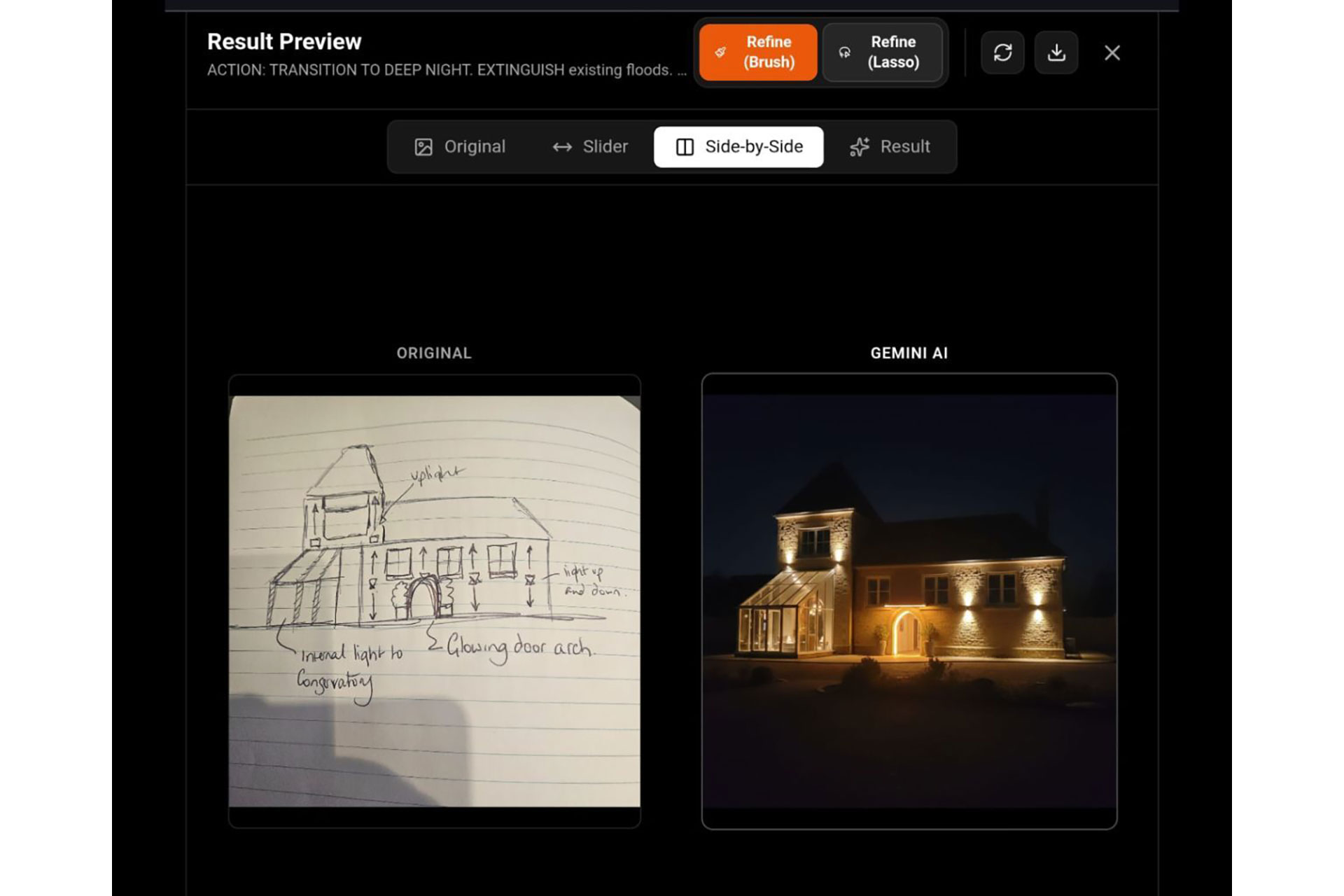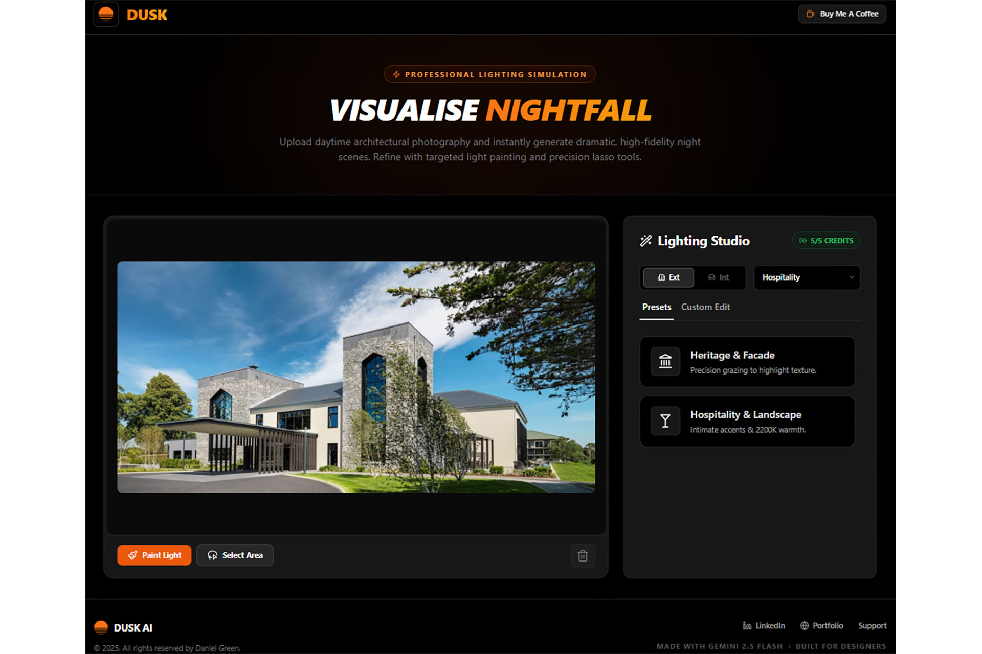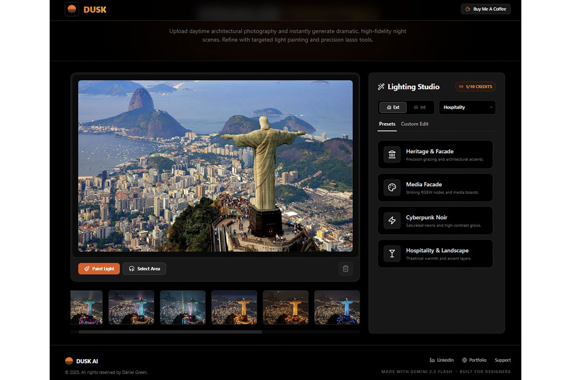 DUSK is a new online lighting visualising tool aimed at lighting designers, that uses Gemini AI to transform daytime photos, renders and even hand sketches into illuminated night scenes for in-house brainstorming sessions, mood-boards and initial lighting concepts.