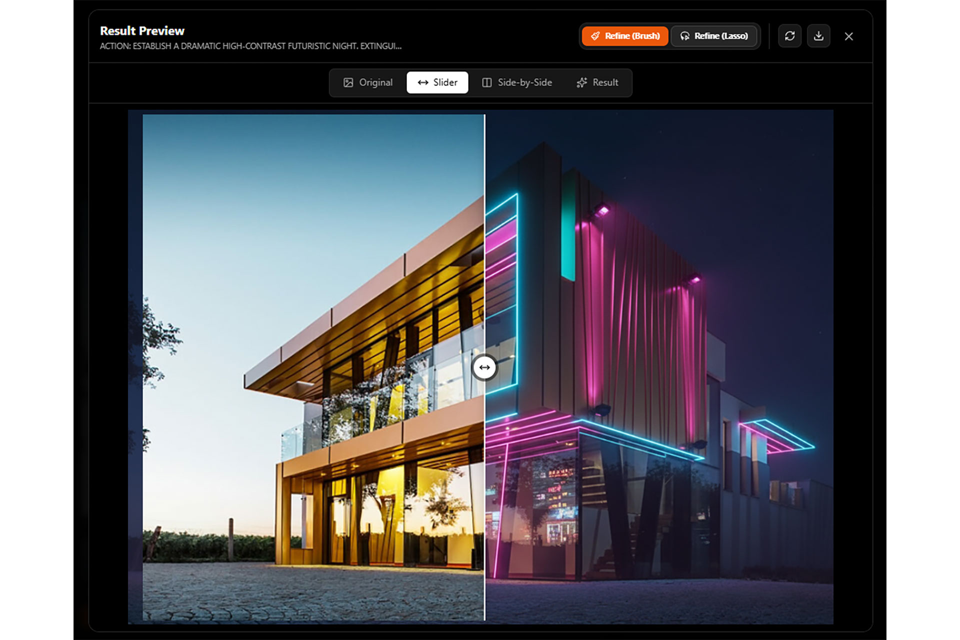The results can be viewed either side-by-side or with a before/after slider, and you can click Retry for more variations before saving your preferred output.