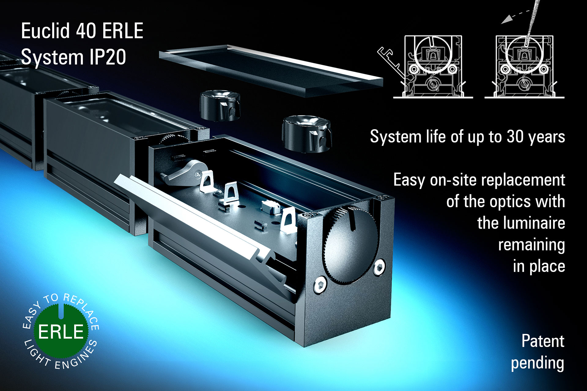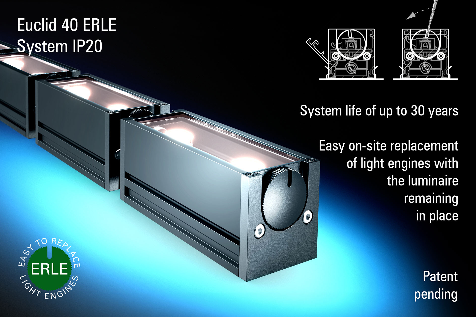 Easy on-site replacement of light engines is a key element of the design of all new Radiant systems, and the Euclid 40 ERLE System IP 20 is one of the first examples of this approach.