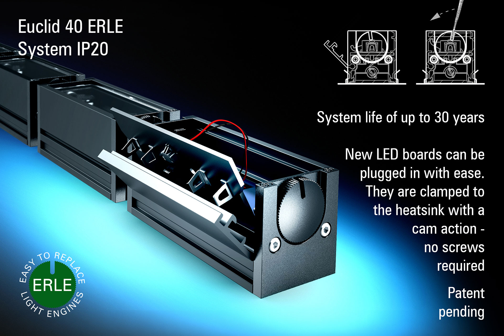 The idea behind the development of the Euclid 40 ERLE System is to extend the working life up to 30 years by making the light engines as easy as possible to replace on-site.