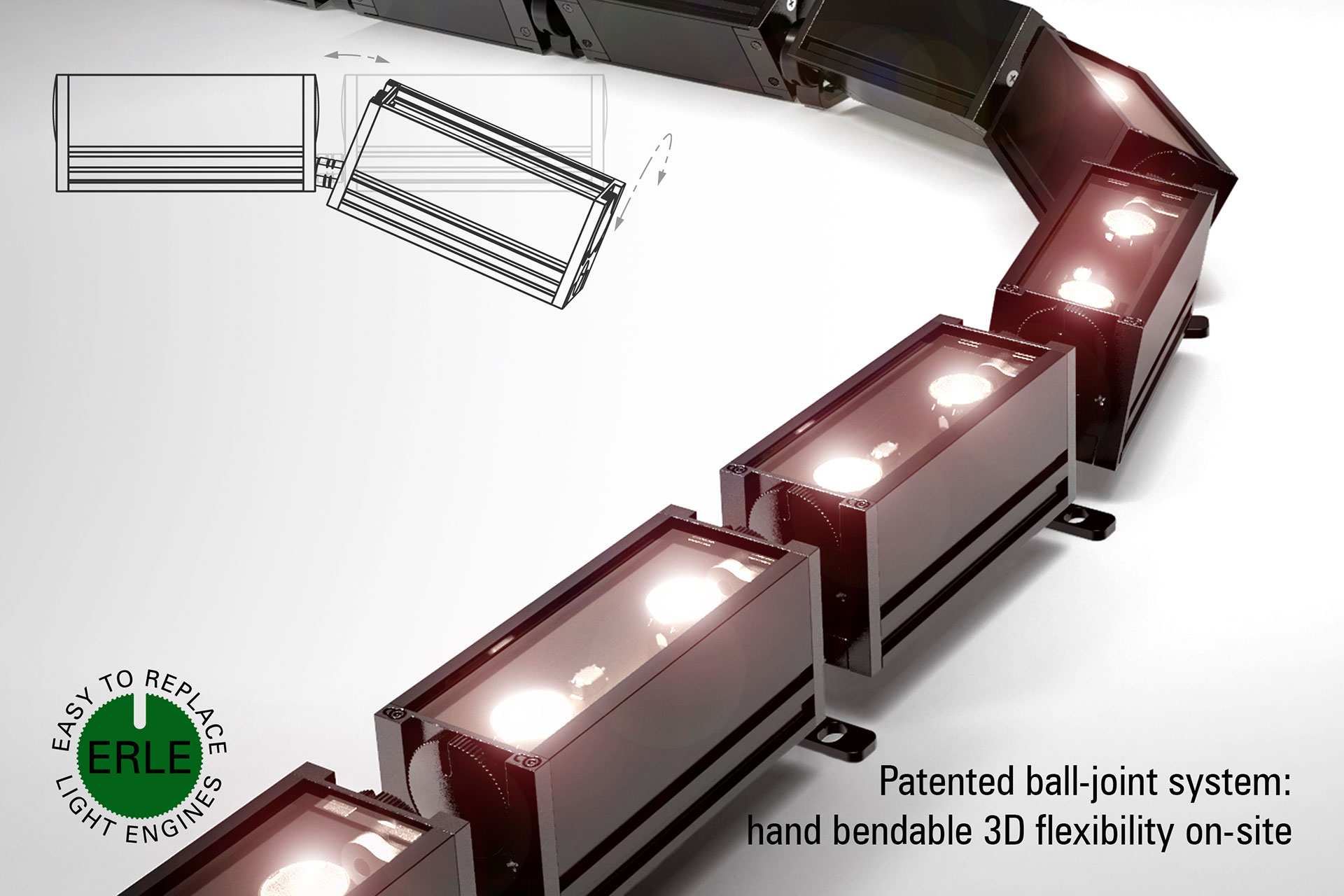 The system can be configured as a linear system for straight runs and as an articulated system for use in curved locations.  The shorter luminaire sections used for the articulated type are connected with Radiant’s patented ball-joint system.