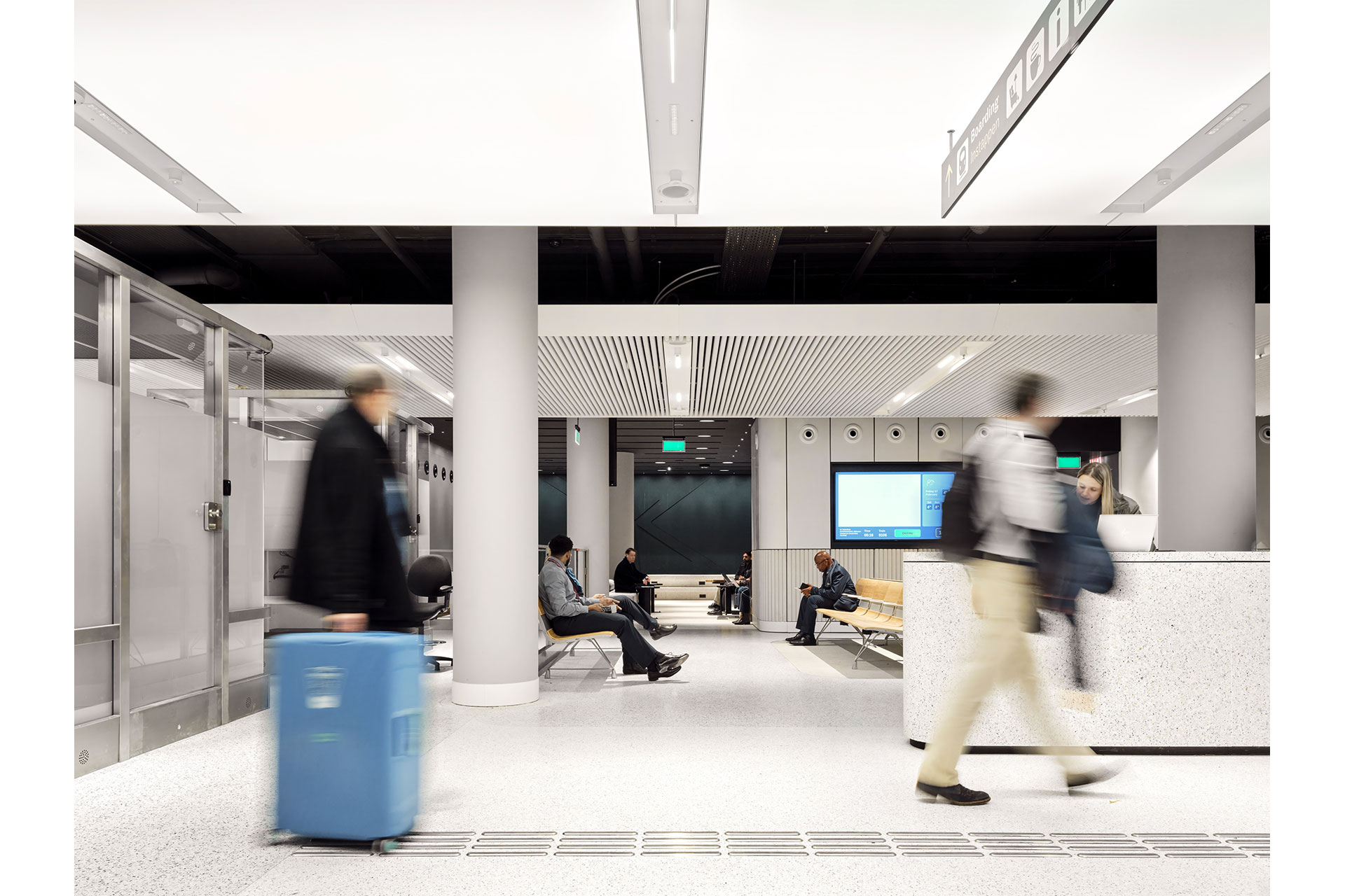 An impressive, forty-seven meter long luminous ceiling stretches all the way from customs to the historic columns and brick wall and creates a pleasant and dynamic atmosphere. It reveals moving clouds with varying speed, shapes, hue and intensities, just like real Dutch skies.  The level of movement and brightness is connected to the various stages of the boarding process, e.g.: floating clouds start drifting and brightness increases when the train arrives. In fact, the dynamics of the light communicates when the train arrives, when boarding starts etc.