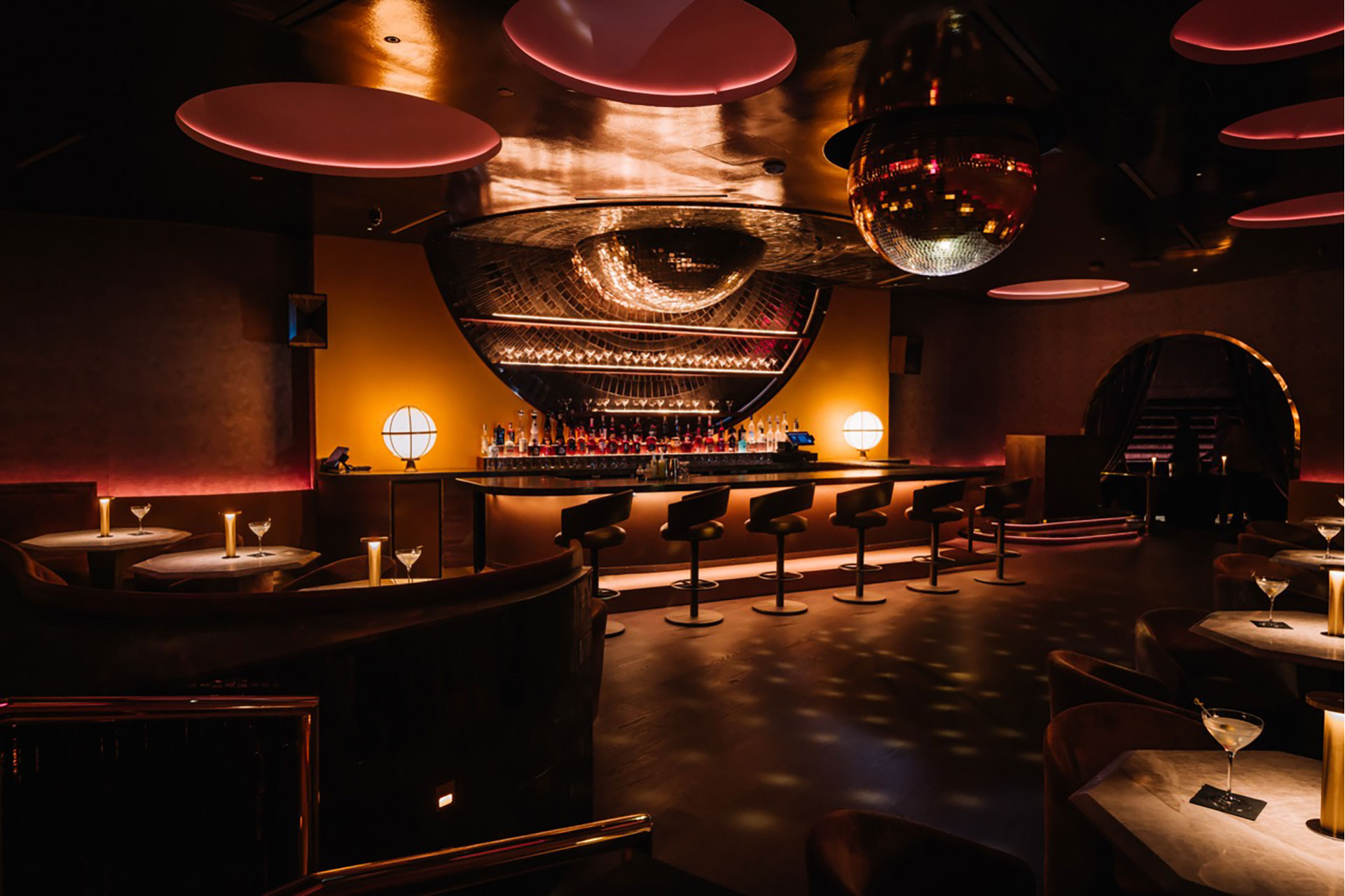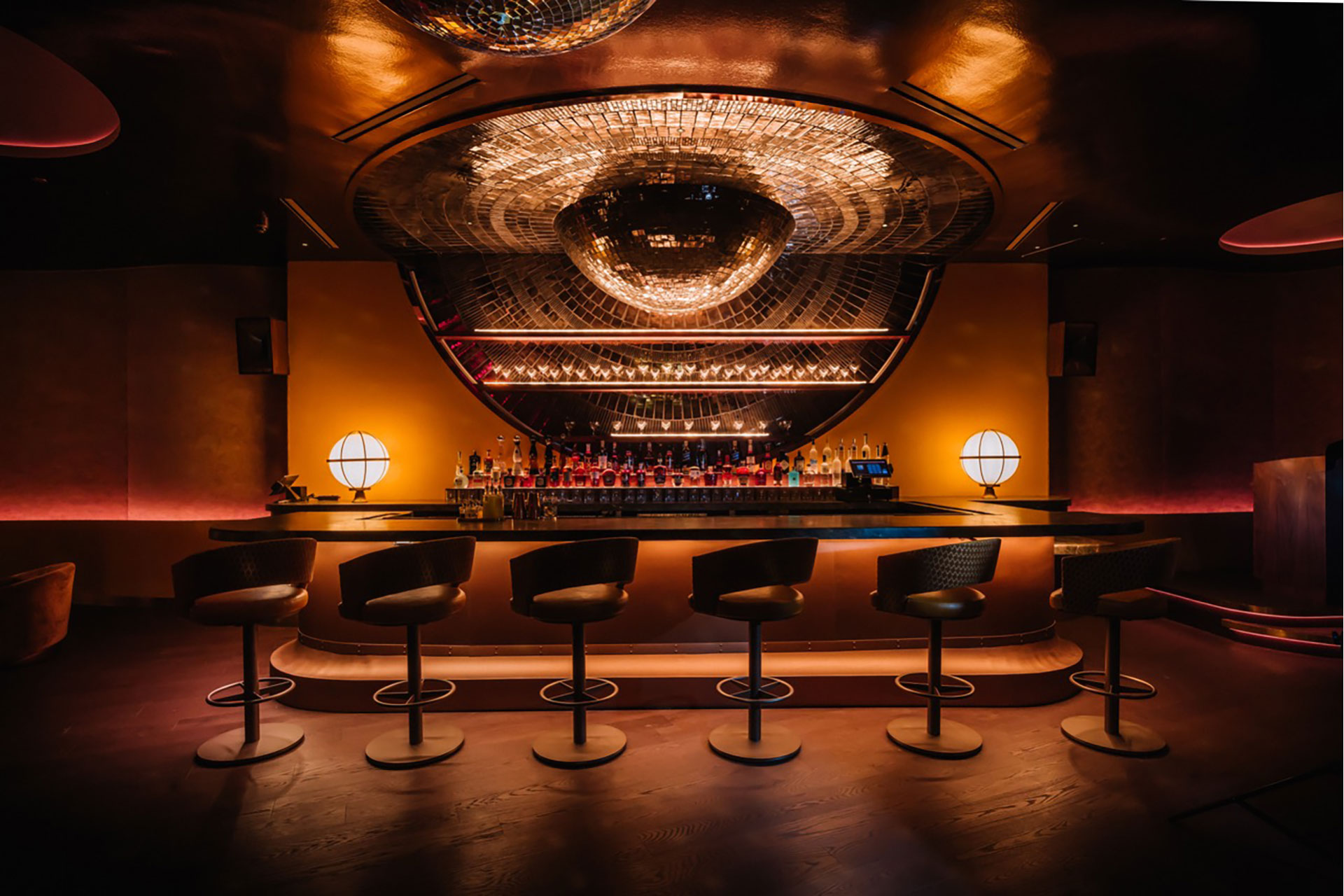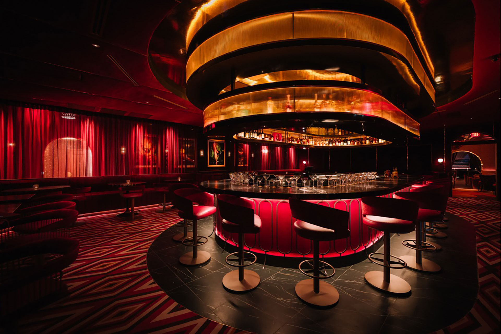 At the bar, lighting establishes both focal dominance and ambient contribution. Backlit bottle displays were calibrated at warm 2200K color temperatures to create depth and sparkle against reflective finishes, while concealed linear sources provide low-glare vertical illumination to enhance facial rendering. Custom LED fixtures introduce a controlled red spectral component, carefully tuned to enrich surrounding materials without distorting skin tones. The bar operates as a luminous anchor, radiating layered light into adjacent circulation paths while maintaining controlled contrast ratios to preserve visual comfort.