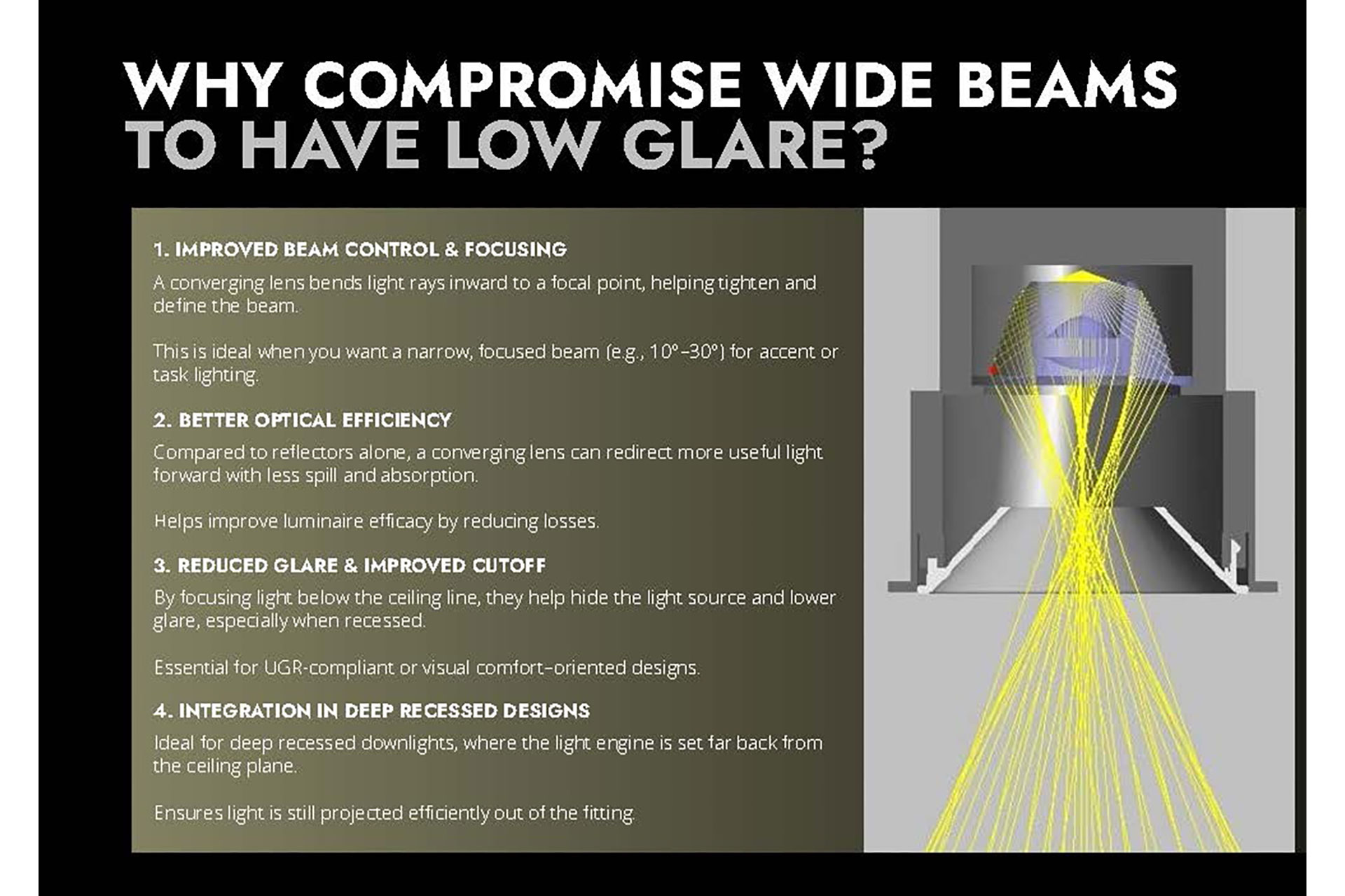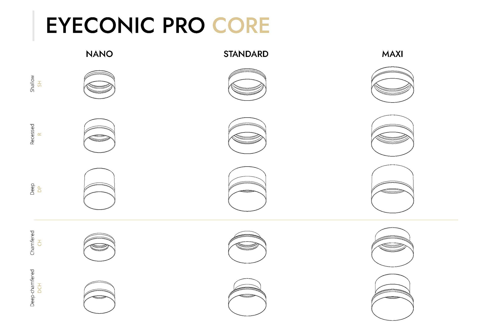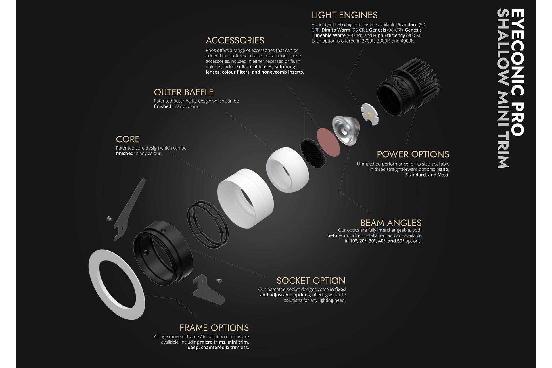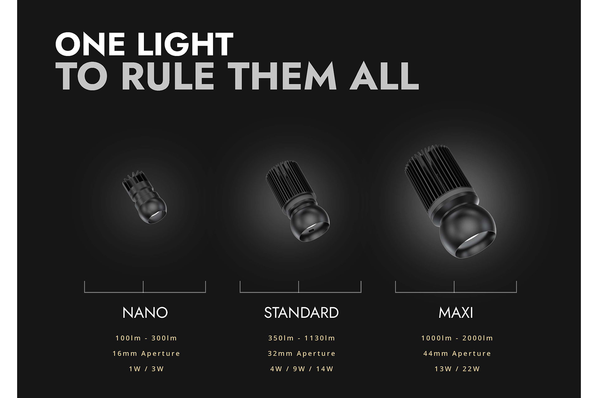 The system introduces three optic depths: shallow, standard, and deep across our Nano, Standard, and Maxi formats. These optical engines snap into five core variations, which are interchanged into five different fixing brackets that range from trimless to micro trims, giving lighting designers precise control over beam, brightness, and glare.