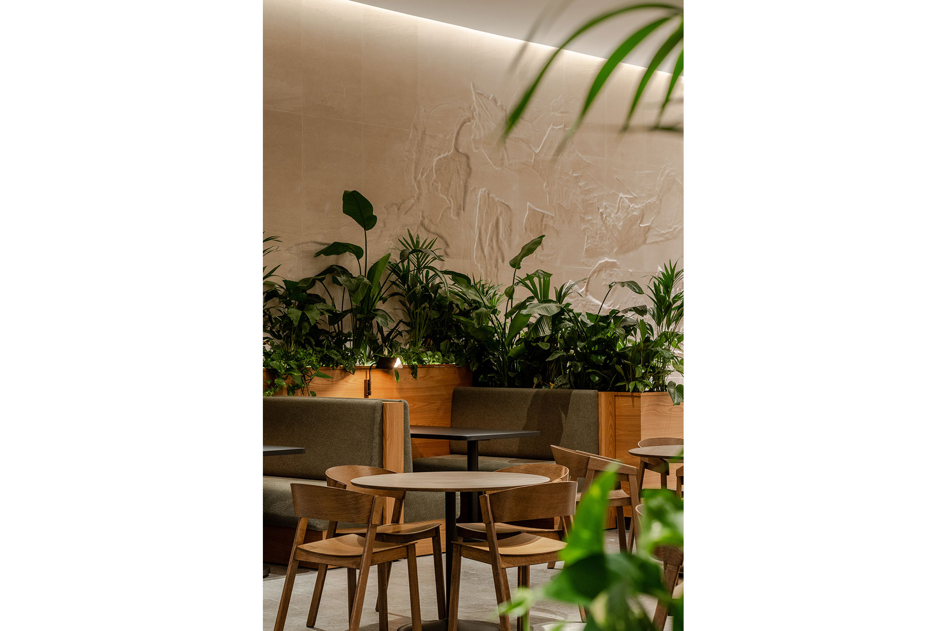 The lobby’s new coffee bar is complemented by a matching bespoke chandelier, mirror-backed shelving with integrated lighting, and at a lower level, a wash of illumination highlighting its textured front. Integrated joinery lighting continues within timber shelving and planters, adding another layer of visual interest.