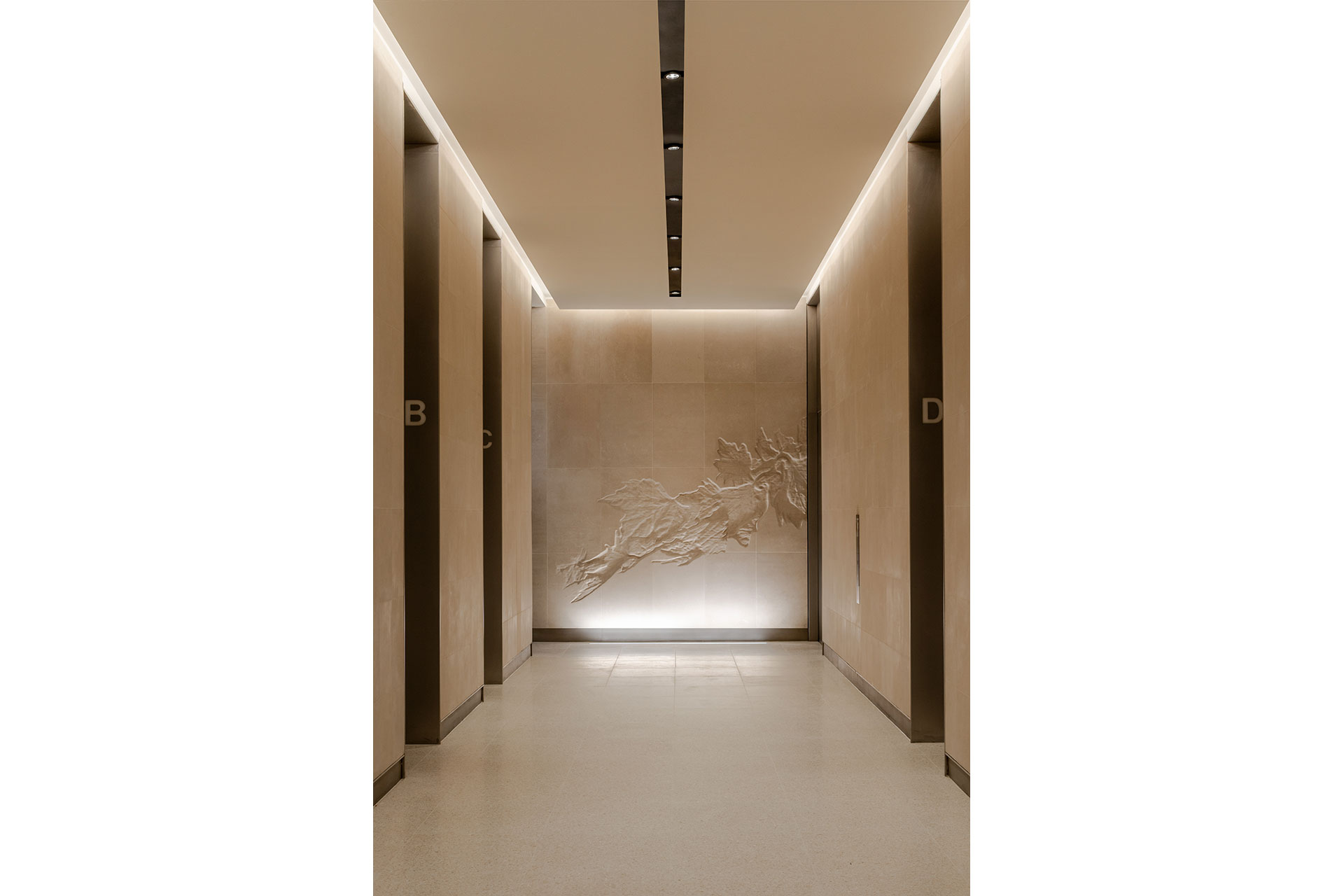 The newly installed custom timber desk is defined by a bespoke brass and ribbed glass chandelier that anchors the reception. The elegant piece provides uplighting to the ceiling and task lighting below. Behind, the Portland stone wall’s textured leaf carvings – a feature throughout – are accentuated by a wash of uplighting, creating a commanding backdrop. Light Terrazzo tiles have replaced the previous dark stone floor to elevate the lobby’s central area further, allowing recessed downlights to bounce light between the floor and ceiling.