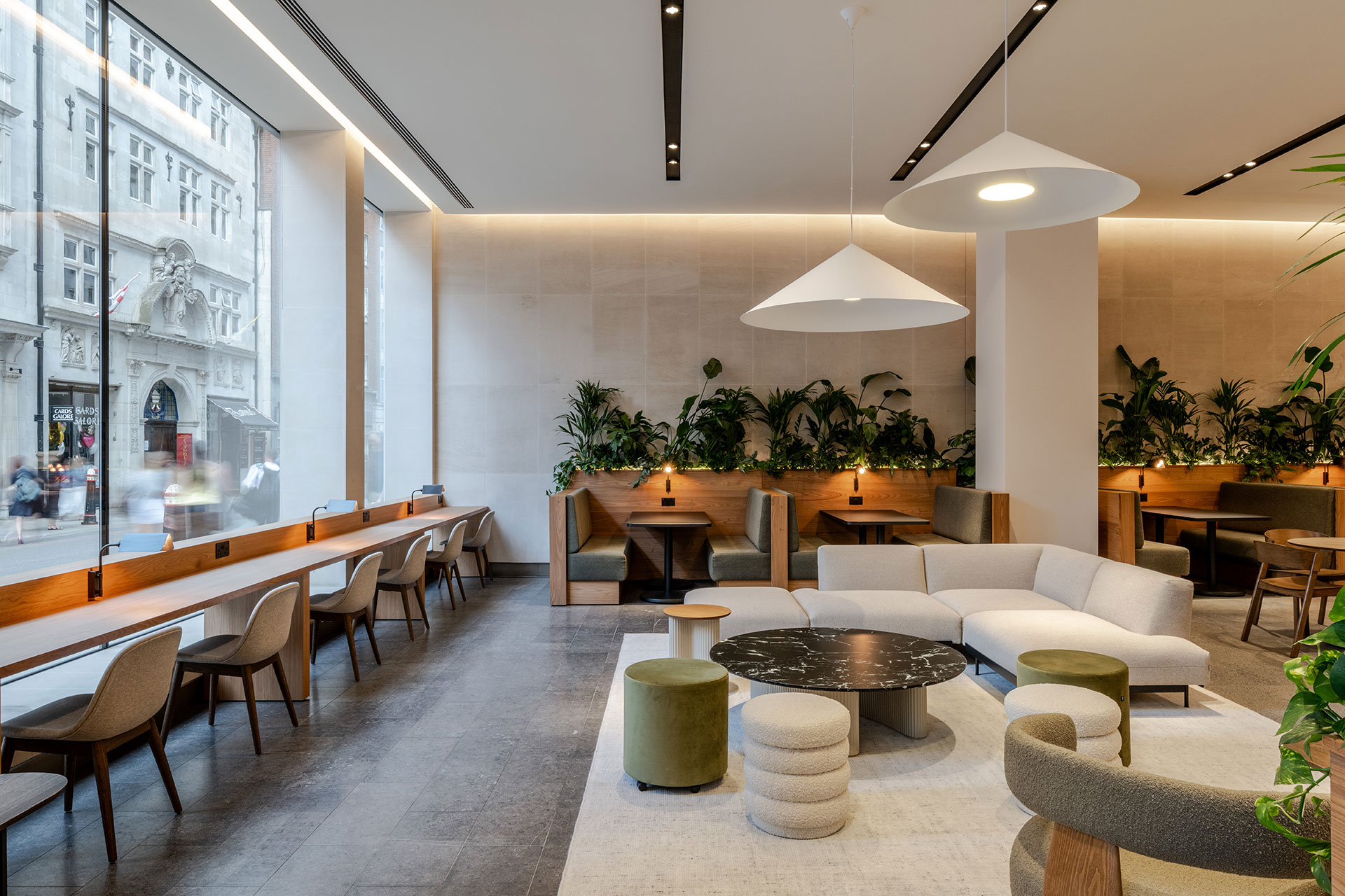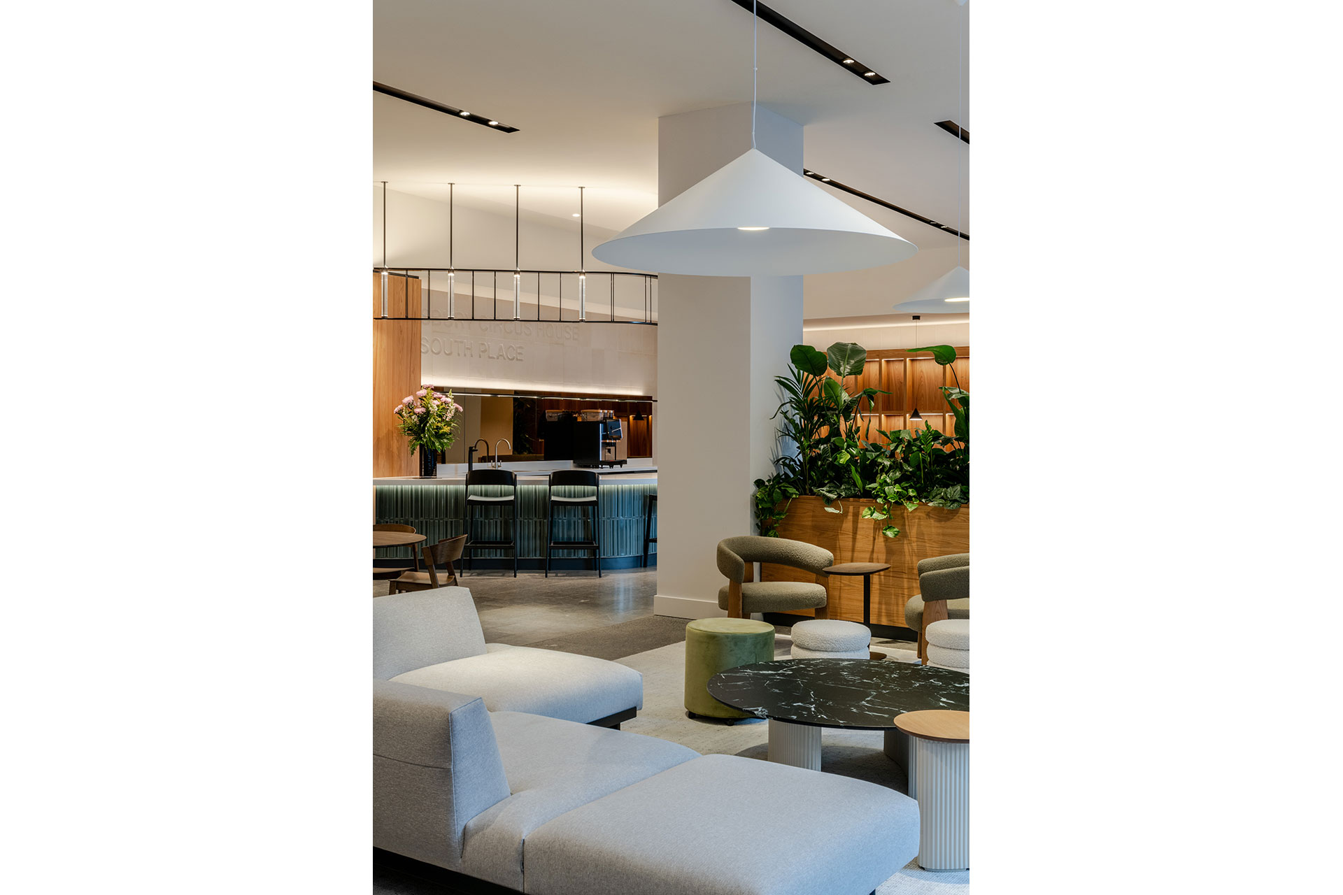 The reception area at Finsbury Circus House, London has undergone a dramatic transformation, replacing the previously bland corporate look with a warmer, hospitality-inspired design aligned with today’s workplace needs.