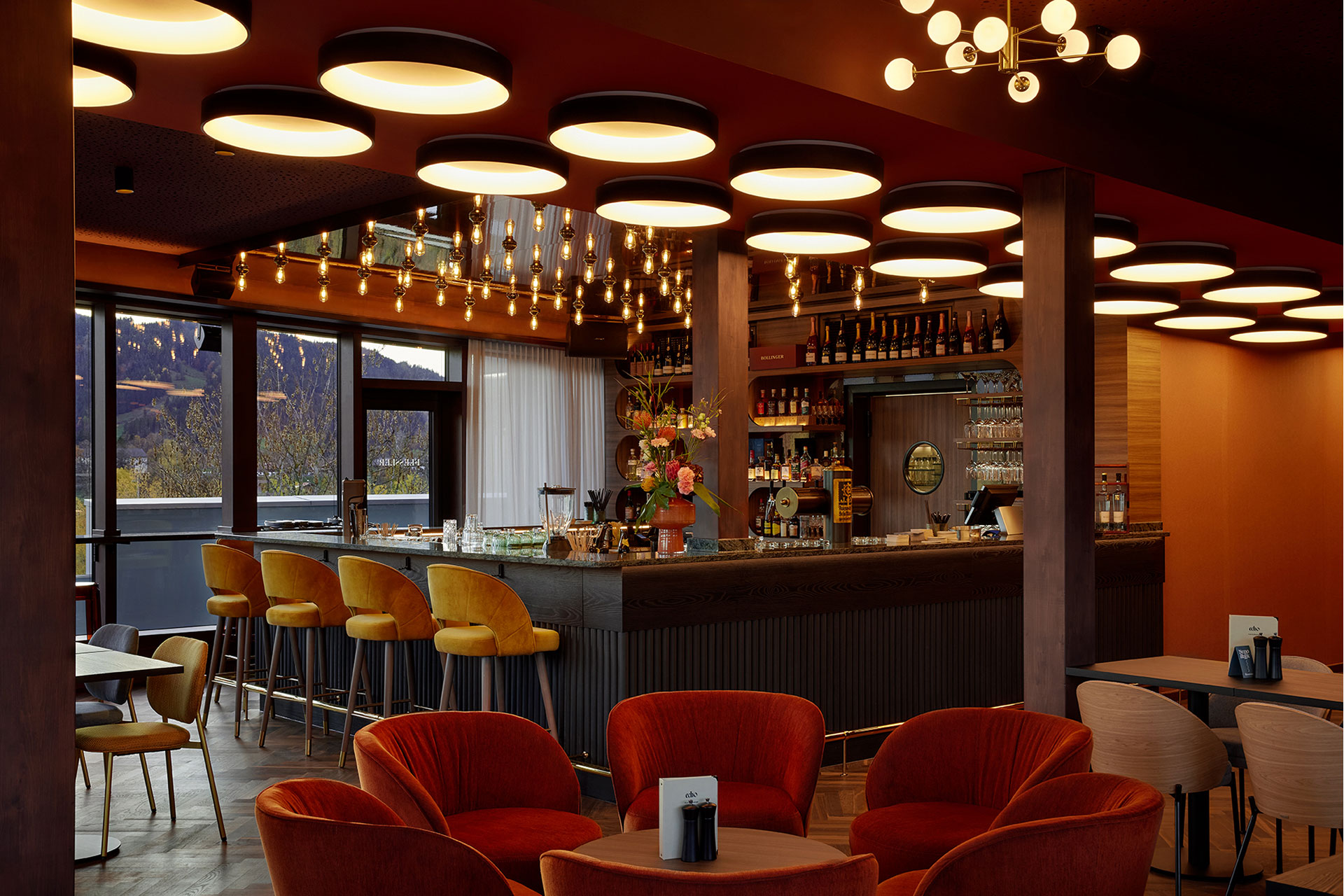 A central design element of the hotel is its sophisticated lighting concept. Transparent, coloured acrylic surfaces create a sense of lightness and set specific accents, while a wide range of different lights each create their own moods. This creates individually characterized areas – from the bar to various table and lounge areas to the rooms and suites. In the bathrooms, indirect lighting behind the mirrors creates a soft play of colors in pastel shades, which is reflected many times over in the smooth surfaces. Overall, the deliberately staged lighting at Flesslers Lenggries creates a lively atmosphere inspired by retro elements and gives the rooms an almost special, floating effect.