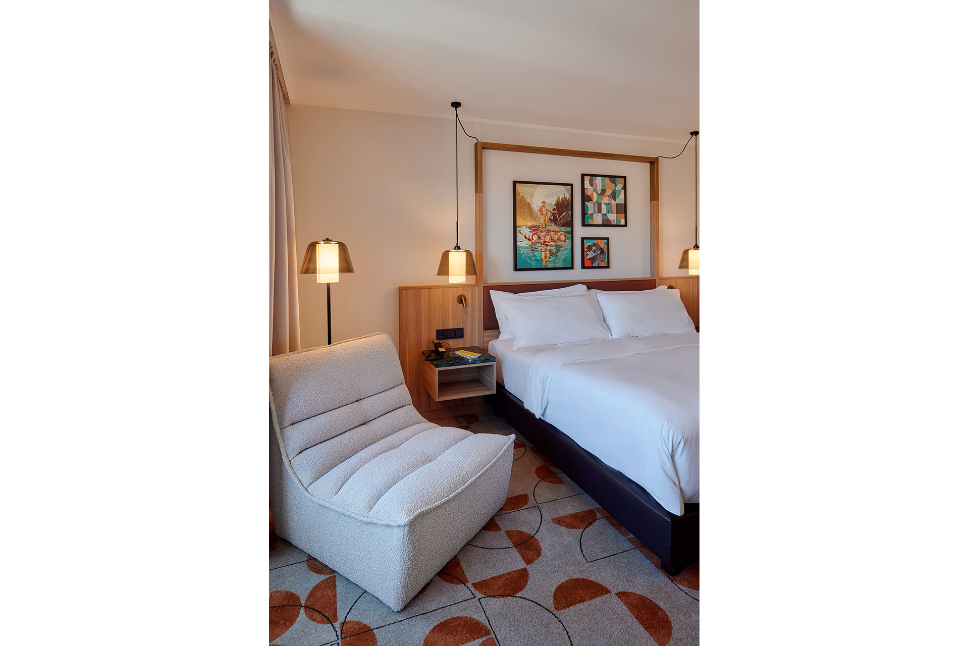 Guests can also revel in the light of custom-made 1970s-style luminaires in the guest rooms.