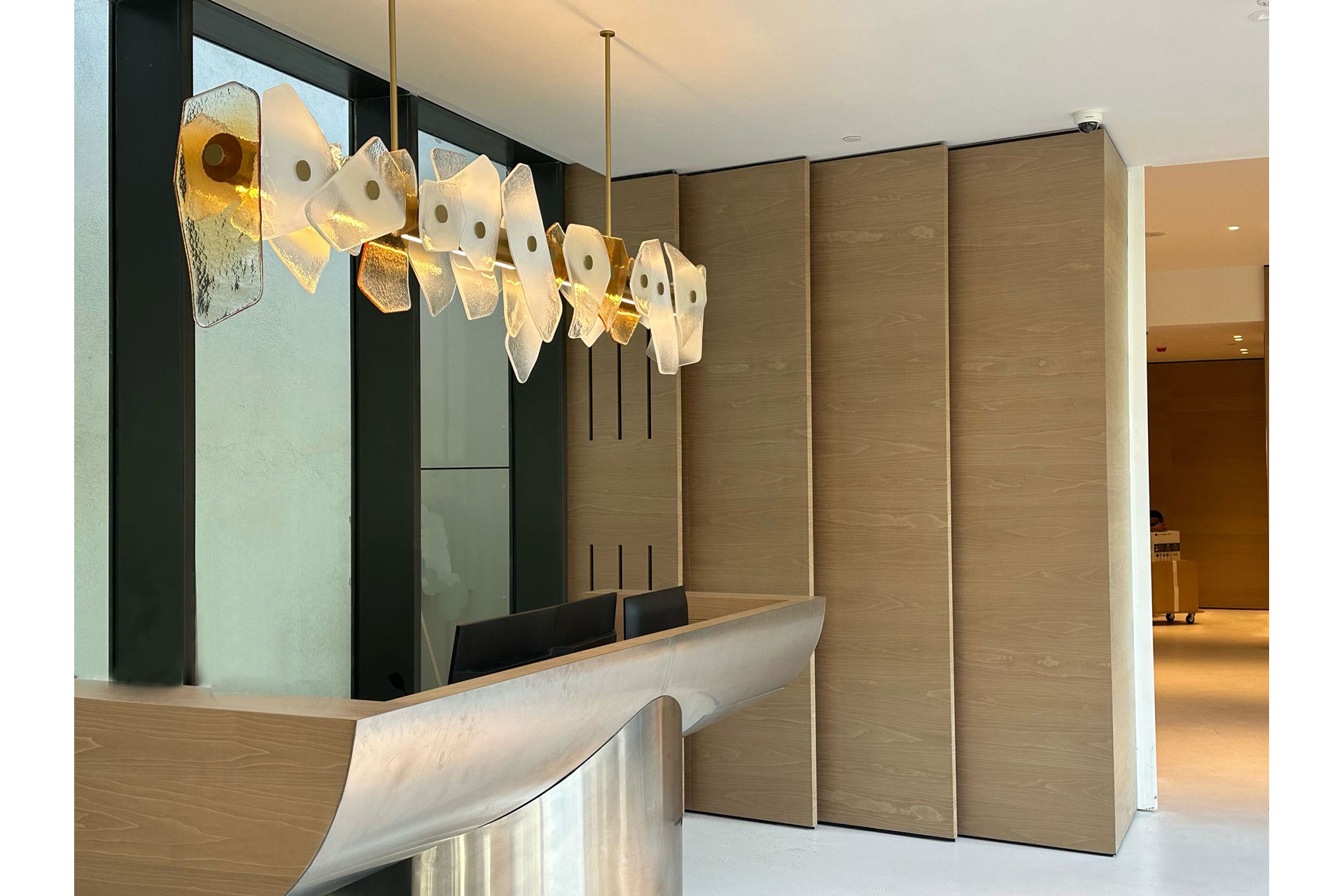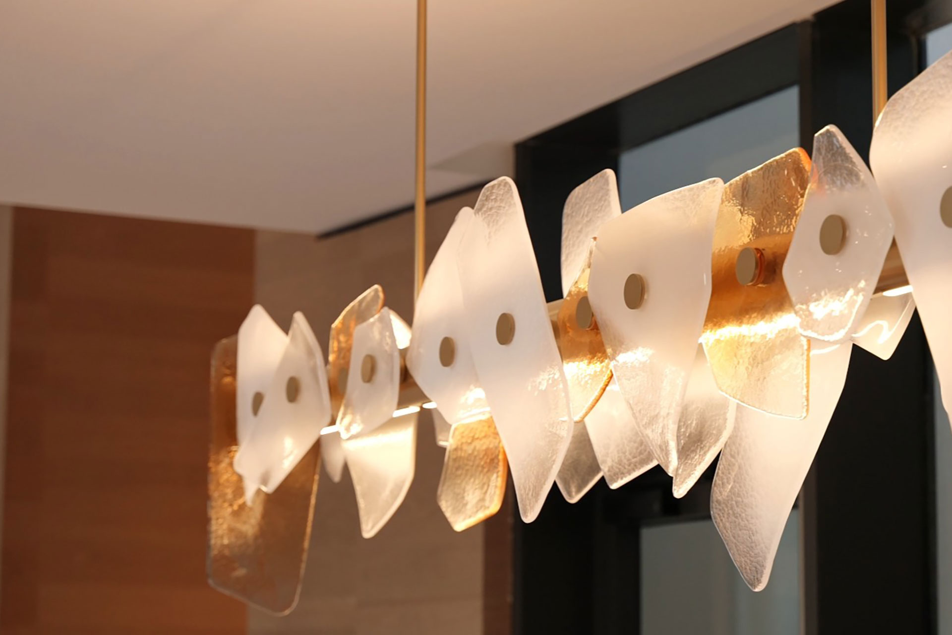 The chandelier is made from brass, powder coat finished. The four unique glass leaves forms are placed along a 2500 mm tube, one in front of the other, overlapping so the light casts beautifully through them and is lit with linear 2700 K warm white LED light, throwing the light up and down. Each glass shape is three dimensional, and to ensure that the glasses do not touch the ones in front of them, I designed a special mechanism that controls their direction during assembly.