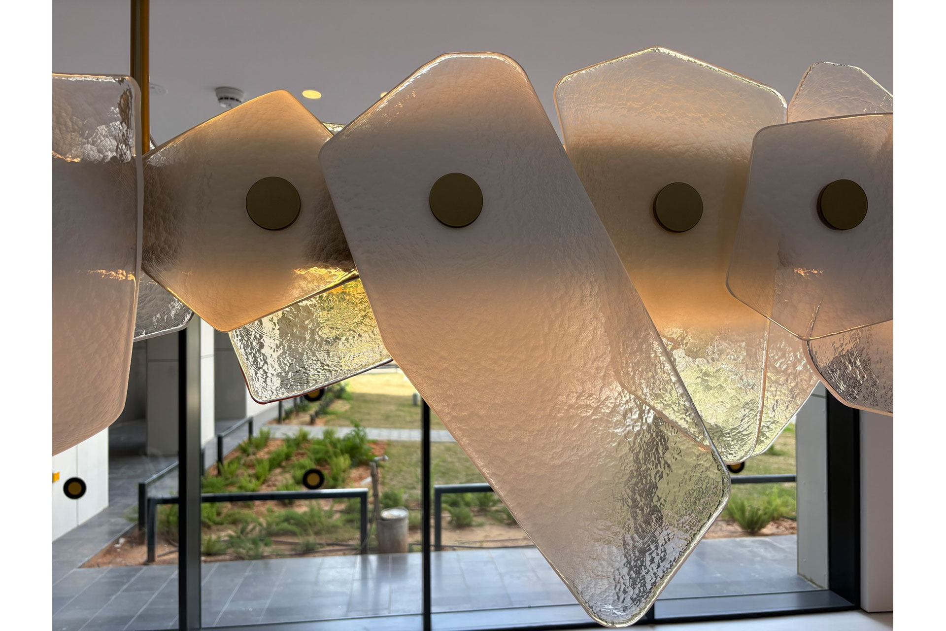 As light passes through the textured glass, it creates a gentle, translucent glow, an effect that brings a soft, natural movement and enhances the sense of calm within the space.