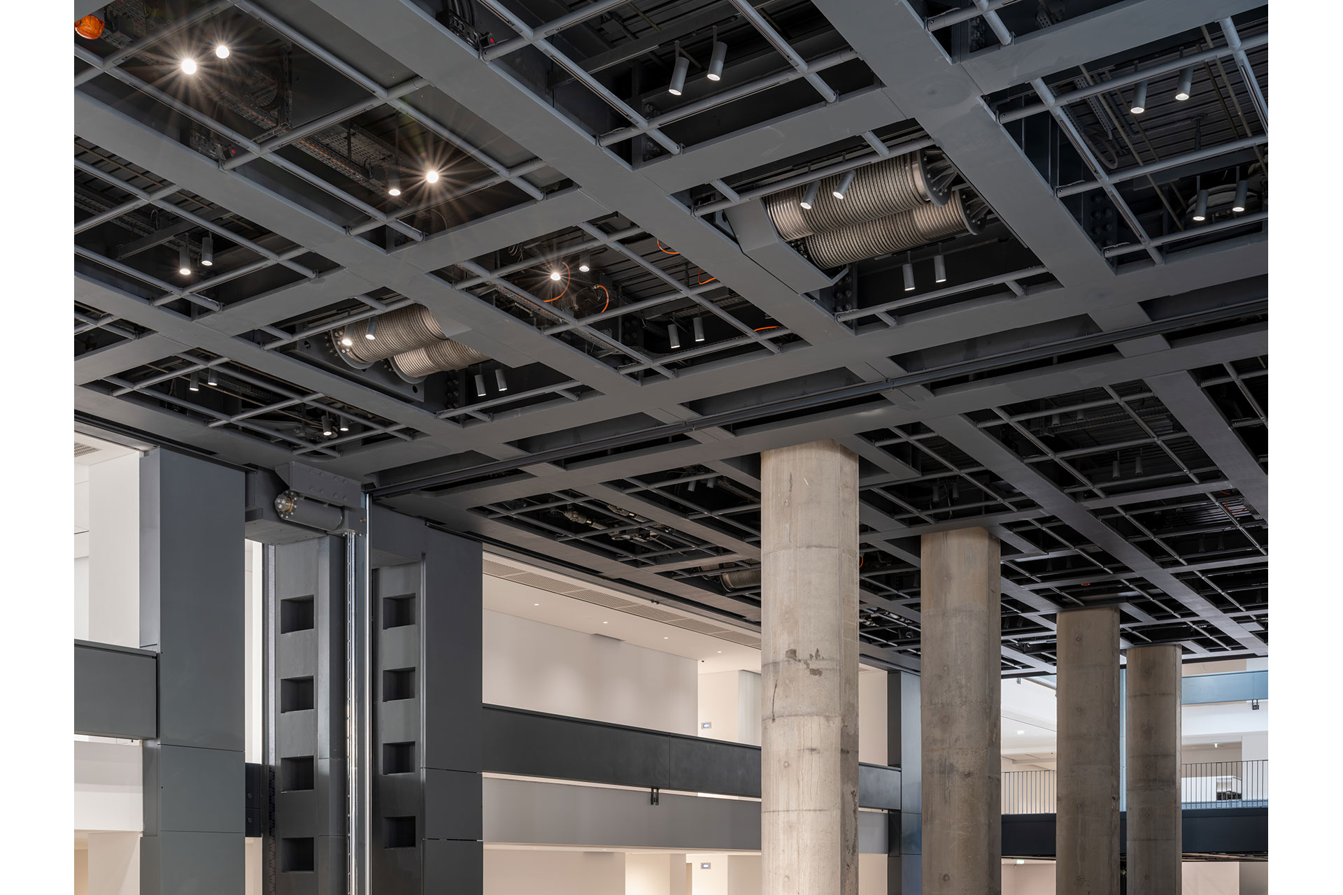 The lighting system, positioned on a grid of two meters, integrates precisely with the architect’s vision, adapts to the rhythm of the façade, and has required the development of very flexible lighting solutions. Integrated to the acoustic ceilings, the fixtures have been designed to be as discreet as possible. All downlights were developed in very small diameters without trims, customized with different optics, powers and accessories depending on ceiling heights. While these minimalist, fixed ceilings create an almost invisible, graphically integrated light recalling the transparency of shop windows and the commercial identity of the Louvre–Saint-Honoré district, the design of the mobile ceilings emphasizes their visibility. Mounted on adjustable rods, visible and integrated into the platform grid, they can adapt to a range of scenarios. The lighting grid has been doubled, with each projector operating in pairs of beams (one wide, one narrow), allowing for versatile use without multiplying the sources. Once night falls, these same movable ceilings can open up to reveal the hanging gardens highlighted by a canopy of light.