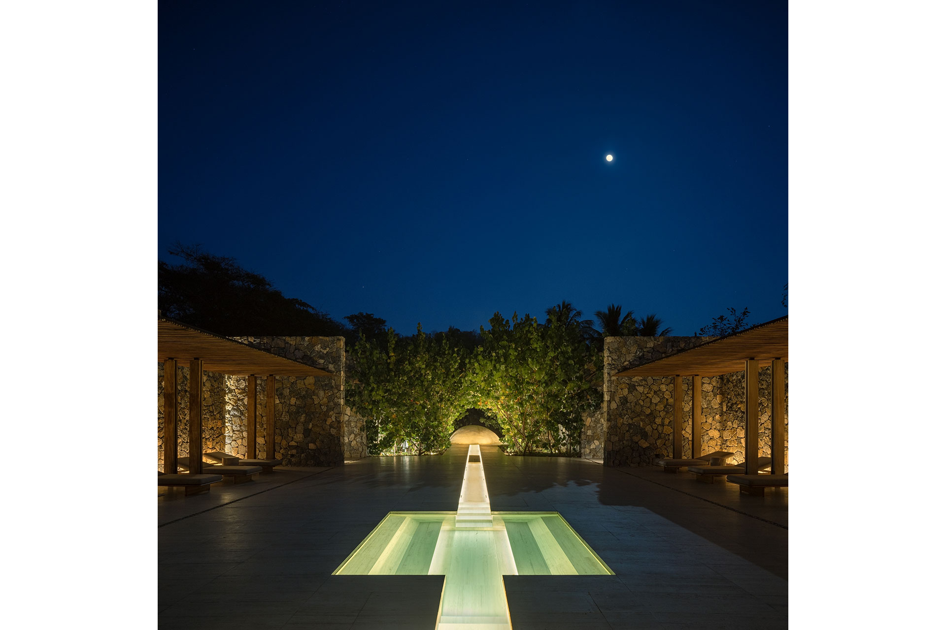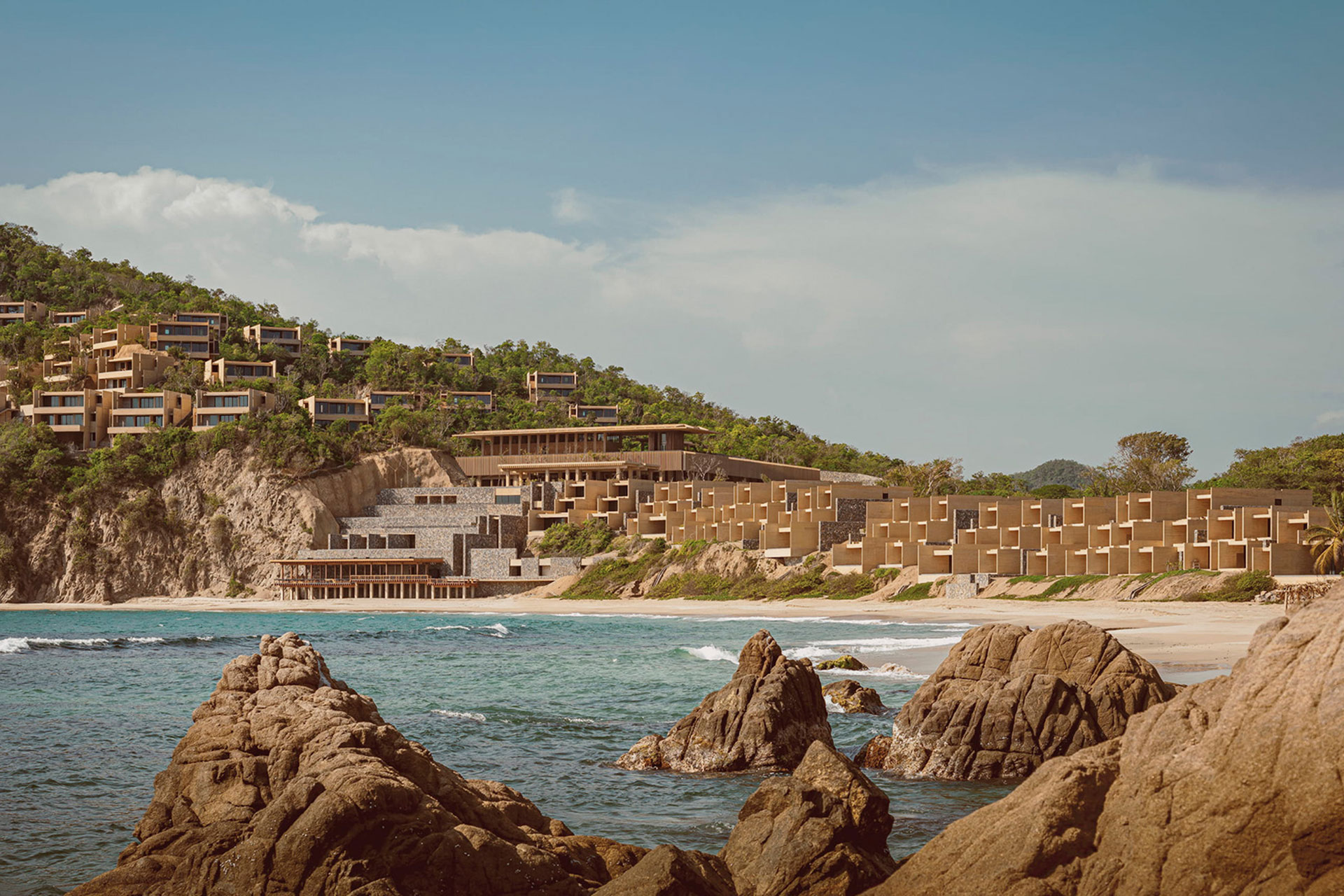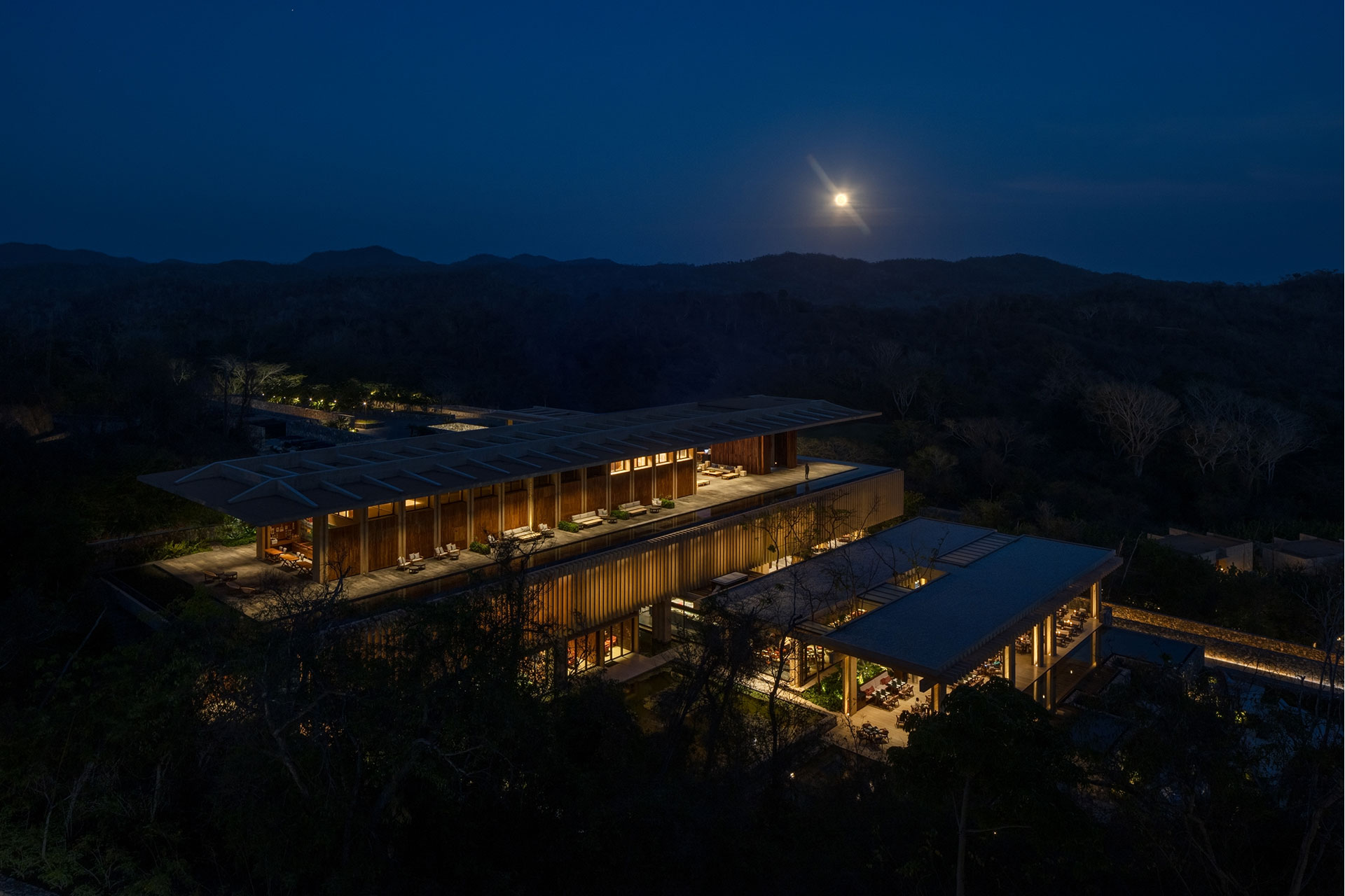 On Mexico’s Pacific coast, within a 3,000-acre reserve where jungle meets the sea, a hotel of 160 rooms and 63 villas faced a delicate challenge: achieving scale without disturbing the balance of nature or the depth of darkness. The response was an architecture that adapts rather than imposes, organized on three levels—public areas at the center, villas on the slopes above, and rooms descending gradually toward the beach.