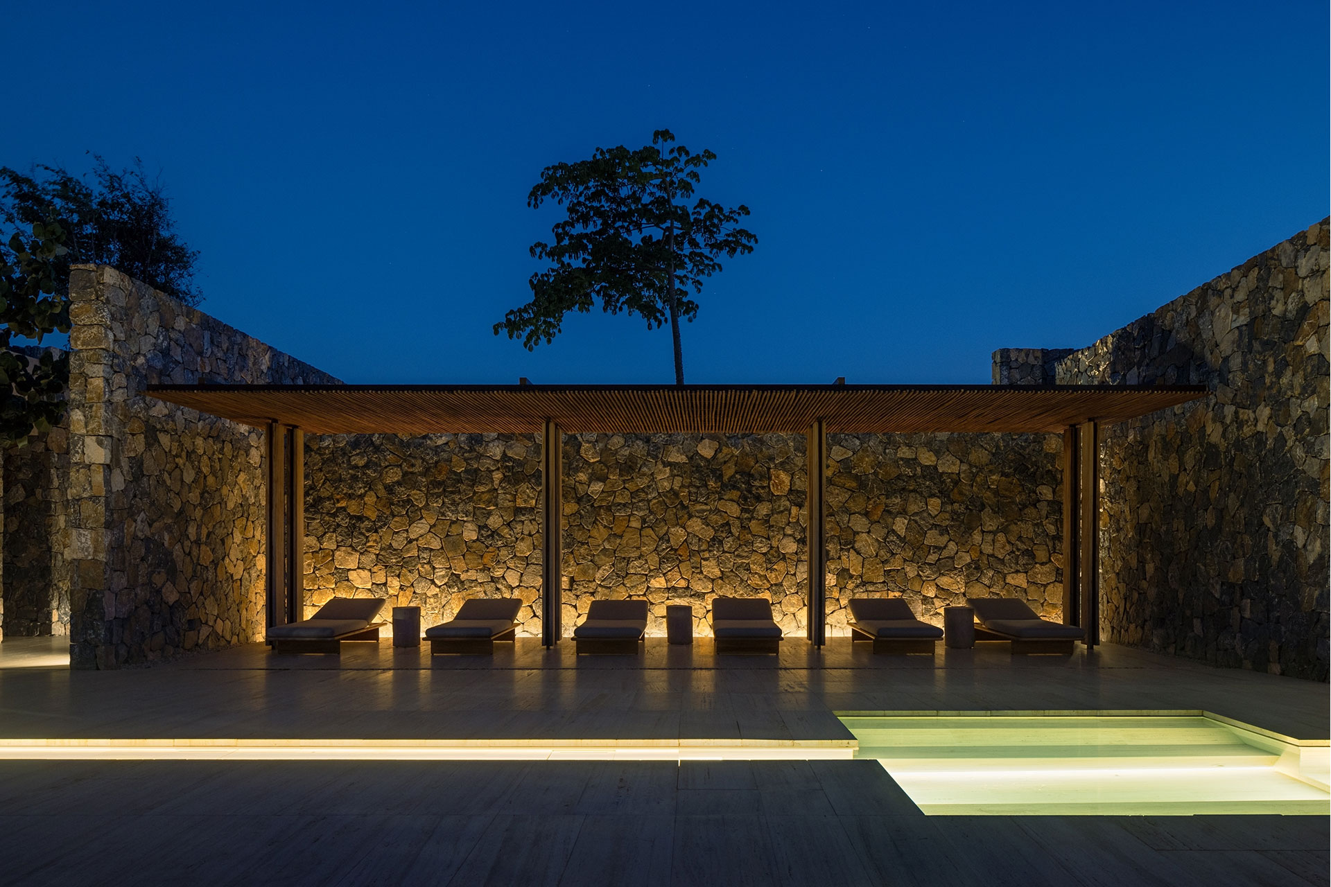 Lighting was approached as an act of restraint. The aim was not brilliance but a place where shadow takes the lead and light emerges only when essential. By day, architecture softens the intensity of the sun; by night, it contains artificial light, releasing it discreetly through recesses and voids. The façades remain silent, while interiors offer clarity and exterior spaces preserve discretion.