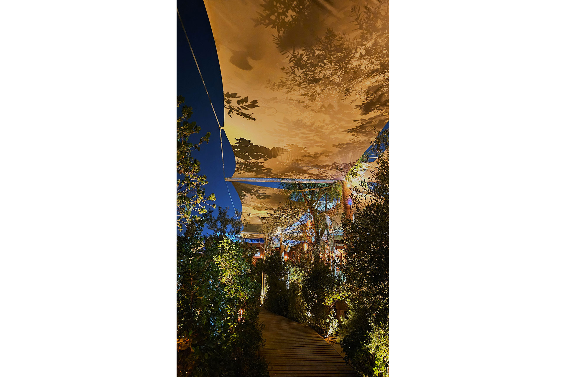 The venue unfolds across terraces, gardens, and shaded structures that remain exposed to the sky. These architectural layers are gently illuminated from below, allowing light to pass through planting and timber in quiet, shifting patterns. This approach adds depth and texture without overwhelming the space, supporting a calm transition from day into evening.
