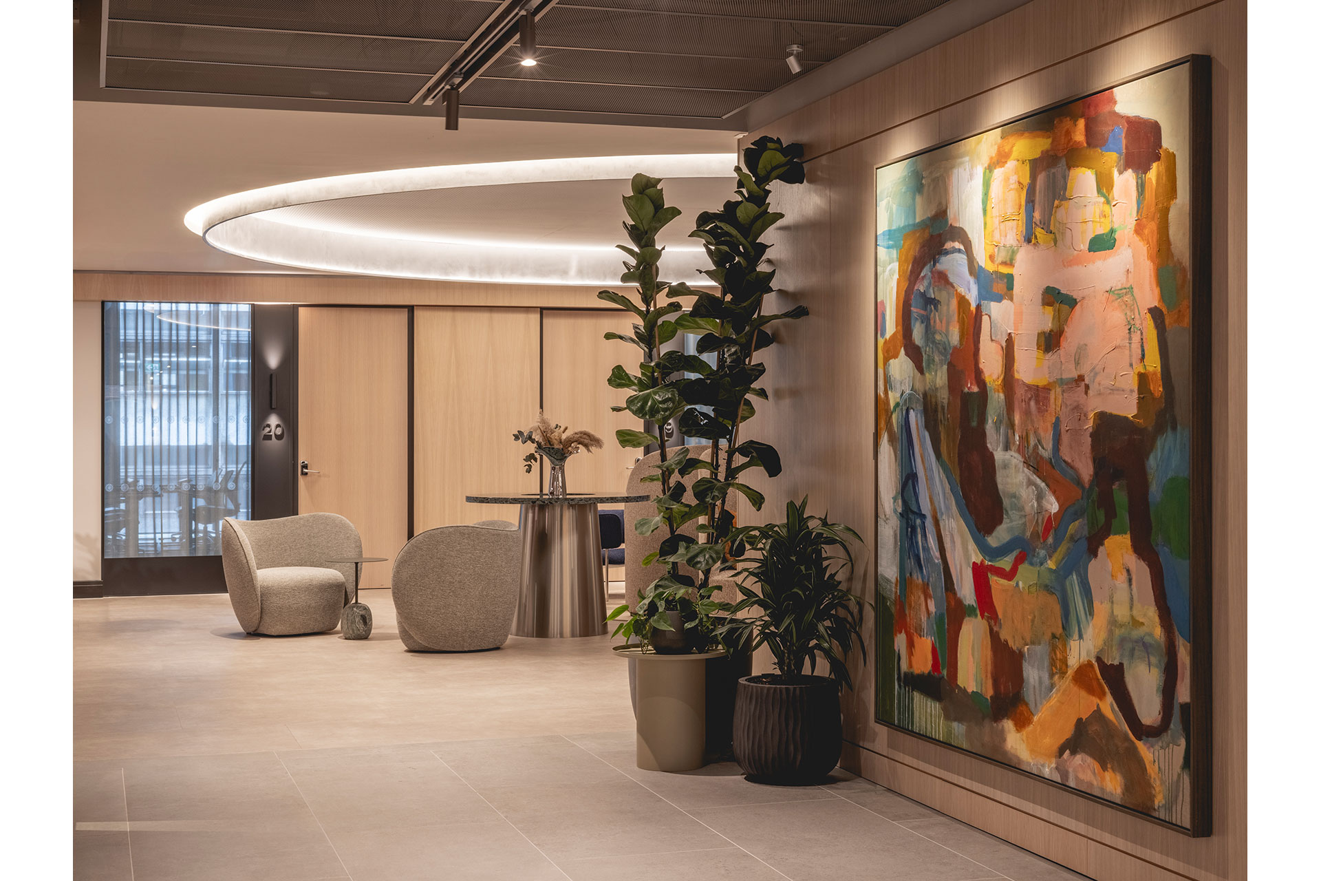 Large-scale painted canvases act as both artistic and architectural features, with colour and texture accentuated through dedicated picture lighting with high colour rendering. Beyond the artwork, walls and other vertical surfaces are selectively highlighted, adding depth, rhythm, and visual interest throughout the interior.