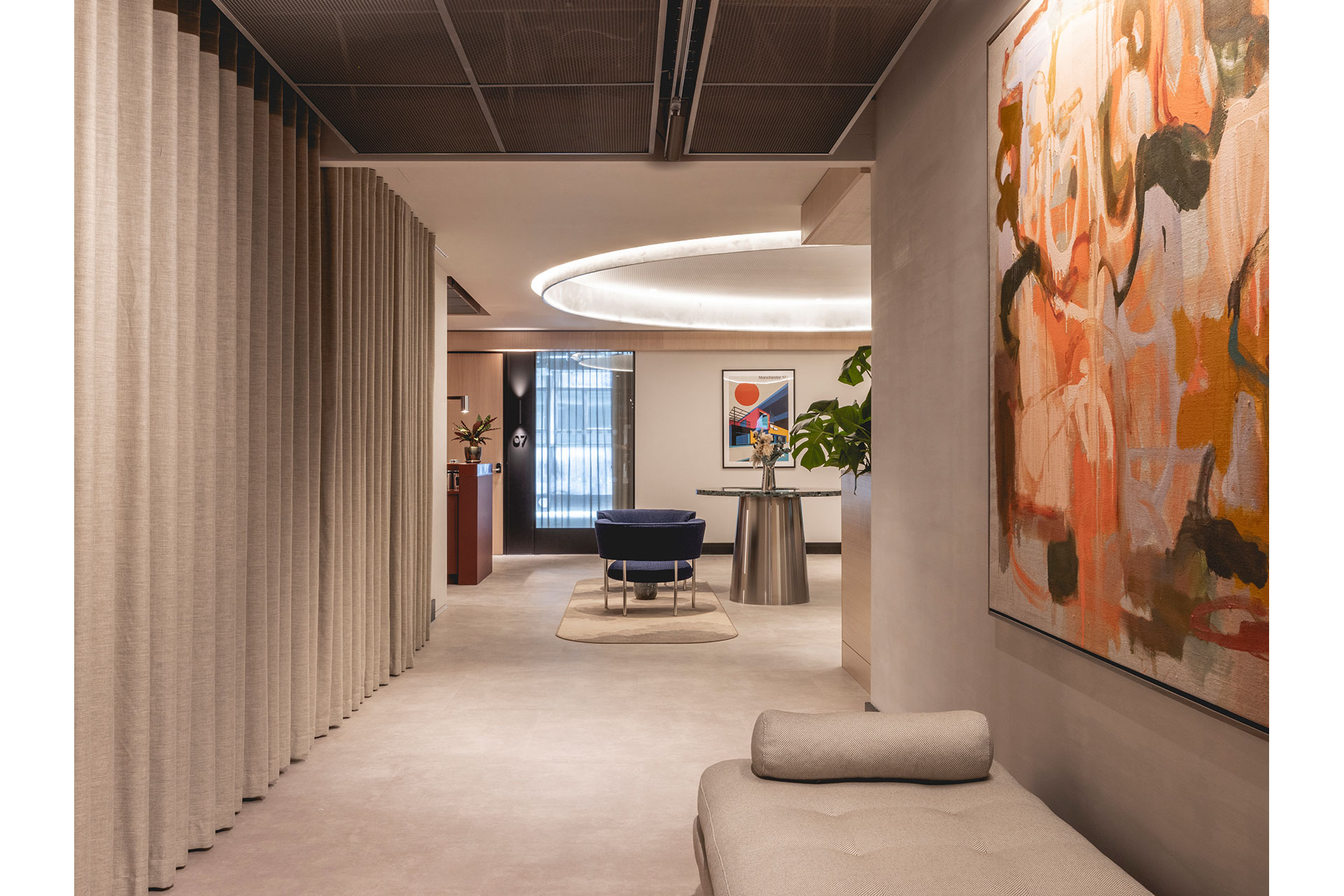 At the heart of the design are three bespoke, semi-recessed aluminium halo luminaires, each measuring six metres in diameter. These features form both a visual and functional anchor to the space. Concealed high-output LEDs trace the curves of both the inner framework and outer coffer resulting in an evenly balanced light that avoids glare while providing sufficient brightness, allowing the space to feel open and expansive. This effect is especially apparent upon arrival, as visitors pass through the double-height doors and progress along the entrance ‘catwalk’, where the space opens out revealing the main reception beyond.